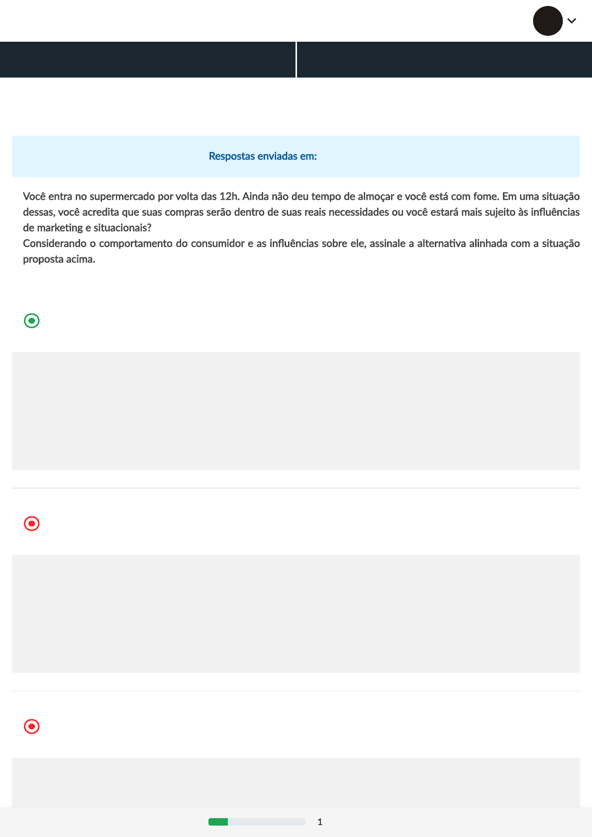 Exercícios Respostas enviadas em: 30/09/2022 10:33 1. Você entra no supermercado por volta das 12h. Ainda não deu tempo de almoçar e você está com fome. Em uma situação dessas, você acredita que suas compras serão dentro de suas reais necessidades ou você estará mais sujeito às influências de marke�ng e situacionais? Considerando o comportamento do consumidor e as influências sobre ele, assinale a alterna�va alinhada com a situação proposta acima. Resposta correta. A. A situação de estar com fome e ir às compras é caracterizada como uma influência situacional sobre o comportamento do consumidor. Ele tende a comprar maior quan�dade e muitos produtos além ou fora do que pretendia. Fome é caracterizada como uma necessidade básica do ser humano. Faz parte das necessidades fisiológicas dentro da pirâmide das necessidades de Maslow. Estar com fome é também uma influência situacional que afeta o comportamento de compra e consumo. Ir ao supermercado com fome, em geral, faz com que as pessoas comprem mais produtos do que previam inicialmente, e também faz com que acabem gastando mais por comprarem mais produtos por impulso. Além disso, o consumidor fica mais susce�vel a influências de marke�ng como promoções e degustações. Como se vê, é melhor almoçar antes de ir às compras, se você deseja economizar. Resposta incorreta. B. A situação de estar com fome e ir às compras é caracterizada como uma influência externa sobre o comportamento do consumidor. Ele tende a estar mais sujeito às promoções como ofertas, degustações e à aparência dos produtos nas gôndolas. Fome é caracterizada como uma necessidade básica do ser humano. Faz parte das necessidades fisiológicas dentro da pirâmide das necessidades de Maslow. Estar com fome é também uma influência situacional que afeta o comportamento de compra e consumo. Ir ao supermercado com fome, em geral, faz com que as pessoas comprem mais produtos do que previam inicialmente, e também faz com que acabem gastando mais por comprarem mais produtos por impulso. Além disso, o consumidor fica mais susce�vel a influências de marke�ng como promoções e degustações. Como se vê, é melhor almoçar antes de ir às compras, se você deseja economizar. Resposta incorreta. C. A situação de estar com fome e ir às compras é caracterizada como uma influência social sobre o comportamento do consumidor. Ele tende a comprar produtos socialmente aceitos como parte de uma nutrição saudável. Fome é caracterizada como uma necessidade básica do ser humano. Faz parte das necessidades fisiológicas dentro da pirâmide das necessidades de Maslow. Estar com fome é também uma influência situacional que afeta o comportamento de compra e consumo. Ir ao supermercado com fome, em geral, faz com que as pessoas comprem mais produtos do que previam inicialmente, e também faz com que acabem gastando mais por comprarem mais produtos 1 de 5 perguntas Anterior Próximo KP por impulso. Além disso, o consumidor fica mais susce�vel a influências de marke�ng como promoções e degustações. Como se vê, é melhor almoçar antes de ir às compras, se você deseja economizar. Resposta incorreta. D. A situação de estar com fome e ir às compras é caracterizada como uma influência cultural sobre o comportamento do consumidor. Ele tende a comprar produtos culturalmente associados a uma nutrição saudável. Fome é caracterizada como uma necessidade básica do ser humano. Faz parte das necessidades fisiológicas dentro da pirâmide das necessidades de Maslow. Estar com fome é também uma influência situacional que afeta o comportamento de compra e consumo. Ir ao supermercado com fome, em geral, faz com que as pessoas comprem mais produtos do que previam inicialmente, e também faz com que acabem gastando mais por comprarem mais produtos por impulso. Além disso, o consumidor fica mais susce�vel a influências de marke�ng como promoções e degustações. Como se vê, é melhor almoçar antes de ir às compras, se você deseja economizar. Você não acertou! E. A situação de estar com fome e ir às compras é caracterizada como uma influência pessoal sobre o comportamento do consumidor. Ele tende a comprar produtos de acordo com os seus gostos pessoais. Fome é caracterizada como uma necessidade básica do ser humano. Faz parte das necessidades fisiológicas dentro da pirâmide das necessidades de Maslow. Estar com fome é também uma influência situacional que afeta o comportamento de compra e consumo. Ir ao supermercado com fome, em geral, faz com que as pessoas comprem mais produtos do que previam inicialmente, e também faz com que acabem gastando mais por comprarem mais produtos por impulso. Além disso, o consumidor fica mais susce�vel a influências de marke�ng como promoções e degustações. Como se vê, é melhor almoçar antes de ir às compras, se você deseja economizar. Próximo 1 de 5 perguntas Anterior Próximo KP Exercícios Respostas enviadas em: 30/09/2022 10:33 2. A garrafa clássica de Coca-Cola, pequena e de vidro, torneada, é facilmente iden�ficada pelo olhar e pelo toque. Essa garrafa foi concebida há aproximadamente 90 anos para atender à solicitação de uma engarrafadora americana de um recipiente de refrigerante que as pessoas conseguissem iden�ficar até mesmo no escuro. O mais interessante é que, em pesquisa de mercado, os consumidores afirmam categoricamente que o sabor do produto neste �po de garrafa é muito superior ao sabor do produto quando em latas de alumínio ou garrafas PET. Considerando as influências psicológicas no comportamento do consumidor, é possível afirmar que isso ocorre porque: Você acertou! A. as pessoas têm percepções diferentes, pois corresponde à forma como as pessoas percebem a realidade em que vivem e as coisas à sua volta por meio dos sen�dos. As influências psicológicas sobre o comportamento do consumidor est