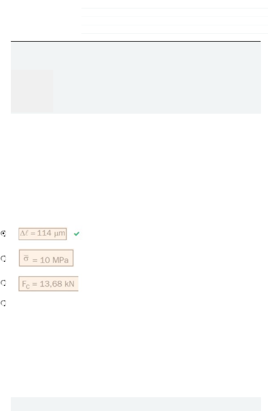 Iniciado em Tuesday, 13 Sep 2022, 16:18 Estado Finalizada Concluída em Tuesday, 13 Sep 2022, 16:22 Tempo empregado 4 minutos 29 segundos Avaliar 9,00 de um máximo de 10,00(90%) Parte superior do formulário Questão 1 Correto Atingiu 1,00 de 1,00 Marcar questão Texto da questão Uma barra de Al possui secção transversal quadrada com 60 mm de lado e o seu comprimento é de 0,8 m. A carga axial aplicada na barra é de 36 kN. Determinar a tensão normal atuante na barra e o seu alongamento. Como se pode observar, a unidade do lado da secção foi transformada em m (60 mm = 60 x 10-3 m) para que pudéssemos obter a unidade de tensão no SI N/m2 (pascal). Alongamento na barra é? Escolha uma opção: a. b. c. d. nenhuma das alternativas Questão 2 Correto Atingiu 1,00 de 1,00 Marcar questão Texto da questão A figura representa duas barras de aço soldadas na secção BB. Assinale: 1 - A deformação longitudinal 2 - O alongamento total da peça Escolha uma opção: Verdadeiro Falso Questão 3 Correto Atingiu 1,00 de 1,00 Marcar questão Texto da questão Por simetria, conclui-se que: Escolha uma opção: a. F4 = F2 = 29,6 kN b. F4 = F2 = 29,9 kN c. F4 = F2 = 30,6 kN d. F4 = F2 = 20,6 kN e. nenhuma das alternativas Questão 4 Correto Atingiu 1,00 de 1,00 Marcar questão Texto da questão Tensão normal atuante é? Resposta: Questão 5 Correto Atingiu 1,00 de 1,00 Marcar questão Texto da questão Calcule corretamente o Módulo de elasticidade do matéria e apresente o resultado em GPa. Resposta: Questão 6 Correto Atingiu 1,00 de 1,00 Marcar questão Texto da questão Pede-se determinar para a barra de deformação transversal: Escolha uma opção: Verdadeiro Falso Questão 7 Correto Atingiu 1,00 de 1,00 Marcar questão Texto da questão Marque (V) Verdadeiro ou (F) Falso: Escolha uma opção: Verdadeiro Falso Questão 8 Correto Atingiu 1,00 de 1,00 Marcar questão Texto da questão ∑ MA = 0 3 F1 sen 53° = 4 x 2,2 + 8 x 1 - 5 x 0,8 F1 = ? kN Resposta: Questão 9 Incorreto Atingiu 0,00 de 1,00 Marcar questão Texto da questão Apresente a resposta correta da área mínima da secção transversal da barra 2. Analogamente a c.2. (só será aceita a resposta completa) Resposta: Questão 10 Correto Atingiu 1,00 de 1,00 Marcar questão Texto da questão Marque a alternativa incorreta referente a essa questão: Escolha uma opção: a. b. c. d. mais de uma alternativa correta Parte inferior do formulário 15,3MPa 70 5,3 1286