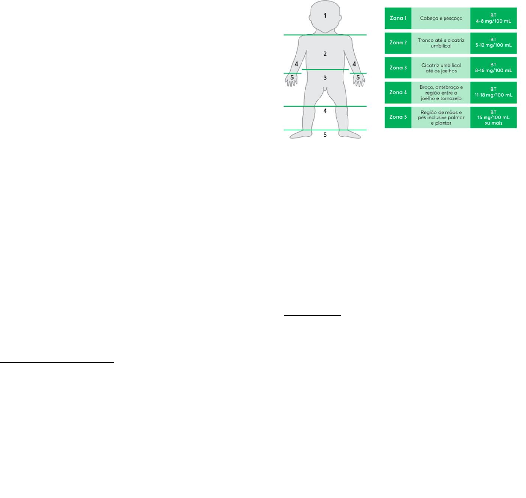 D i b e I C T E R Í C I A N E O N A T A L Definição Coloração amarelada de pele e mucosas, provocada por aumento na fração indireta de bilirrubina, ou da sua fração direta (condição menos frequente), sendo definida como a concentração sérica de bilirrubina indireta (BI) > 1,5 mg/ dL ou de bilirrubina direta (BD) > 1,5 mg/dL, desde que esta represente mais do que 10% do valor de bilirrubina total (BT). É visível na avaliação clínica quando o nível de BT sérica excede 5 mg/ dL. Epidemiologia É uma manifestação comum no período neonatal, sendo que frequentemente não tem conotação patológica. Essa condição ocorre em 60% dos RN a termo e em 80% dos pré-termo, durante a primeira semana de vida. Maior preocupação é que em níveis muito elevados, a BI pode cruzar a barreira hematoencefálica, levando a quadro de encefalopatia bilirrubinica. Fisiopatologia Metabolismo da Bilirrubina-A bilirrubina indireta (BI), é um produto da degradação do grupamento heme que deriva da hemoglobina e de outras proteínas. No sistema reticulo endotelial o grupamento heme vai ser convertido por meio de duas reações: 1. Transformação da hemoglobina em biliverdina, mediada pela hemeoxigenase. 2. Biliverdina é catalisada pela biliverdina redutase, sendo transformada em bilirrubina. O ferro liberado vai ser armazenado no baço e fígado. A BI que é lipossolúvel deixa o sistema reticuloendotelial, se liga a albumina plasmática e é carreada até o fígado. Quando chega próximo a membrana dos hepatócitos ela vai se difundir através do meio lipídico e no citoplasma volta a se ligar com uma proteína, a ligandina, que leva ela até o retículo endoplasmático liso. No REL a bilirrubina indireta vai ser convertida em bilirrubina conjugada, por meio da enzima uridilglucoroniltransferase. Ele vai ser hidrossolúvel e suficientemente polar para serem excretados pela bile ou filtrados pelos rins. Com a bile, a bilirrubina direta chega ao intestino delgado, onde em crianças maiores e adultos, é reduzida em estercobilina pela presença das bactérias da flora local e pequena quantidade vai ser desconjugada pela enzima betaglicuronidase, assim é formada novamente BI, que pode ser reabsorvida pela circulação êntero-hepática. Todo esse processo não está totalmente desenvolvido nos primeiros dias de vida, pois na vida intrauterina a bilirrubina que era produzida era eliminada pela placenta. A atividade das enzimas responsáveis pela conjugação hepática é baixa durante a vida fetal e assim continua nos primeiros dias de vida, estando em transição da forma como era eliminada na vida fetal para a forma adulta. Icterícia fisiológica Quadro comum, benigno e autolimitado. Ocorre devido a fatores que promovem maior elevação da BI. Fatores que levam a essa condição: Sobrecarga de bilirrubina aos hepatócitos- O RN produz de 2-3x mais bilirrubina do que um adulto normal, levando em consideração o seu peso. Isso ocorre pela maior quantidade proporcional de hemoglobina encontrada no RN e pelo menor tempo de vida das hemácias, que é cerca de 70-90 dias. Além disso, a reabsorção entérica também vai estar aumentada, contribuindo para a sobrecarga. Ademais, também tem a diminuição da captação e conjugação hepática, devido a sua imaturidade enzimática. QC Costuma estar presente entre o 2° e 3° dia de vida, com picos dos níveis de bilirrubina indireta entre o 2° e 4° dias de vida. Alterações que tornam necessária a avaliação de causa subjacente: ➔ Icterícia que surge nas primeiras 24 à 36h de Vida. ➔ Níveis séricos de bilirrubina que aumentam em taxa maior que 5mg/kg/dia. ➔ Níveis séricos de bilirrubina maior que 12mg/dl em RN a termo ou 14mg/dl em RN pré-termo. ➔ Icterícia persistente por mais de 10-14 dias. ➔ Aumento dos níveis de bilirrubina direta. No exame físico desse RN pode ser feita a identificação das zonas de Kramer, existe uma regra não muito precisa que relaciona os níveis de bilirrubina com a topografia da icterícia. A progressão desse quadro se faz de maneira crânio caudal. • Icterícia somente na face (zona I) – valores de BI entre 4-8 mg/dl • Icterícia desde a cabeça até a cicatriz umbilical (zona II) – valores de bilirrubina entre 5-12 mg/dl • Icterícia desde a cabeça até a raiz do joelho (zona III) – valores superiores a 15mg/dl Quadros patológicos Fatores que aumentam o risco de desenvolvimento de hiperbilirrubinemia significante na primeira semana de vida. Fatores maiores ➔ Bilirrubina sérica total ou transcutânea na zona de alto risco antes de alta hospitalar. ➔ Ictérica observada na primeiras 24h. ➔ Incompatibilidade sanguínea ou outras doenças hemolíticas conhecidas. ➔ Idade gestacional entre 35-36 semanas. ➔ Irmão com ictericia neonatal tratado com foto ➔ Céfalo-hematoma ou equimoses ➔ Aleitamento materno exclusivo, especialmente se há problemas com a amamentação e a perda ponderal excessiva ➔ Etnia asiática Fatores menores: ➔ Bilirrubina sérica total ou transcutânea na zona de risco intermediário alto antes da alta hospitalar ➔ Idade gestacional entre 37-38 semanas ➔ Icterícia observada antes da alta hospitalar ➔ Macrossomia ou mãe diabética ➔ Idade materna >25 anos ➔ Sexo masculino Etiologias e diagnóstico A investigação é norteada pela fração de bilirrubina que está aumentada, de modo que além da anamnese e exame físico devem ser solicitados: Aumento da BI: hemoglobina, hematócrito, contagem que reticulócitos tipagem sanguínea da mãe e RN e prova de Coombs direto. Aumento da BD: hemograma, AST, ALT, fosfatase alcalina, glicose, coagulograma, dosagem de alfa-1- antitripsina, pesquisa de substâncias redutoras na urina e US hepático D i b e Doenças hemolíticas Mais sugestivas quando presença de icterícia nas primeiras 24 ou 36h de vida. Elas são subdividas em dois grupos: Quadros imunomediados Sempre considerar possibi