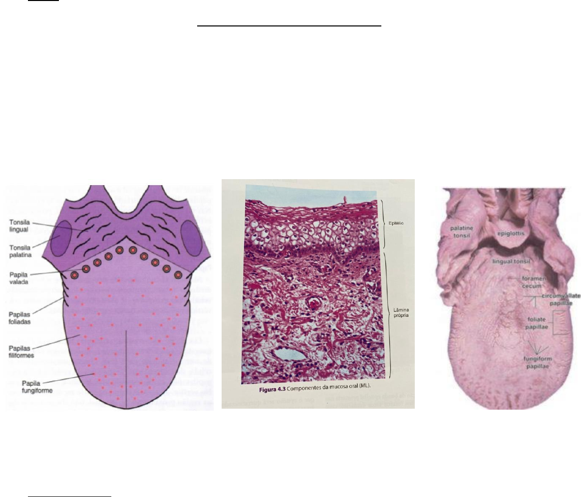 Nome: Daniele Weis Fernandes de Moura Mucosa especializada do dorso da língua. A mucosa que recobre o dorso da língua esta em atrito direto com o alimento, portanto o epitélio deve ser queratinizado, tornando o epitélio mais firme. Devido à presença de papilas, a mucosa é considerada especializada, sendo também uma estrutura sensorial, ou seja, é a responsável pela detecção do gosto, textura e temperatura. A mucosa é formada pelo epitélio do ectoderma e o conjuntivo ectomesenquimático, também chamado de lâmina própria. Existem 4 tipos de papilas: papilas filiformes, papilas fungiformes, papilas valadas e papilas foliadas. Papilas Filiformes: São mais numerosas e ocupam quase todo o dorso da língua. São elas que dão o aspecto “peludo” ou "veludado” a língua. São estruturas de formas cônica e inclinadas, apontando para trás, para a orofaringe. Tem fina sensibilidade tátil. As papilas filiformes tem o epitélio ortoqueratinizado. Tem melanócitos, que são células entre os queratinócitos do estrato basal que emitem prolongamentos dirigidos ao estrato espinhoso, trabalhando na sintetização e secreção de grânulos de melanina. Tem células de Langerhans, que são célula de aspecto dendrítico localizadas no estrato espinhoso, sendo abundantes em epitélios permeáveis. Tem ausência de botões gustativos, por isso elas tem apenas papel mecânico durante a mastigação. Tem terminações nervosas que atingem o estrato basal do epitélio dessas papilas e é por isso que elas tem a fina sensibilidade tátil. Correlação clinica: com o passar da idade, o número de papilas decresce, deixando de ser “aveludado” e sim mais brilhante. 1.Epitélio estratificado pavimentoso queratinizado 2. Submucosa 4. Queratina Papilas fungiformes: São menos numerosas que as filiformes. Encontram-se esparsas entre as filiformes. Também estão espalhadas no dorso da língua. São pontinhos redondos e rosas, que não possuem “pelinhos”. Tem o epitélio paraqueratinizado. É uma saliência no epitélio. Apresentam botões gustativos nos lados, sendo estruturas responsáveis por fornecer a gustação (sentido do gosto). Tem formato de cogumelo. No “topo” do cogumelo é onde é paraqueratinizado, e no “caule” é onde estão os botões. No centro da papila, o tecido conjuntivo é intensamente vascularizado, estando em baixo do epitélio, trazendo assim a cor vermelha. Papilas Valadas: Constituem o “V” lingual. Podem ser chamadas de circunvaladas ou calciformes. São rodeadas por um sulco circular. Se localizam na porção superior do dorso da língua. São maiores que as outras papilas. Tem formato de pétala de flor. Parecem a fungiformes, mas são mais salientes. São da mesma altura do epitélio e são circundadas por um sulco. Na parte da língua Tem uma porção central de tecido conjuntivo frouxo altamente vascularizado e inervado, revestido por epitélio. O epitélio do lado superior, o “topo” é ortoqueratinizado e não tem botões gustativos. Os botões estão nas paredes laterais do epitélio, perto do sulc circular. No fundo do sulco abrem-se ductos secretores de glândulas salivares menores, chamadas de Von Ebner. Essas glândulas são as únicas glândulas salivares menores serosas, são importantes porque secretam um liquido no fundo do sulco, limpando resto de particular e alimentos que podem obstruir os botões gustativos, Papilas Foliadas: Estão localizadas nas dobras a cada lado da borda lateral da língua, na sua região mais posterior. Tem epitélio não queratinizado. Tem botões gustativos nas paredes dos sulcos. Referências: KATCHBURIAN, Eduardo; ARANA, victor. Histologia e embiologia oral. 4ª edição. Rio de Janeiro: Granabara Koogan, 2017. Disponivel em: biblioteca UNISC. AZEVEDO, Ricardo Bentes; FABER, Jorge; LEAL, Soraya; LUCCI, Carolina. Histologia da cavidade oral. Universidade de Brasilia, novembro, 2016.