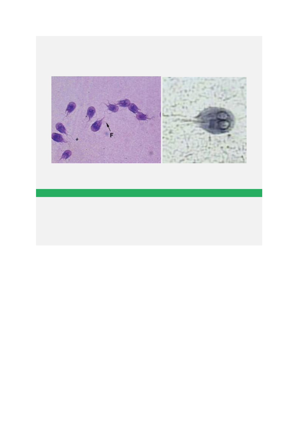Uma mãe leva seu filho ao médico e relata que ele tem apresentado um quadro de diarreia aguda por mais de três dias. O médico faz a requisição do exame parasitológico de fezes. Por se tratar de amostra diarreica, o analista clínico realiza um exame direto, e aplica coloração sobre a amostra para visualizar melhor as possíveis estruturas. O observado está disposto a seguir: Assinale a alternativa CORRETA que apresenta a identificação da estrutura: A Trofozoíto de Trichomonas sp. B Trofozoíto de Giardia lamblia. C Tripomastigota do Tripanosoma cruzi. D Promastigotas de Leishmania sp.