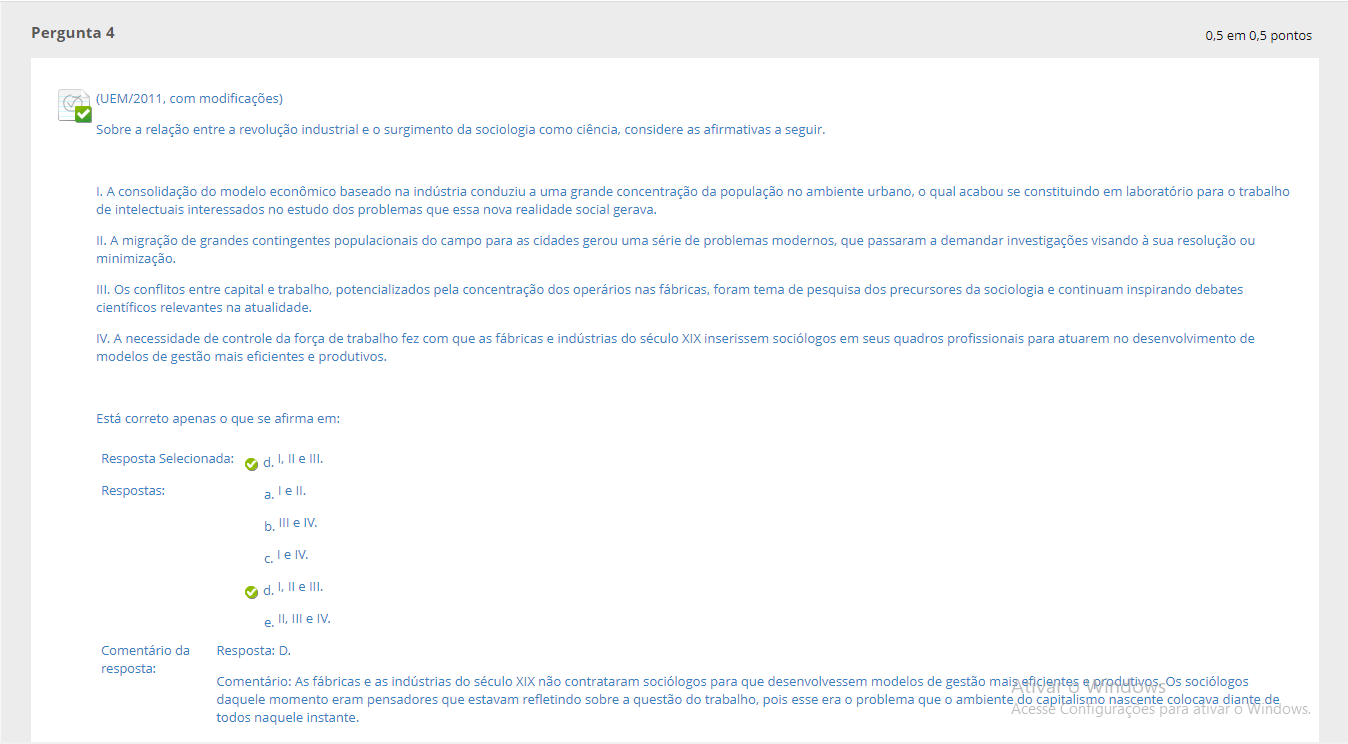 Sobre a relação entre a revolução industrial e surgimento da sociologia como ciência, considere as afirmativas a seguir. A consolidação do modelo econômico baseado na indústria conduziu a uma grande concentração da população no ambiente qual acabou se constituindo em laboratório para o trabalho de intelectuais interessados no estudo dos problemas que essa nova realidade social gerava. II. A migração de grandes contingentes populacionais do campo para as cidades gerou uma série de problemas modernos, que passaram a demandar investigações visando à sua resolução ou minimização. III. Os conflitos entre capital e trabalho, potencializados pela concentração dos operários nas foram tema de pesquisa dos precursores da sociologia e continuam inspirando debates relevantes na IV. A necessidade de controle da força de trabalho fez com que as fábricas e indústrias do século XIX inserissem sociólogos em seus quadros profissionais para atuarem no desenvolvimento de modelos de gestão mais eficientes e produtivos. Está correto apenas que se afirma em: I. A consolidação do modelo econômico baseado na indústria conduziu a uma grande concentração da população no ambiente qual acabou se constituindo em laboratório para o trabalho de intelectuais interessados no estudo dos problemas que essa nova realidade social gerava. II. A migração de grandes contingentes populacionais do campo para as cidades gerou uma série de problemas modernos, que passaram a demandar investigações visando à sua resolução ou minimização. III. Os conflitos entre capital e trabalho, potencializados pela concentração dos operários nas foram tema de pesquisa dos precursores da sociologia e continuam inspirando debates relevantes na. IV. A necessidade de controle da força de trabalho fez com que as fábricas e indústrias do século XIX inserissem sociólogos em seus quadros profissionais para atuarem no desenvolvimento de modelos de gestão mais eficientes e produtivos. a. II. b. III e IV. c. IV. d. e III. e. III e IV.