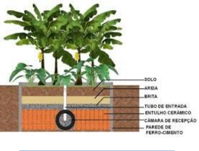 FOSSA ECOLÓGICA PASSO A PASSO O Modelo de Fossa Verde consiste na construção de uma vala de alvenaria impermeabilizada, com dimensões variáveis, apresentando uma estrutura interna em forma de câmara, onde ocorre a deposição do lodo. Essa câmara é construída com tijolos furados, por onde o esgoto é direcionado e, em seguida, passa a escoar para a parte externa dessa estrutura, preenchida por camadas de materiais porosos que servem como filtro, tais como entulho, casca de coco e material terroso, e aí são cultivadas as plantas. O processo anaeróbio que ocorre na câmara, associado ao canteiro biosséptico, decompõe a matéria orgânica proveniente do dejeto domiciliar em conjunto com a ação de micro-organismos aeróbios na zona das raízes das plantas, ao passo que a água é evapotranspirada, ou seja, não se gera efluente a ser infiltrado no solo ou encaminhado a outro pós-tratamento. Foto. https://www.google.com/search?q=fossa+verde DIMENSIONAMENTO E LOCALIZAÇÃO A área do sistema para ser calculada deverá ser multiplicada o número de moradores por 2,0 m2. Se a casa tem 4 moradores por exemplo, a metragem fica assim: 4 x 2,0 = 8,0 m2 Em ambientes de clima mais secos, a área da implantação pode ser menor e chegar a 1,5 m2 por pessoa. O formato do sistema deve ser retangular ou ovalado. A profundidade da bacia deve ser de cerca de 1,20 a 1,50m. Em relação à localização, o sistema deve ficar em uma área plana que receba bastante sol e ventilação, de preferência voltada para a face norte, que recebe mais luz ao longo do dia. O sistema também deve ficar distante de árvores e outras construções (mínimo de 1,5m) e no mínimo há 15,0m dos poços. ESCAVAÇÃO A escavação pode ser realizada com auxílio de máquinas ou manualmente. Após a realização da escavação, o solo do fundo da bacia pode ser compactado para dar maior suporte ao concreto que virá em seguida. No caso de cortes feitos por máquinas, o ideal é acertar o terreno com a enxada depois. CONSTRUÇÃO E IMPERMEABILIZAÇÃO Após a escavação é realizada a construção e impermeabilização da bacia, tanto nas laterais como no fundo. O fundo do sistema pode receber concreto (5 a 10cm de espessura) aplicado sobre uma tela de laje. As paredes podem receber blocos ou tijolos assentados com argamassa de cimento e areia (traço 1:4). Observando com o engenheiro, mestre ou pedreiro se é necessário a construção de colunas e cintas de sustentação. O piso e as paredes internas devem receber uma camada de 1,0cm de argamassa impermeável (traço 1:3) feita com aditivo impermeabilizante, dissolvido na água de amassamento. Para construir essa caixa impermeabilizada, também pode ser empregada a técnica do ferro-cimento, do super adobe ou hiper adobe que dispensam o uso de tijolos e blocos ou ser usada uma lona específica para lagos. Sendo de grande importância que não haja vazamentos para não contaminar o solo e para que o sistema funcione com eficácia. INSTALAÇÃO DA TUBULAÇÃO E PREENCHIMENTO Depois da construção e impermeabilização, é realizado o preenchimento e instalação da tubulação. A entrada do tubo de esgoto deve ser feita com tubos de PVC (100mm) diretamente no túnel de pneus. É importante instalar um T e na tubulação de entrada para a manutenção e inspeção do sistema. Os pneus devem ser alinhados e formar um “túnel”. Lembrando-se de deixar espaços entre os pneus, colocando pedaços de entulho entre eles. Se não houver pneus usados disponíveis pode ser feito com outros materiais, como blocos ou canaletas de concreto. O importante é deixar um grande espaço vazio para receber o esgoto no fundo e deixar furos ou espaços para que ele também possa sair para ser tratado. Depois de colocados os pneus, começa o preenchimento com entulho “limpo” (camada de 50-60 cm). Podem ser usadas telhas de barro antigas, cacos de bloco ou tijolo, pedaços de concreto. Não deve ser utilizado material muito fino e sujo (restos de argamassa e cimento, papelão, madeira, etc). Se não houver entulho disponível, pedras grandes poderão ser utilizadas. A camada de entulho deve ser suficiente para cobrir os pneus. Depois do entulho vem uma camada de brita 01 ou 02(20-30cm), pedrisco fino ou areia grossa (10- 20 cm) e depois terra (20- 30cm). Na camada de entulho e brita vão se desenvolver bactérias e outros seres vivos que vão tratar o esgoto que entra pelo fundo da fossa ecológica e vai subindo pelas camadas até chegar nas bananeiras. Na parte de baixo devem ficar pedaços maiores para dar bastante espaço ao esgoto que entra na fossa verde através dos pneus. As camadas de cima (brita, pedrisco ou areia) são mais finas para funcionar como um filtro natural. Antes de colocar a terra no sistema, deve ser instalado um tubo dreno (cano pvc 50mm, furado e envolto por sombrite). Este tubo vai drenar para fora do sistema a água que se acumular quando chover demais ou quando o sistema receber muito esgoto de uma só vez. O dreno deve encaminhar este excedente para um Círculo de Bananeiras que será explicado em detalhes depois. PLANTIO Depois do preenchimento das camadas da fossa verde, será realizada a plantação das bananeiras, sendo plantada uma muda de banana para cada 1,0 m2 do sistema. Também podem ser plantadas taiobas, mamoeiro, lírio do brejo e outras plantas que gostem de um ambiente com muita água. É de grande importância fazer a cobertura do solo com palha ou folhas secas, para reduzir a entrada de água da chuva no sistema. Também é importante que a camada final de terra fique distribuída em formato de “montanha”, ou seja, mais alta no centro da fossa verde e mais baixa nas laterais, permitindo assim que a água da chuva possa escorrer para fora e não empoçar. REFERENCIA BIBLIOGRÁFICA COELHO, C.F.; Reinhardt, H.; Araújo, J.C.. Fossa verde como componente de saneamento rural para a região semiárida do Brasil. Universidade Federal do 