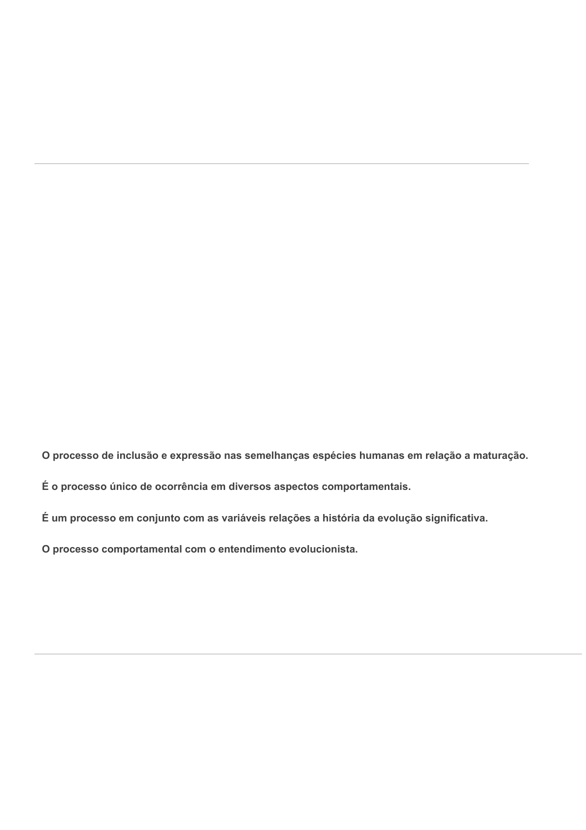 02/10/2022 20:04 Comentários https://sereduc.blackboard.com/ultra/courses/_127792_1/outline/assessment/_6421170_1/overview/attempt/_21598167_1/review/inline-feedback… 1/7 Conteúdo do exercício Ocultar opções de resposta Comentários Pergunta 1 0 / 0 A linguagem que é apresentada a uma criança faz com que ela identifique os aspectos importantes do mundo daqueles que não o são, facilitando a “organização” que a pessoa faz do mundo. Portanto o processo de linguagem é: Resposta correta É um dos processos mais importantes pelos quais uma pessoa passa a interagir com o mundo. O processo de inclusão e expressão nas semelhanças espécies humanas em relação a maturação. É o processo único de ocorrência em diversos aspectos comportamentais. É um processo em conjunto com as variáveis relações a história da evolução significativa. O processo comportamental com o entendimento evolucionista. Com o processo de linguagem, a criança passa a agir de maneira diferenciada em relação ao mundo no qual se insere, em um processo pelo qual é evidenciada a natureza social do desenvolvimento humano. Pergunta 2 0 / 0 02/10/2022 20:04 Comentários https://sereduc.blackboard.com/ultra/courses/_127792_1/outline/assessment/_6421170_1/overview/attempt/_21598167_1/review/inline-feedback… 2/7 Ocultar opções de resposta Comentários Ocultar opções de resposta Comentários Aprendizagem é um substantivo que faz referência a algo restrito, é por isso que analistas do comportamento utilizam o verbo “aprender”, que faz referência a um processo. Mas o que é aprender? É um conceito que implica na caracterização de texto. Resposta corretaÉ um processo no qual aquele que aprende apresenta um novo comportamento. É um aspecto de forma de sequenciação de hipóteses instrumentais. É o desenvolvimento universal da apresentação de testes. É a posição lógica que interfere na resolução de determinadas relações. Aprender é um processo no qual aquele que aprende apresenta um novo comportamento, ou seja, que não era capaz de exibir anteriormente. O conjunto de comportamentos que uma pessoa é capaz de apresentar é denominado “repertório comportamental”. Pergunta 3 0 / 0 O conceito de aprendizagem não é consenso, pois o conhecimento acerca de qualquer fenômeno é produzido de diferentes formas, que são processos de conhecer, como ciência, arte, senso comum, entre outros. Como muitos outros fenômenos, a aprendizagem é estudada em contextos distintos e sob influência de diferentes aspectos, por isso, temos concepções diversas acerca do que é aprendizagem. Mas segundo o dicionário, como é a definição de aprendizagem? Produção Educação Gravação Aceitação Resposta corretaAprendizado 02/10/2022 20:04 Comentários https://sereduc.blackboard.com/ultra/courses/_127792_1/outline/assessment/_6421170_1/overview/attempt/_21598167_1/review/inline-feedback… 3/7 Ocultar opções de resposta Comentários Ocultar opções de resposta No dicionário, consta como definição de aprendizagem “aprendizado”, que, por sua vez, é o “ato ou efeito de aprender”. Pergunta 4 0 / 0 Segundo Skinner o que caracteriza aquilo que faz um professor, mostra que aquele que ensina não é apenas um modelo, mas alguém que apresenta comportamentos com certas características para que ocorra a aprendizagem de outra pessoa. Portanto, o que caracteriza o processo de ensinar? Desenvolvimento em forma de sequenciarão e precisão Produção concreta na construção de consenso sócio-histórico Resposta corretaMudanças ocorridas no comportamento do aprendiz. Funções psicológicas em processos desorganizados. Condições na transformação de níveis sociais. O ensino se define pelas mudanças ocorridas no comportamento do aprendiz, pois não há ensino, portanto, se não existe aprendizagem. Pergunta 5 0 / 0 A zona de desenvolvimento proximal, consiste em um fato consensual no senso comum: avaliar o aprendizado de uma criança envolve simplesmente avaliar o que a criança já é capaz de fazer sozinha. Como Vygotsky denomina a descoberta desse processo? Desenvolvimento surreal 02/10/2022 20:04 Comentários https://sereduc.blackboard.com/ultra/courses/_127792_1/outline/assessment/_6421170_1/overview/attempt/_21598167_1/review/inline-feedback… 4/7 Comentários Ocultar opções de resposta Comentários Construção de esquemas. Resposta corretaNível de desenvolvimento real. Falta de clareza. Formação social da mente. Vygotsky denomina a descoberta desses processos de “nível de desenvolvimento real”. Mas, para ele, esse é um dado secundário do desenvolvimento de uma criança, pois o dado mais importante são os processos que a criança passa a realizar com auxílio de outras pessoas. Pergunta 6 0 / 0 Vygotsky não estava inicialmente interessado em elaborar uma teoria do desenvolvimento infantil, pois a infância é um meio para entender e explicar o comportamento humano em geral, e tal período, segundo autor, corresponde à pré-história do desenvolvimento cultural, pois é nele que ocorre o desenvolvimento da fala e do uso de instrumentos. Ele enfatiza justamente o papel da cultura no desenvolvimento da criança, o que vai ao encontro da teoria dialético-materialista de Karl Marx. Durante o governo Stalin (1922-1953), as teorias de Vygotsky foram consideradas: Autoritárias Indecisas Expiatórias Resposta corretaIdealistas Injustas Durante o governo Stalin (1922-1953), as teorias de Vygotsky foram consideradas “idealistas” pelas autoridades soviéticas. A partir de 1932, suas obras começaram a receber críticas por conta desses “ideais”. A defesa de que o homem é influenciado pelo meio e que também o influencia, não agradava os adeptos de Stalin. 02/10/2022 20:04 Comentários https://sereduc.blackboard.com/ultra/courses/_127792_1/outline/assessment/_6421170_1/overview/attempt/_21598167_1/review/inline-feedback… 5/7 Ocultar opções de resposta C