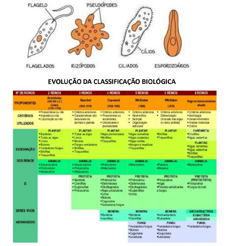 Zoologia I 1. Protistas - GERAL: Zoologia ou Biologia Animal é o ramo da ciência que se dedica ao estudo dos animais: • Morfologia externa e interna; • Sistemas funcionais e sua fisiologia; • Ecologia; • Comportamento; • Relações evolutivas; • SIEBOLD (1845): Protozoa – “Animais sem uma distinção clara dos diferentes sistemas orgâncios, cuja variada forma e organzação simples pode ser reduzida a uma única célula”. • PASTEUR (1806): Fim da teoria da geração espontânea. • HOGG (1861): Proposição dos Protoctistas. • HAECKEL (1866): Proposição dos Protistas (Protozoa + Protophyta) • WITTAKER (1969): Sistema de cinco reinos – Protista (neo-hackeliano) • WITTAKER e MARGULIS (1978): Sistema de seis reinos – ArcheoBacteria e Monera; Protoctista; Fungi; Animalia e Plantae; • ATUALMENTE: Protista, Protoctista e Protozoa. • CAVALIER-SMITH (2003): Bacteria; Protozoa; Animalia, Fungi, Plantae e Chromista; Sistemática: • Até 1960: Baseada nas organelas locomotoras – Mastigophora; Sarcodina; Ciliophoda e Sporozoa; • Levine (1980): Sarcomastigophora; Labyrintomorpha; Apicomplexa; Microspora; Ascetospora; Myxospora; Ciliphora (Sub-Reino Protozoa); • Sleigh (1989): 17 filos (Protista) • Corliss (1991): 38 a 45 filos (Protista) • Margulis e Schwartz (1998): 30 filos (Protoctista) • Brusca e Brusca (2008): +- 20 filos (Protista) Origem: • Origem polifilética? • Protistas = primeiras células eucarióticas Teorias: Invaginação de Membrana / Endossimbiose de Procariontes Aspectos Gerais: • Unicelilar • Fomas variadas • Formas solitárias e coloniais • Habitat: Dulcícolas, Marinhos e no solo; Comensalismo; Mutualismo e parasitismo; • Tamanho microscópico: 2 nanômetros até 1-5 mm • Membrana Citoplasmática “Película”: Reconhecimento e seleção do alimento e parceiro sexual; Proteção nas lesões mecânicas e ação de anticorpos: Locomoção; • Produtos extracelulares: Parede celulósica; Escamas ou Espinhos aderentes; Tecas e Lóricas (Proteínas ou Mucopolissacarídeos, Sílico segregado) • Citoplasma: Endoplasma e Ectoplasma Organelas Citoplasmáticas: Sistema de Membrana endocelulares (Intracelulares): • Retículo citoplasmático (Liso e Rugoso) • Complexo Lameloso • Lisossomos • Mitocôndria (Produção de energia; DNA; Autoduplicação) • Hidrogenossomos • Peroxissomos • Glioxissomos • Cloroplasto Elementos Fibrilares e Microtubulares: • Citoesqueleto • Proteínas contráteis: Actina e Miosina • Estruturas Locomotoras • Undulipódios: Cílios e Flagelos • Pseudópodos: Movimentos amebóides Movimentos: • Flagelados • Ciliados • Pseudópodos • Esporozoários Vacúolo Contrátil: • Osmorregulação • Presente em todas as formas • Associados à regiões mais internas de ectoplasma • Posição fixa • Vacuólo + ampolas + canais radiais • Elementos fibrilares contráteis: Mircrotúbulos • Contração por auto-estimulação Vacúolo Digestivo: • Fagossomo + Lisossomo • Digestão Intracelular • Vacúolo residual • Citoprocto Nutrição: • Heterótrofos: Osmótrofos ou saprozóicos; Fagótrofos ou Holozóicos • Autótrofos: Holofíticos • Mixótrofos ou Anfítrofos: Nutrição autótrofa e heterótrofa • Parasitas: Saprozóicos ou Holozóicos Fenômenos Reprodutivos: • Reprodução Assexuada: Fissão Binária (Brotamento/Cistos); Fissão Múltipla ou esquizogonia • Reprodução Sexuada: Formação de Gametas; Conjugação; Autogamia; 1.1 Protistas Ciliados - (Grupo Monofilético) • Maior grupo de protistas – 8.000 espécies • Tamanho: 10 micrômetros a 3mm ou mais • Maioria não possui cor • Organelas Locomotas: Cílios • Sistema Infraciliar (Cílio atravessa saco alveolar) • Dualismo nuclear: Macronúcleo (1) e Micronúcleo (vários) • Fissão Transversal • Reprodução sexuada sem formação de gametas livres (Conjugação) • Dulcícolas e Marinhos (Vida livre) • Ecto e Endocomensais • Parasitas (Poucas espécies) Forma e Estrutura: • Constante e assimétrica (Pode haver simetria radial e bilateral) • Isolados ou Coloniais • Lórica (Matriz orgânica gelatinosa – Muco): Secretora ou com material estranho aderido(Grãos de areia)/ Fixa ao substrato ou transportada • Ciliatura: Somática e Oral Parede Corporal - Película: • Membrana Citoplasmática – Unidade de Membrana • Alvéolos (Estabilidade e Permeabilidade) • Cílios – Centro dos Alvéolos: Sistema Infraciliar - Cinestossomo + Cinetodesmos = Cinetídeo - Cinécia = Filerira Cinetídeos • Extrusomas: Tricocistos (filamentos compridos e finos que podem ser ejectados em resposta a certos estímulos), Toxicistos (Produção de toxinas), Mucocistos (Produção de mucos), Haptocistos Locomoção: • Agéis e rápidos • Derecção de estímulos externos: mediada por cílios • Direção e intensidade do movimento: controlada por íons cálcio e potássio • Cirros: Cílios concrescidos (que crescem juntos) • Pedúnculo (sésseis): Mionemas (filamentos musculares – passíveis de retração) • Batimento ciliar: Não é aleatório e nem sincrônico – Ondas Metacrônicas (movimento sequenciado – comos se fosse as ondas do mar) Alimentação: • Heterótrofos Holozóicos (Fagocitam) • Cistóstoma (Boca ceular) • Citofaringe (constituída de microtúbulos que reforçam a região onde o fagossomo é formado) • Citoprocto (ânus celular onde os vacúlos residuais eliminam seu conteúdo) • Pode ocorrer: - Vestíbulo (Ciliatura somática); - Câmara pré-oral (Organelas Ciliares Compostas – Membrana ondulante e Menbranela) • Hábito alimentar variado: Predadores, Herbívoros, Saprófitas Balanço Hídrico: • Vacúolos contráteis: Osmorregulação • Presente em todas as formas • Associados a regiões mais internas de Ectoplasma • Posição fixa • Vacúolo + Ampolas + Canais Radiais • Elemenos fibrilares contráteis: Mic