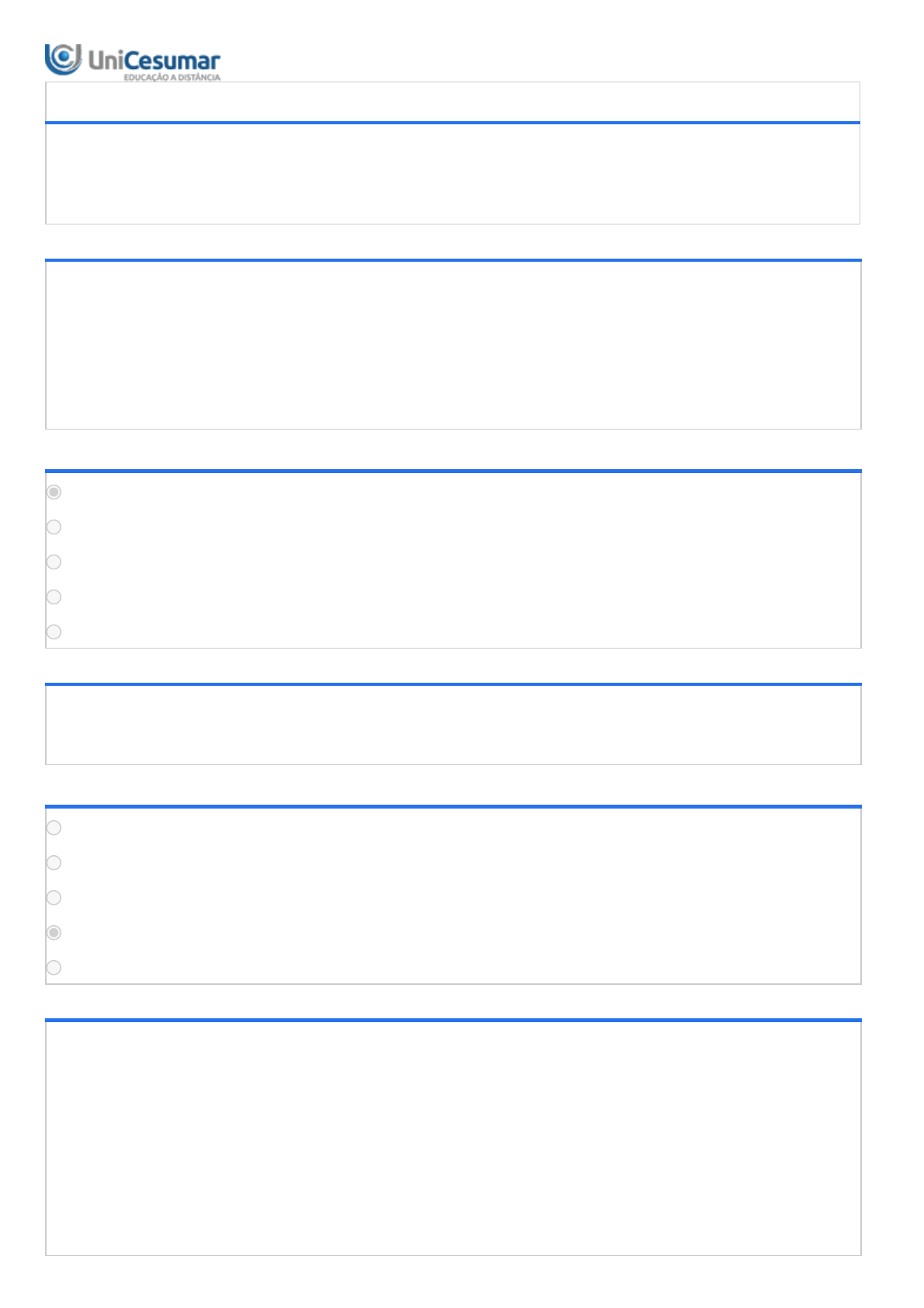 8/9/22, 11:52 PM Unicesumar - Ensino a Distância 1/3 ATIVIDADE 2 - NUT - AVALIAÇÃO NUTRICIONAL - 53/2022 Período:08/08/2022 08:00 a 26/08/2022 23:59 (Horário de Brasília) Status:ABERTO Nota máxima:0,50 Gabarito:Gabarito será liberado no dia 24/09/2022 00:00 (Horário de Brasília) Nota obtida: 1ª QUESTÃO O exame físico deve ser realizado de forma sistemática e progressiva, ou seja, a partir da cabeça até a região dos pês e muitas vezes, permite identificar carências nutricionais ou o desenvolvimento de alguma patologia. O bócio é determinado pela hipertrofia da glândula tireoide. Dentre as crenças por trás das possíveis causas para o surgimento do bócio temos: propriedades e características da água, desnutrição, pobreza, alcoolismo, dentre outros. De acordo com o quadro clínico citado, assinale a alternativa que apresenta o micronutriente que encontra-se deficiente nos casos de bócio: ALTERNATIVAS Iodo. Cálcio. Magnésio. Selênio. Ferro 2ª QUESTÃO No Recordatório de 24 horas o investigador propõe ao indivíduo recordar e descrever todos os alimentos e bebidas ingeridas no período prévio de 24 horas. A partir deste tema, analise as opções abaixo e assinale a alternativa correta que apresenta uma limitação deste método: ALTERNATIVAS O entrevistado deve ter algum grau de instrução. Resultados de um único dia não expressam a dieta usual do indivíduo. Requer maior grau de cooperação do entrevistado do que outros métodos. Tempo de levantamento dos dados é demasiadamente longo. Os índices de resposta são relativamente baixos. 3ª QUESTÃO A solicitação de exames laboratoriais faz parte da prática clínica do nutricionista e está prevista pela Lei Federal 8234/91 em seu artigo 4º, Resolução CFN nº 306/03, Resolução CFN nº 380/05 e Resolução CFN nº 417/08. Fonte: CASTRO, Lorena dos Santos. Avaliação Nutricional. Maringá: UniCesumar, 2022. p. 89. O fígado é considerado o órgão central do metabolismo, doenças hepáticas agudas ou crônicas podem ser decorrente de lesões no parênquima hepático provocadas por agentes químicos, virais, farmacológicos ou por outros componentes tóxicos que alteram a estrutura morfológica e a capacidade dos hepatócitos. A partir deste tema, analise as opções abaixo e assinale a alternativa correta que contemplam os exames utilizados para uma avaliação bioquímica da funcionalidade hepática: 8/9/22, 11:52 PM Unicesumar - Ensino a Distância 2/3 ALTERNATIVAS Ferro total, ferritina, transferrina e vitamina B12. Bilirrubina direta, bilirrubina indireta, proteínas e TSH. Colesterol, HDL, triglicerídeos e LDL. Uréia, creatinina, gama-GT, ácido úrico e ferro total. AST, ALT, gama-GT e bilirrubinas. 4ª QUESTÃO O Índice de Massa Corporal (IMC) é utilizado na avaliação nutricional de adultos, e a relação cintura/quadril (RCQ) como indicador de deposição de gordura abdominal, com poder de predição de doenças metabólicas crônicas. A partir deste tema, avalie as opções abaixo e assinale a alternativa correta que apresenta a classificação do estado nutricional, segundo o cálculo do IMC de uma mulher de 47 anos, com 1,58 m de estatura e 72 Kg de peso que apresenta a R:C/Q igual a 0,88: ALTERNATIVAS Sobrepeso, sem indicativo de risco cardiovascular. Normal, com indicativo de risco cardiovascular. Obesa, com indicativo de risco cardiovascular. Obesa, sem indicativo de risco cardiovascular. Sobrepeso, com indicativo de risco cardiovascular. 5ª QUESTÃO 8/9/22, 11:52 PM Unicesumar - Ensino a Distância 3/3 A avaliação do consumo alimentar é um método utilizado para avaliar o estado nutricional, sendo que está estritamente associado ao prognóstico de possíveis patologias, portanto é fundamental a colaboração do entrevistado. DUARTE, A. C. G. Avaliação Nutricional: aspectos clínicos e laboratoriais. São Paulo: Atheneu, 2007. A história alimentar ou dietética tem como finalidade coletar dados subjetivos de indivíduos e populações por meio da avaliação da ingestão alimentar de forma qualitativa e/ou quantitativa, possibilitando estudar a relação entre alimentação e doença, identificar indivíduos ou grupos em risco nutricional, direcionar a prescrição dietética e monitorar a intervenção nutricional. Sobre os diversos métodos disponíveis para avaliar a história alimentar, analise as afirmativas abaixo e assinale (V) para VERDADEIRA e (F) para FALSA para as afirmações I, II, III e IV respectivamente. I - O Registro Alimentar, depende da memória do paciente, além disso a confiabilidade dos registros é questionável, pois pode influenciar no padrão alimentar usual do individuo. II - O Recordatório de 24 horas (R24h) consiste em definir e quantificar todos os alimentos e bebidas consumidos nas últimas 24 horas anteriores à entrevista. Este deve ser um dia típico, a fim de tornar o relato do entrevistado mais próximo e real da sua alimentação atual. III - O questionário de frequência alimentar (QFA) trata-se de listas de alimentos ou grupos de alimentos. Nelas, há a anotação da frequência em que os alimentos são consumidos em um dado período de tempo. Além disso, pode ser benéfico quando considerado em associação com os métodos de análise da ingestão usual. IV - O Recordatório de 24 horas (R24h) pode ser aplicado a indivíduos de diferentes faixas etárias, como também àqueles com baixo nível de escolaridade. Além disso, esse tipo de inquérito alimentar tem a vantagem de não requerer o treinamento do pesquisador (entrevistador). Assinale a alternativa que representa a ordem correta da classificação de V ou F para as afirmativas: ALTERNATIVAS V, V, F, F. V, F, V, V. F, V, F, V. F, V, V, F. V, V, V, F.