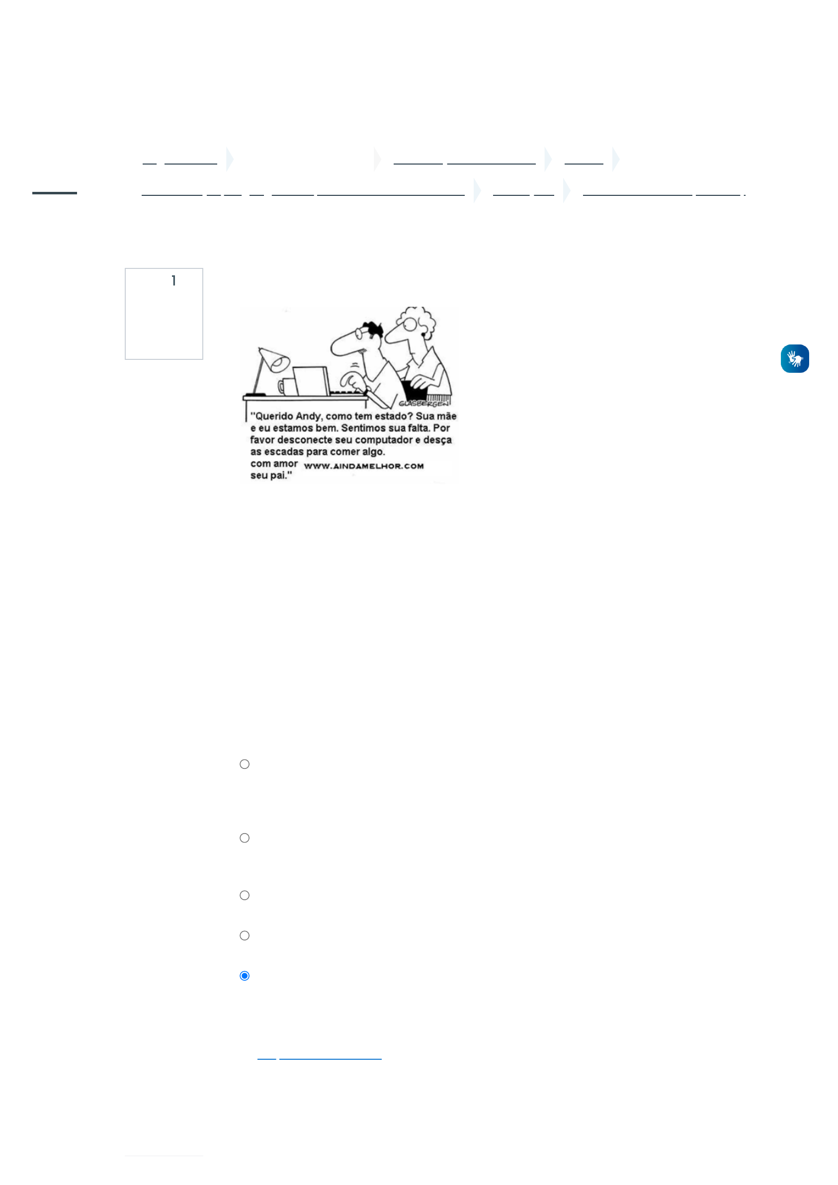 18/09/2022 17:07 P1 -- Prova On-line (Acessar) https://ava.candidomendes.edu.br/moodle/mod/quiz/attempt.php?attempt=251957&cmid=330455 1/7 ... Página inicial Disciplinas e Espaços GRADUAÇÃO A DISTÂNCIA 2022-3 Comunicação, Linguagem e Expressão - 2022_03_EAD_A Avaliações P1 -- Prova On-line (Acessar) Questão 1 Ainda não respondida Vale 1,00 ponto(s). Analise a charge abaixo para responder à questão: (Disponível em: http://geointocaveis.blogspot.com.br/p/charges-e- quadrinhos.html) Interpretar um texto é desvendar seus significados, suas mensagens, pois todo discurso pretende comunicar algo. Nossa capacidade de interpretação é aperfeiçoada paulatinamente, a partir de nossos hábitos de leitura. Logo, o enriquecimento do vocabulário, o senso crítico, o domínio das estruturas linguísticas, a interpretação textual, tudo isso é resultado das leituras que fazemos ao longo da vida. A partir da leitura da charge acima e de acordo com os conhecimentos adquiridos no estudo desta disciplina, podemos afirmar que o texto faz uma crítica: Escolha uma opção: Aos dramas das famílias modernas, que, por suas reclamações acerca do uso excessivo do computador, são responsáveis pela diminuição do ritmo do progresso tecnológico dos filhos. Às relações entre alguns pais e filhos na atualidade, em que ambas as partes têm preferido manter relações virtuais. À atitude dos pais modernos que fiscalizam a vida dos filhos pela internet. A todos os filhos, que se distanciam dos pais na busca por novas relações sociais. Às atitudes de alguns filhos que se distanciam fisicamente dos pais, mantendo poucas interações e relações com eles, apesar de conviverem em um mesmo ambiente. Limpar minha escolha https://ava.candidomendes.edu.br/moodle/ https://ava.candidomendes.edu.br/moodle/course/index.php?categoryid=8 https://ava.candidomendes.edu.br/moodle/course/index.php?categoryid=122 https://ava.candidomendes.edu.br/moodle/course/view.php?id=10308 https://ava.candidomendes.edu.br/moodle/course/view.php?id=10308§ion=4 https://ava.candidomendes.edu.br/moodle/mod/quiz/view.php?id=330455 https://ava.candidomendes.edu.br/moodle/mod/quiz/attempt.php?attempt=251957&cmid=330455 javascript:void(0); https://ava.candidomendes.edu.br/moodle/user/index.php?id=10308 https://ava.candidomendes.edu.br/moodle/course/view.php?id=10308&stopjsnav=1 https://ava.candidomendes.edu.br/moodle/ https://ava.candidomendes.edu.br/moodle/my/ https://ava.candidomendes.edu.br/moodle/course/view.php?id=10835 https://ava.candidomendes.edu.br/moodle/course/view.php?id=10308 https://ava.candidomendes.edu.br/moodle/course/view.php?id=10837 https://ava.candidomendes.edu.br/moodle/course/view.php?id=892 javascript:void(0); 18/09/2022 17:07 P1 -- Prova On-line (Acessar) https://ava.candidomendes.edu.br/moodle/mod/quiz/attempt.php?attempt=251957&cmid=330455 2/7 Questão 2 Ainda não respondida Vale 1,00 ponto(s). Questão 3 Ainda não respondida Vale 1,00 ponto(s). Leia o texto a seguir: Evocação do Recife A vida não me chegava pelos jornais nem pelos livros Vinha da boca do povo na língua errada do povo Língua certa do povo Porque ele é que fala gostoso o português do Brasil Ao passo que nós O que fazemos É macaquear A sintaxe lusíada… BANDEIRA, M. Estrela da vida inteira. Rio de Janeiro: Nova Fronteira, 2007. Segundo o poema de Manuel Bandeira, as variações linguísticas originárias das classes populares devem ser Escolha uma opção: satirizadas, pois as várias formas de se falar o português no Brasil ferem a língua portuguesa autêntica. reconhecidas, pois a formação cultural brasileira é garantida por meio da fala do povo. questionadas, pois o povo brasileiro esquece a sintaxe da língua portuguesa. subestimadas, pois o português “gostoso” de Portugal deve ser a referência de correção linguística. reelaboradas, pois o povo “macaqueia” a língua portuguesa original. Limpar minha escolha Sabemos que existem diversas formas de nos comunicarmos. Analisando a imagem abaixo, responda: Assinale a alternativa que apresenta qual o tipo de comunicação promovida pelas placas de trânsito: Escolha uma opção: Comunicação verbal Comunicação não verbal Comunicação por olhar Comunicação pela postura Comunicação gestual Limpar minha escolha https://ava.candidomendes.edu.br/moodle/mod/quiz/attempt.php?attempt=251957&cmid=330455 https://ava.candidomendes.edu.br/moodle/mod/quiz/attempt.php?attempt=251957&cmid=330455 javascript:void(0); https://ava.candidomendes.edu.br/moodle/user/index.php?id=10308 https://ava.candidomendes.edu.br/moodle/course/view.php?id=10308&stopjsnav=1 https://ava.candidomendes.edu.br/moodle/ https://ava.candidomendes.edu.br/moodle/my/ https://ava.candidomendes.edu.br/moodle/course/view.php?id=10835 https://ava.candidomendes.edu.br/moodle/course/view.php?id=10308 https://ava.candidomendes.edu.br/moodle/course/view.php?id=10837 https://ava.candidomendes.edu.br/moodle/course/view.php?id=892 javascript:void(0); 18/09/2022 17:07 P1 -- Prova On-line (Acessar) https://ava.candidomendes.edu.br/moodle/mod/quiz/attempt.php?attempt=251957&cmid=330455 3/7 Questão 4 Ainda não respondida Vale 1,00 ponto(s). Entrevista com Marcos Bagno Pode parecer inacreditável, mas muitas das prescrições da pedagogia tradicional da língua até hoje se baseiam nos usos que os escritores portugueses do século XIX faziam da língua. Se tantas pessoas condenam, por exemplo, o uso do verbo “ter” no lugar do verbo “haver”, como em “hoje tem feijoada”, é simplesmente porque os portugueses, em dado momento da história de sua língua, deixaram de fazer esse uso existencial do verbo “ter”. No entanto, temos registros escritos da época medieval em que aparecem centenas desses usos. Se nós, brasileiros, assim como os falantes africanos de português, usamos até hoje o verbo “ter” como existencial é porque recebemos esses usos de nossos ex-colonizadores. Não faz sentid