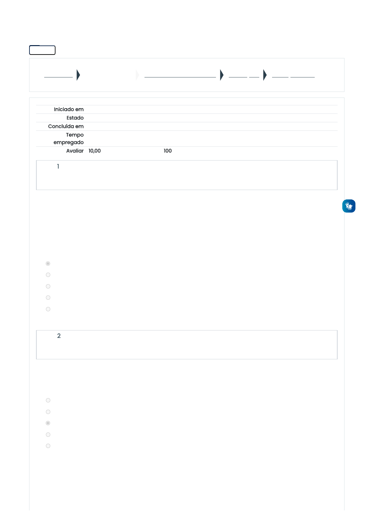 22/05/22, 16:44 Avaliação Online: Revisão da tentativa https://edu.grupoceuma.com.br/mod/quiz/review.php?attempt=5555&cmid=1206 1/6 Minha área Minhas disciplinas Contabilidade Intermediária AVALIAÇÕES Avaliação Online Iniciado em domingo, 22 Mai 2022, 16:33 Estado Finalizada Concluída em domingo, 22 Mai 2022, 16:44 Tempo empregado 10 minutos 26 segundos Avaliar 10,00 de um máximo de 10,00(100%) Questão 1 Correto Atingiu 1,00 de 1,00 Questão 2 Correto Atingiu 1,00 de 1,00 Um órgão adquiriu móveis e equipamentos por R$ 345.500,00 em 02.01.2018. Para que estes bens estivessem disponíveis para uso, a entidade incorreu em gastos adicionais de R$ 25.500,00 com instalação. Sabe-se que o valor residual destes bens móveis é de R$ 50.000,00 e que a sua vida útil é de 15 anos. Considerando os dados apresentados, pode-se afirmar que, nas demonstrações contábeis referentes a 31.12.2018, se reconheceu: Escolha uma opção: a. imobilizado no valor de R$ 371.000,00. b. imobilizado no valor de R$ 345.500,00. c. uma despesa no período de R$ 25.500,00. d. depreciação acumulada no valor de R$ 321.000,00. e. perda com ajuste a valor recuperável anual de R$ 21.400,00. Marque a opção que indica uma afirmativa incorreta: Escolha uma opção: a. A conta aluguéis a vencer representa uma despesa paga e não incorrida. b. A conta fornecedores tem saldo credor, pois representa um débito da empresa. c. Vendas a prazo representam uma receita realizada, mas ainda não ganha. d. Vendas à vista representam uma receita ganha e recebida. e. Segundo a teoria personalista, a conta veículos é uma conta dos agentes consignatários. Voltar https://edu.grupoceuma.com.br/my/ https://edu.grupoceuma.com.br/course/view.php?id=39 https://edu.grupoceuma.com.br/course/view.php?id=39§ion=6 https://edu.grupoceuma.com.br/mod/quiz/view.php?id=1206 22/05/22, 16:44 Avaliação Online: Revisão da tentativa https://edu.grupoceuma.com.br/mod/quiz/review.php?attempt=5555&cmid=1206 2/6 Questão 3 Correto Atingiu 1,00 de 1,00 Questão 4 Correto Atingiu 1,00 de 1,00 Questão 5 Correto Atingiu 1,00 de 1,00 Em 11 de outubro de 2017, a Cia. BMJ adquiriu um lote de mercadorias pelo valor de R$ 1.050,00, sendo 20% do valor pago à vista, 60% em novembro de 2017 e 20% em dezembro de 2017. No dia 10 de novembro de 2017, a Cia. BMJ vendeu metade do lote de mercadorias por R$ 2.500,00. Do valor da venda, recebeu R$ 1.300,00 à vista e o restante seria recebido em 90 dias. Sabendo que não havia estoques iniciais e desconsiderando a incidência de tributos, o resultado apurado pela Cia. BMJ, referente ao exercício financeiro de 2017, com a venda da metade do lote de mercadorias foi, em R$. Escolha uma opção: a. 250,00. b. 1.660,00. c. 670,00. d. 1.450,00. e. 1.975,00. Quando os débitos de uma empresa excedem o seu patrimônio bruto, dizemos que a situação líquida é: Escolha uma opção: a. superavitária b. nula c. ativa d. favorável e. deficitária Uma empresa adquiriu, em abril de 2014, uma máquina por R$ 150.000,00, com vida útil estimada em cinco anos e taxa de depreciação linear de 20% ao ano. Após três anos de uso, a máquina foi vendida, e a empresa registrou ganho na venda de imobilizado de R$ 10.000,00. Com base apenas nessas informações, assinale a alternativa que registra o lançamento contábil do reconhecimento da receita pela venda da máquina. Escolha uma opção: a. Debita Máquinas e equipamentos R$ 150.000,00 e Credita Depreciação acumulada R$ 90.000,00 e Credita Despesas de depreciação R$ 60.000,00. b. Debita Disponibilidades ou Contas a receber R$ 70.000,00 e Credita Receita na alienação do imobilizado R$ 70.000,00. c. Debita Caixa R$ 10.000,00 e Credita Receita na alienação do imobilizado R$ 10.000,00. d. Debita Resultado na venda do imobilizado R$ 60.000,00 e Credita Imobilizado R$ 60.000,00. e. Debita Receita na venda do imobilizado R$ 60.000,00 e Credita Imobilizado R$ 60.000,00. 22/05/22, 16:44 Avaliação Online: Revisão da tentativa https://edu.grupoceuma.com.br/mod/quiz/review.php?attempt=5555&cmid=1206 3/6 Questão 6 Correto Atingiu 1,00 de 1,00 Questão 7 Correto Atingiu 1,00 de 1,00 Questão 8 Correto Atingiu 1,00 de 1,00 Não é conta patrimonial: Escolha uma opção: a. Amortização acumulada b. Encargos de depreciação c. Adiantamento de clientes d. Clientes e. Salários a pagar De acordo com a legislação societária, com os pronunciamentos do CPC e com as práticas contábeis, assinale a opção em que todas as contas mostradas sejam exclusivamente de resultado. Escolha uma opção: a. IPI a compensar / Despesa com energia elétrica b. Depreciação acumulada de veículos / Despesas de comissões c. ICMS a recolher / Despesas gerais d. Despesas com pessoal / Salários a pagar e. Custo das mercadorias vendidas / Reversão de perdas estimadas nos estoques. Determinada empresa adquiriu, em 31/12/2014, uma máquina no valor de R$ 130.000,00 a prazo, sendo esse valor registrado no seu ativo imobilizado. Na data da aquisição, o bem foi colocado em uso e a empresa estimou que a vida útil será de 10 anos e o seu valor residual de R$ 30.000,00. Sabendo-se que a empresa utiliza o método linear para o cálculo da depreciação. Com base nessas informações, o valor contábil apresentado no Balanço Patrimonial de 31/12/2016 foi em reais: Escolha uma opção: a. 120.000,00. b. 130.000,00. c. 110.000,00. d. 100.000,00. e. 90.000,00. 22/05/22, 16:44 Avaliação Online: Revisão da tentativa https://edu.grupoceuma.com.br/mod/quiz/review.php?attempt=5555&cmid=1206 4/6 Questão 9 Correto Atingiu 1,00 de 1,00 Questão 10 Correto Atingiu 1,00 de 1,00 A Cia. das Peças, ao analisar o desempenho operacional de seu setor produtivo, obteve as seguintes informações sobre a matéria-prima utilizada na fabricação de determinado produto: Com base nessas informações, a variação: Escolha uma opção: a. da quantidade de matéria-prima por unidade foi R$ 0,90 desfavoráve