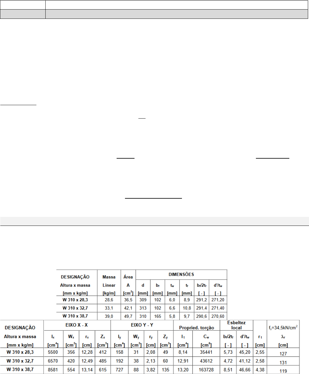 Curso: Engenharia de Estruturas Metálicas Disciplina: Estruturas Metálicas Especiais Olá, turma! A seguir são apresentadas questões discursivas sobre todo o assunto abordado na disciplina. Para respondê-las, consultem o material didático fornecido, os materiais de apoio, as leituras e vídeos da sala de aula e dos estudos complementares. Orientações: · A atividade de envio da unidade 4 vale 25 pontos; · As questões discursivas devem ser redigidas pelo aluno e devidamente referenciadas. As citações e referências devem seguir o que preconizam a ABNT NBR 6023 e a ABNT NBR 10520; · Atividades com altos índices de plágio, conforme Manual do Aluno, devem ser reprovadas; · Todos os cálculos necessários à resolução da atividade devem estar elucidados em cada questão e podem ser feitos a mão e digitalizados; · A atividade deve ser entregue em apenas um arquivo em formato .pdf, .docx ou similar. Questão 01 (12,0 pontos) Determine carga resistente do perfil de um pórtico de um galpão metálico a ser dimensionado com o uso do perfil W 310x38,7 que é de grande disponibilidade no mercado da região. Dados: E=200.000 Ca = 0,34 Kx=Ky=Kz=1 G=77.000 Formulário: Questão 02 (13,0 pontos) Uma estaca numa região de solo natural de argila muito mole é formada por um perfil metálico W 310 x 21,0 com dimensões geométricas conforme Figura 2.1 abaixo. Calcule a carga estrutural admissível à compressão. Figura 2.1. Tabela de bitolas. Fonte: Gerdau (S. d.). Dados: · Perfil de aço: W 310 x 21,0, fy = 350 MPa, fu = 460 MPa, E = 200 GPa, f = 1,1; · Combinação de ações: γm =1,5. Formulário: Tabela 2.1 – Espessura de sacrifício para compensação de corrosão. Classe Espessura de sacrifício mínima (mm) Aterros controlados e solos naturais 1,0 Solos porosos não saturados e argilas orgânicas 1,5 Turfa 3,0 Aterros não controlados 2,0 Solos contaminados 3,2 Fonte: NBR 6122 (2019). Tabela 2.2 – Valores típicos da constante do módulo de reação horizontal. Compacidade da areia ou consistência da argila Valores de (MPa) Seca Submersa Areia fofa 2,6 1,5 Areia medianamente 8,0 5,0 Areia compacta 20,0 12,5 Silte muito fofo - 0,1 a 0,3 Argila muito mole - 0,55 Fonte: Alonso (2012). Tabela 2.3 – Valores do coeficiente de flambagem. Condições de apoio Caso 1 Caso 2 Caso 3 Caso 4 Caso 5 Caso 6 k 0,5 0,7 1,0 1,0 2,0 2,0 Fonte: Adaptado de NBR 8800 (2008). · Se 0 1,5: · Se 0 > 1,5: · Abas · Alma