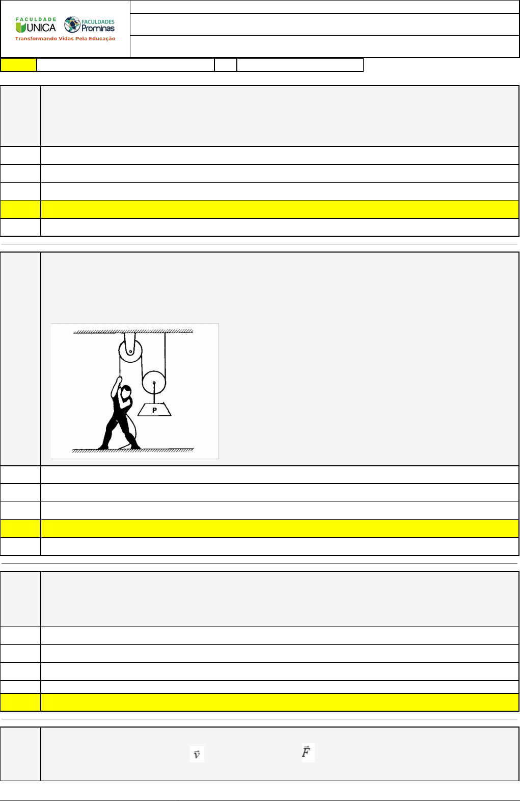 05/10/2022 19:19:51 1/3 REVISÃO DE SIMULADO Nome: JOSÉ RÓMULO DA COSTA JUNIOR Disciplina: Física I Respostas corretas são marcadas em amarelo X Respostas marcardas por você. Questão 001 No piso de um elevador é colocada uma balança de banheiro, graduada em Newtons. Um corpo é colocado sobre a balança. Quando o elevador sobe com aceleração constante de 2,2 m/s2, a balança indica 720 N. Sendo a aceleração local da gravidade igual a 9,8 m/s2, determine a massa do corpo, em quilogramas. A) 72 kg B) 68 kg C) 84 kg X D) 60 kg E) 50 kg Questão 002 Considere o esquema representado na figura abaixo, onde um homem de 800 N de peso, ergue com velocidade constante, um corpo de 500 N de peso, utilizando um roldana móvel. Determine a força que o homem exerce para elevar o corpo com velocidade constante. A) 100 N B) 1300 N C) 500 N X D) 250 N E) 800 N Questão 003 Um bloco de peso 90 N está em repouso em uma superfície. Os coeficientes de atrito estático e cinético são respectivamente iguais a 0,3 e 0,2. Qual o valor da força máxima que pode ser aplicada ao corpo para que ele permaneça em repouso. A) 21 N X B) 35 N C) 18 N D) 9 N E) 27 N Questão 004 Atira-se uma pedra verticalmente para cima. Assinale a opção que representa corretamente a velocidade da pedra e a força que sobre ela atua, no ponto mais alto da trajetória. 05/10/2022 19:19:51 2/3 X A) B) C) D) E) Questão 005 Considere o ginasta Isaac Newton pendurado nas argolas, de acordo com as duas situações a seguir. Para exibir seus conhecimentos físicos o ginasta supôs que a tensão máxima suportada pelas duas cordas juntas seria exatamente a necessária para suportar o seu peso. Foram feitas as seguintes afirmativas: I. A corda romperia na situação I. II. A corda romperia na situação II. III. A maneira que a corda é utilizada não interfere. Está(ao) correta(s): X A) Todas as afirmativas. B) Apenas afirmativa I. C) Apenas afirmativas I e III. D) Apenas afirmativa III. E) Apenas afirmativa II. 05/10/2022 19:19:51 3/3 Questão 006 A figura I, abaixo, ilustra um bloco A apoiado sobre um bloco B, estando o con-junto em repouso sobre uma mesa horizontal. Na figura II são apresentados dia-gramas que representam as forças que agem sobre cada um dos blocos, con-siderados como sistemas isolados. Nessa figura, as linhas tracejadas são igual-mente espaçadas e os tamanhos dos vetores são proporcionais aos módulos das respectivas forças. Das forças representadas nos diagramas, aquelas que podem configurar um par ação- reação são: X A) F1 e F4 B) F1 e F3 C) F3 e F4 D) F2 e F5 E) F1 e F2 Questão 007 Considere o bloco da figura, peso = 60 N, apoiado sobre um plano inclinado sob o ângulo de 75º, onde o coeficiente de atrito estático vale 0,6 e o coeficiente de atrito dinâmico vale 0,4, considerando F como força aplicada sobre o bloco, conforme figura, estando o mesmo inicialmente em repouso. Determine a aceleração do bloco quando a força for 45 N. A) 3,93 m/s2 B) 1,13 m/s2 C) 0,9 ms2 X D) 5,45 m/s2 E) 2,34 m/s2 Questão 008 Refira-se a figura abaixo. A força total que atua sobre a bola (em equilíbrio) é igual A) ao empuxo do ar. B) a zero. X C) a tração exercida pelo fio. D) ao peso da bola. E) a força exercida pelo vento.