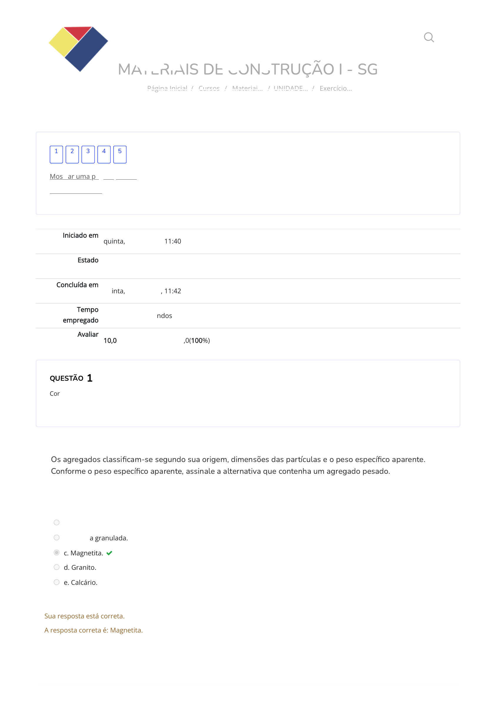 06/10/2022 11:42 Exercício de fixação - Agregados: Revisão da tentativa https://cpetead.com.br/mod/quiz/review.php?attempt=3012350&cmid=47048 1/4 MATERIAIS DE CONSTRUÇÃO I - SG Página Inicial / Cursos / Materiai… / UNIDADE… / Exercício… Iniciado em quinta, 6 Out 2022, 11:40 Estado Finalizada Concluída em quinta, 6 Out 2022, 11:42 Tempo empregado 1 minuto 55 segundos Avaliar 10,0 de um máximo de 10,0(100%) QUESTÃO Correto Atingiu 2,0 de 2,0 Mostrar uma página por vez Terminar revisão 1 2 3 4 5 1 Os agregados classi�cam-se segundo sua origem, dimensões das partículas e o peso especí�co aparente. Conforme o peso especí�co aparente, assinale a alternativa que contenha um agregado pesado. Escolha uma opção: a. Arenito. b. Escória granulada. c. Magnetita. d. Granito. e. Calcário. Sua resposta está correta. A resposta correta é: Magnetita. https://cpetead.com.br/ https://cpetead.com.br/course/index.php https://cpetead.com.br/course/view.php?id=1996 https://cpetead.com.br/mod/quiz/view.php?id=47048 https://cpetead.com.br/mod/quiz/review.php?attempt=3012350&cmid=47048&showall=0 https://cpetead.com.br/mod/quiz/view.php?id=47048 https://cpetead.com.br/ 06/10/2022 11:42 Exercício de fixação - Agregados: Revisão da tentativa https://cpetead.com.br/mod/quiz/review.php?attempt=3012350&cmid=47048 2/4 QUESTÃO Correto Atingiu 2,0 de 2,0 QUESTÃO Correto Atingiu 2,0 de 2,0 2 De�nimos a tenacidade dos agregados como: Escolha uma opção: a. A tenacidade refere-se ao volume de material sólido excluindo todos os poros. b. A tenacidade é de�nida como a resistência ao desgaste. c. A tenacidade pode ser de�nida como a resistência do agregado à ruptura por impacto. d. A tenacidade refere-se ao volume de material sólido excluindo todos os poros. e. A tenacidade pode ser de�nida como a água excedente no agregado na condição saturado. Sua resposta está correta. A resposta correta é: A tenacidade pode ser de�nida como a resistência do agregado à ruptura por impacto. 3 Assinale a alternativa que contenha um agregado natural: Escolha uma opção: a. Argila expandida. b. Brita 01. c. Seixo rolado. d. Pedra britada. e. Escória de alto-forno. Sua resposta está correta. A resposta correta é: Seixo rolado. 06/10/2022 11:42 Exercício de fixação - Agregados: Revisão da tentativa https://cpetead.com.br/mod/quiz/review.php?attempt=3012350&cmid=47048 3/4 QUESTÃO Correto Atingiu 2,0 de 2,0 QUESTÃO Correto Atingiu 2,0 de 2,0 4 Os agregados podem ser classi�cados de acordo com o material que constitui as partículas de acordo com sua densidade em leves, médios e pesados. Contém um material considerado leve: Escolha uma opção: a. Escória. b. Areia. c. Barita d. Escória granulada. e. Cascalho. Sua resposta está correta. A resposta correta é: Escória granulada. 5 Assinale a alternativa que contenha um agregado natural: Escolha uma opção: a. Brita. b. Pedra britada. c. Pó de pedra. d. Bica corrida. e. Seixos. Sua resposta está correta. A resposta correta é: Seixos. ◄ Agregados Seguir para... Leitura Obrigatória: Aula 05 - Introdução aos Agregados ► Quem somos Cursos Certi�cação Unidades https://cpetead.com.br/mod/lti/view.php?id=46982&forceview=1 https://cpetead.com.br/mod/url/view.php?id=46985&forceview=1 https://www.cpet.com.br/quem-somos-cpet-cursos-tecnicos-a-distancia-ead/ https://www.cpet.com.br/course-cat/cursos/cursos-online/ https://www.cpet.com.br/certificacao-cpet/ https://www.cpet.com.br/unidades-cpet/ 06/10/2022 11:42 Exercício de fixação - Agregados: Revisão da tentativa https://cpetead.com.br/mod/quiz/review.php?attempt=3012350&cmid=47048 4/4 Contato Copyright © 2021 CPET - Centro de Pro�ssionalização e Educação Técnica https://www.cpet.com.br/contato/ https://www.facebook.com/CPET-Centro-de-Profissionaliza%C3%A7%C3%A3o-e-Educa%C3%A7%C3%A3o-T%C3%A9cnica-1039179026236475/ https://twitter.com/soucpet/ https://www.instagram.com/soucpet/