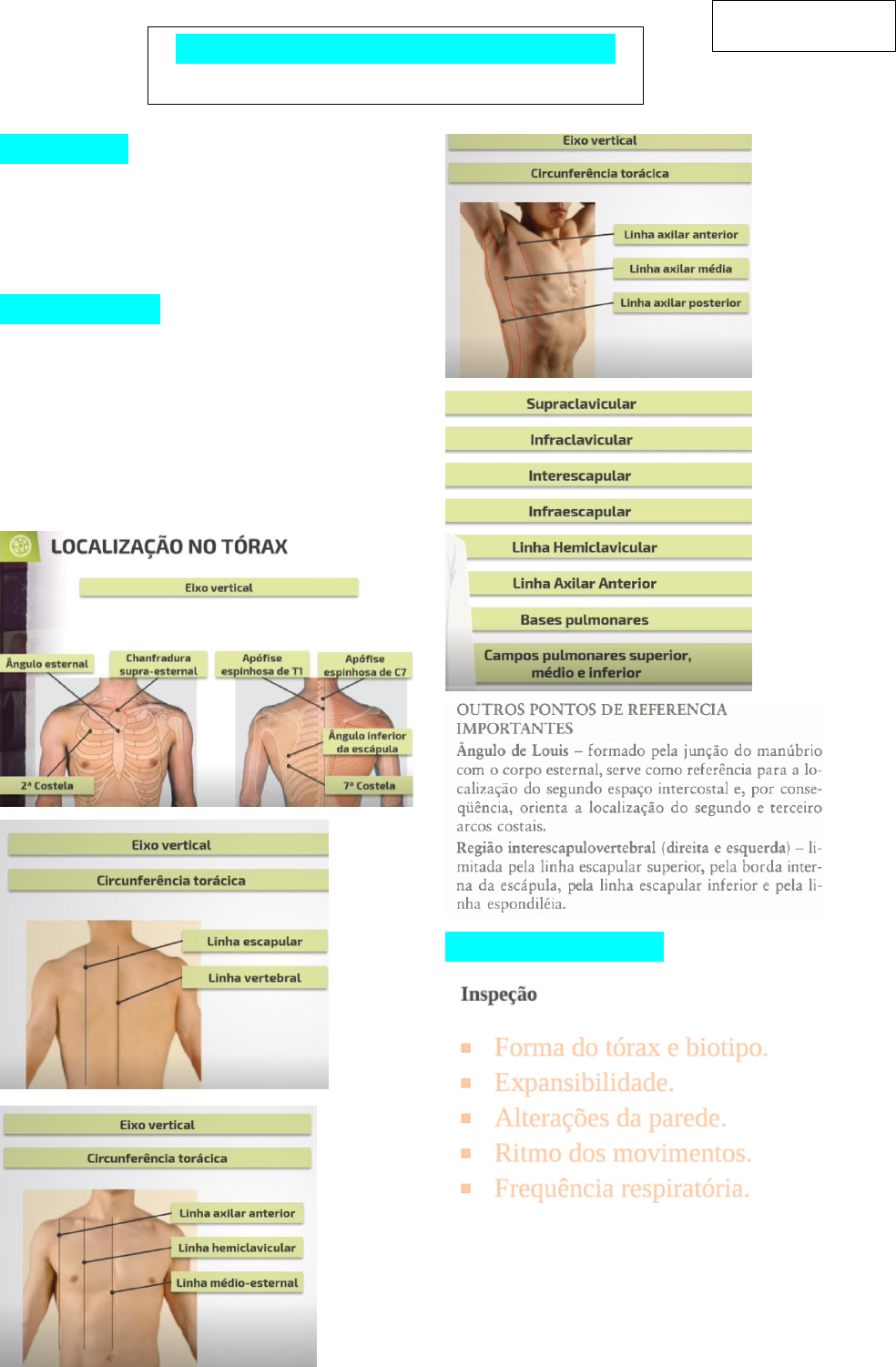 Anamense: o tosse, expectoração, chiado, dor torácica, hemoptise, cianose e dispneia. Exame físico o 04 etapas: inspeção, palpação, percussão ausculta. o Sempre será comparativo( hemitorax D/E), avaliar as 03 faces: anterior, posterior e lateral e bilateral. 1° Passo: Inspeção “ observar a movimentação do tórax, pedir p paciente inspirar profundamente e expirar” Semiologia do Sistema Respiratório Isabella Afonso Inspeção estática: o O examinador começa pela descrição da pele, do tecido subcutâneo e dos músculos. A presença de circulação colateral, retrações e abaulamentos, avaliar o formato, presença de cicatrizes. Inspeção dinâmica: o os movimentos respiratórios do paciente são observados e classificados, tomando-se como parâmetros a frequência, o ritmo, a presença de apneia e as alterações nos espaços intercostais. o A frequência normal (16 e 20 movimentos por minuto) é denominada de eupneia, quando diminuída bradipneia e quando aumentada taquipneia. Sensação de desconforto respiratório é denominado de dispneia. A se baseia em 3 conceitos: expansibilidade, movimentos e simetria. 2° passo: Palpação o Exame das paredes: -enfisema subcutâneo, linfonodos palpáveis (periclavicular e axilar), palpar as mamas nas mulheres, anormalidades na pele, tecido e musculatura. o Testar a sensibilidade - tórax normal não apresenta dor durante a palpação. Se o paciente referir pontos dolorosos é um sinal de alerta a ser considerado. Assim, processos inflamatórios pleuropulmonares são manifestados clinicamente por zonas mais sensíveis. o Testar a elasticidade: manobra de Lasègue O examinador deve apoiar uma mão na parede anterior e a outra na parede posterior do tórax do paciente e realizar leve compressão em diversos pontos. A elasticidade varia muito conforme a idade do paciente, portanto seu valor propedêutico depende da comparação entre ambas as regiões do tórax. A diminuição da elasticidade torácica pode ser encontrada no enfisema e na ossificação das cartilagens costais (diminuição bilateral), ou nos derrames, tumores e condensações(diminuiçãounilateral o Testar a expansibilidade: manobra de Ruault A avaliação da expansibilidade é feita no ápice da face posterior e na base das faces posterior e anterior. -permite avaliar o volume de ar mobilizado durante a respiração em cada segmento pulmonar. - A expansibilidade do ápice é verificada por meio da manobra de Ruault. -O examinador coloca uma mão em cada hemitórax de maneira simétrica, com as extremidades dos polegares reunidas na linha mediana ou vertebral sobre a apófise espinhosa de C7. Pede-se para o paciente inspirar profundamente e verifica-se, comparando a elevação das mãos, se existe assimetria. A manobra deve ser realizada em todo a extensão torácica. -São considerados anormais os movimentos diminuídos da expansibilidade, que podem ser bilaterais ou unilaterais, localizados ou difusos, patológicos (como no enfisema pulmonar, atelectasia, derrame pleural e tumores) ou fisiológicos. o Avaliação dos frêmitos toracovocal: - avaliar na região anterior: supraclavicular, infraclavicular, inframamaria. Lateral: axilar e infraxilar e Posterior ( repousa as mãos na região supraclavicular; inter-escapular, infraescapular D/E. -pedir para o paciente repetir a palavra “trinta e três”. Colocar as mãos nos ombros para afastar as escapulas Pneumotorax- aumenta o frêmito. Derrame pleural diminui 3° passo: Percussão o aplicação de uma ação mecânica sobre os tecidos, levando à vibração destes em sua profundidade e obtendo sons e ruídos diversos. Na percussão normal, o pulmão apresenta som claro pulmonar, classicamente comparado à “percussão de um pão”. Sons timpânicos ou maciços são indicativos de anormalidades. o O som timpânico/ hipersonoro está relacionado com a presença de quantidade anormal de gás na cavidade torácica em relação ao parênquima, por exemplo no pneumotórax. Enfisema pulmonar o O som maciço indica aumento da densidade torácica; esse sinal pode ser encontrado nos derrames pleurais ou na presença de massa tumoral intratorácica. Regiões a percutir: Anterior: supraclavicular, infraclavicular. Região mamaria não percute! Posterior: supraescapular, interescapular e infraescapular. Não deve percutir na região escapular!! Sempre entre os espaços intercostais! E- ápice até o timpanismo D- ápice até o maciço Posterior- até o som maciço da região da musculatura lombar 4° Passo: Ausculta ACHADOS NO EXAME FISICO: