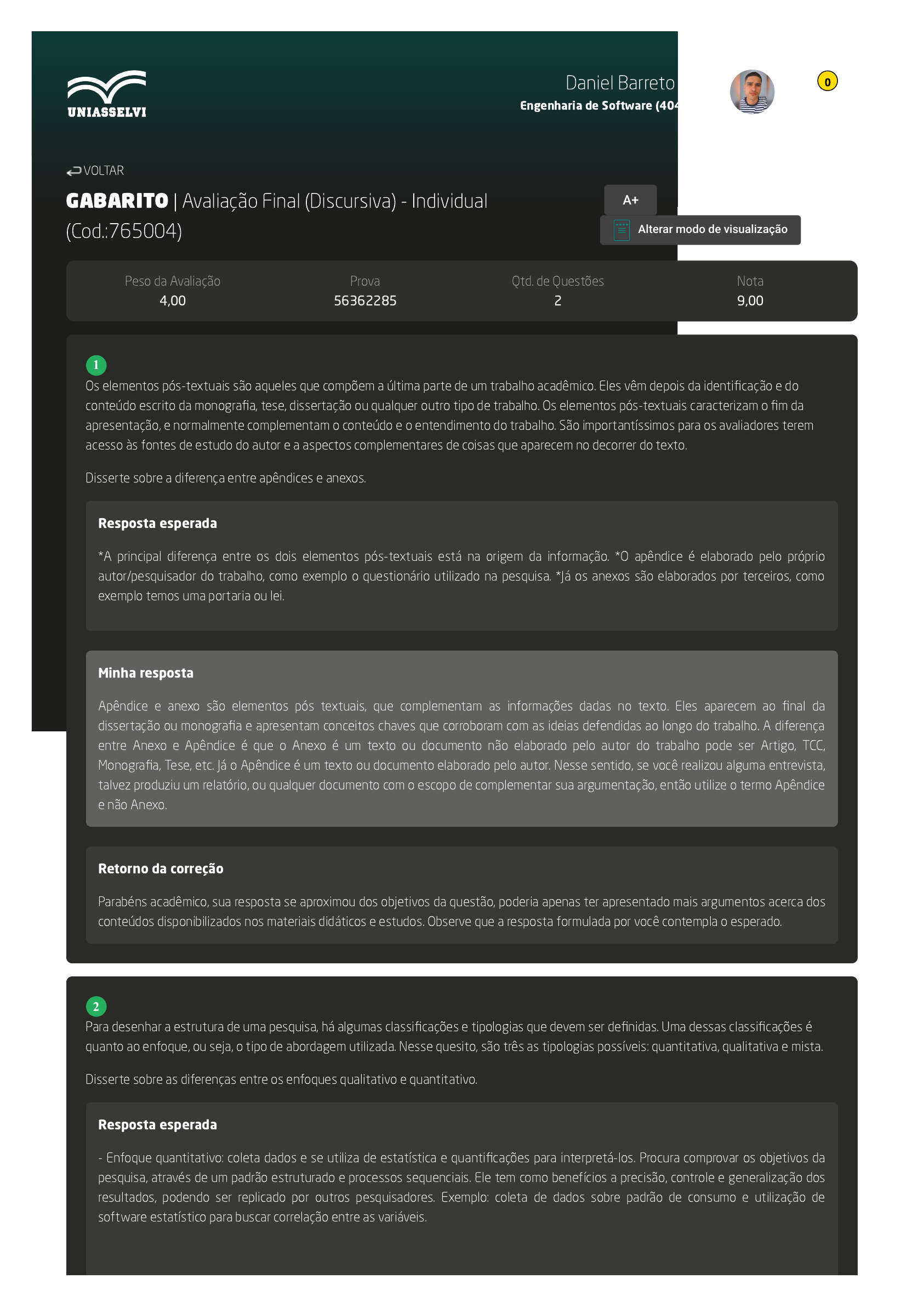 06/10/2022 13:09 AVA https://ava2.uniasselvi.com.br/subject/grades-and-tests/answer-book/eyJ0ZXN0Ijp7InRlc3RDb2RlIjoiNzY1MDA0IiwiZGVzY3JpcHRpb24iOiJBdmFsaWHDp8OjbyBGaW5hbCAoRGlzY3Vyc2l2YSkgLSBJbmRpdmlkdW… 1/2 GABARITO | Avaliação Final (Discursiva) - Individual (Cod.:765004) Peso da Avaliação 4,00 Prova 56362285 Qtd. de Questões 2 Nota 9,00 Os elementos pós-textuais são aqueles que compõem a última parte de um trabalho acadêmico. Eles vêm depois da identificação e do conteúdo escrito da monografia, tese, dissertação ou qualquer outro tipo de trabalho. Os elementos pós-textuais caracterizam o fim da apresentação, e normalmente complementam o conteúdo e o entendimento do trabalho. São importantíssimos para os avaliadores terem acesso às fontes de estudo do autor e a aspectos complementares de coisas que aparecem no decorrer do texto. Disserte sobre a diferença entre apêndices e anexos. Resposta esperada *A principal diferença entre os dois elementos pós-textuais está na origem da informação. *O apêndice é elaborado pelo próprio autor/pesquisador do trabalho, como exemplo o questionário utilizado na pesquisa. *Já os anexos são elaborados por terceiros, como exemplo temos uma portaria ou lei. Minha resposta Apêndice e anexo são elementos pós textuais, que complementam as informações dadas no texto. Eles aparecem ao final da dissertação ou monografia e apresentam conceitos chaves que corroboram com as ideias defendidas ao longo do trabalho. A diferença entre Anexo e Apêndice é que o Anexo é um texto ou documento não elaborado pelo autor do trabalho pode ser Artigo, TCC, Monografia, Tese, etc. Já o Apêndice é um texto ou documento elaborado pelo autor. Nesse sentido, se você realizou alguma entrevista, talvez produziu um relatório, ou qualquer documento com o escopo de complementar sua argumentação, então utilize o termo Apêndice e não Anexo. Retorno da correção Parabéns acadêmico, sua resposta se aproximou dos objetivos da questão, poderia apenas ter apresentado mais argumentos acerca dos conteúdos disponibilizados nos materiais didáticos e estudos. Observe que a resposta formulada por você contempla o esperado. Para desenhar a estrutura de uma pesquisa, há algumas classificações e tipologias que devem ser definidas. Uma dessas classificações é quanto ao enfoque, ou seja, o tipo de abordagem utilizada. Nesse quesito, são três as tipologias possíveis: quantitativa, qualitativa e mista. Disserte sobre as diferenças entre os enfoques qualitativo e quantitativo. Resposta esperada - Enfoque quantitativo: coleta dados e se utiliza de estatística e quantificações para interpretá-los. Procura comprovar os objetivos da pesquisa, através de um padrão estruturado e processos sequenciais. Ele tem como benefícios a precisão, controle e generalização dos resultados, podendo ser replicado por outros pesquisadores. Exemplo: coleta de dados sobre padrão de consumo e utilização de software estatístico para buscar correlação entre as variáveis. VOLTAR A+ Alterar modo de visualização 1 2 Daniel Barreto Lima Engenharia de Software (4042452) 0 06/10/2022 13:09 AVA https://ava2.uniasselvi.com.br/subject/grades-and-tests/answer-book/eyJ0ZXN0Ijp7InRlc3RDb2RlIjoiNzY1MDA0IiwiZGVzY3JpcHRpb24iOiJBdmFsaWHDp8OjbyBGaW5hbCAoRGlzY3Vyc2l2YSkgLSBJbmRpdmlkdW… 2/2 - Enfoque qualitativo: objetiva verificar em profundidade os fenômenos que se desejam estudar. Com base nos dados obtidos é que se interpretam os resultados. Seus benefícios incluem a profundidade da análise, uma riqueza interpretativa (porque permite descrição detalhada, impressões e pontos de vista, além de indagações mais flexíveis). Exemplo: roteiro de entrevista com um gestor de empresa e posterior análise das respostas. Minha resposta Ainda em fase de planejamento de uma pesquisa, a primeira classificação é indispensável para determinar outros tópicos, como, por exemplo, a metodologia. A primeira parte de uma pesquisa deve ser em relação á abordagem. pesquisas cientificas sempre podem ser qualitativas ou quantitativas, ou ainda, reunir as duas classificações. A escolha vai depender da área, do objeto e dos objetivos da pesquisa. Pesquisadores quantitativos recolhem os fatos e estudam a relação entre eles. Já os pesquisadores qualitativos estão mais interessados em compreender as percepções individuais do mundo. Procuram compreensão, em vez de análise estatística. Contudo, há momentos em que os pesquisadores qualitativos recorrem a técnicas quantitativas, e vice-versa. Dito isto, fica claro que ambas as metodologias assumem o mesmo grau de importância. A utilização delas irá variar diante daquilo que queremos estudar e quais perguntas queremos responder. Retorno da correção Parabéns acadêmico, sua resposta se aproximou dos objetivos da questão, poderia apenas ter apresentado mais argumentos acerca dos conteúdos disponibilizados nos materiais didáticos e estudos. Observe que a resposta formulada por você contempla o esperado. Imprimir Daniel Barreto Lima Engenharia de Software (4042452) 0