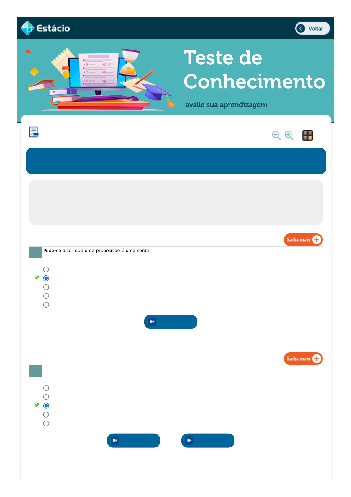 06/10/2022 19:48 Estácio: Alunos https://simulado.estacio.br/alunos/ 1/3 Teste de Conhecimento avalie sua aprendizagem Pode-se dizer que uma proposição é uma sentença que admite somente os valores lógicos verdade e falsidade. Com base no que foi dito observe as afirmativas e assinale a alternativa correta. I - Chove. II - 3 < 1. III - Está frio. IV - Bom dia! Sejam as sentenças: "p:Camões escreveu os Luzíadas" ; "q:"O triplo de 4 é 12" e r:"Vasco da Gama é clube do Rio de Janeiro" .Os valores lógicos de p, q e r são respectivamente RACIOCÍNIO LÓGICO, CRÍTICO E ANALÍTICO PARA TOMADA DE DECISÃO Lupa Calc. DGT0025_A8_202208365981_V1 Aluno: ANA FABIOLA SEFORA SILVA TEMOTEO DE SOUZA Matr.: 202208365981 Disc.: RACIOCÍNIO LÓGICO, 2022.3 EAD (G) / EX Prezado (a) Aluno(a), Você fará agora seu TESTE DE CONHECIMENTO! Lembre-se que este exercício é opcional, mas não valerá ponto para sua avaliação. O mesmo será composto de questões de múltipla escolha. Após responde cada questão, você terá acesso ao gabarito comentado e/ou à explicação da mesma. Aproveite para se familiarizar com este modelo de questões que será usado na sua AV e AVS. 1. Nenhuma afirmativa é proposição. Apenas a afirmativa IV NÃO é proposição. Apenas a afirmativa II NÃO é proposição. Apenas a afirmativa I é proposição. Apenas a afirmativa III é proposição. Gabarito Comentado 2. FFV VFV VVV FFF VVF Gabarito Comentado Gabarito Comentado javascript:voltar(); javascript:voltar(); javascript:duvidas('750716','7243','1','7215100','1'); javascript:duvidas('734391','7243','2','7215100','2'); javascript:duvidas('619979','7243','3','7215100','3'); javascript:diminui(); javascript:aumenta(); javascript:calculadora_on(); 06/10/2022 19:48 Estácio: Alunos https://simulado.estacio.br/alunos/ 2/3 Sabe-se que se João ama Ana, então José ama Marta. Por outro lado, sabemos que José não ama Marta. Logo : Sejam as sentenças: "p: O número 6 tem 4 divisores" e "q:2³ < 2³". Os valores lógicos de p e q são respectivamente Sejam as sentenças: "p: O Amazonas é um rio do Brasil" e "q: 2² < 2³". Os valores lógicos de p e q são respectivamente: Sendo o conjunto A = {x pertence ao conjunto dos números naturais tal que x < 2} e as proposições: "p: O conjunto A é finito", "q: O elemento 2 pertence ao conjunto A" e "r: Todo conjunto unitário é subconjunto de A". Quanto aos valores Lógicos das proposições p, q e r, podemos dizer que: 3. José ama Ana e José ama Marta; João e José amam Ana; João não ama Ana e José ama Marta; João ama Ana e José não ama Marta; José não ama Marta e João não ama Ana: Gabarito Comentado Gabarito Comentado 4. VV FF VF FV Impossível determinar com estas informações. Gabarito Comentado 5. Impossível determinar com estas informações. F e F V e V F e V V e F Gabarito Comentado 6. apenas "r" é verdadeira. apenas "q" é verdadeira. apenas "q" é falsa. apenas "p" é verdadeira. todas são verdadeiras. Gabarito Comentado Gabarito Comentado javascript:duvidas('619979','7243','3','7215100','3'); javascript:duvidas('734388','7243','4','7215100','4'); javascript:duvidas('734380','7243','5','7215100','5'); javascript:duvidas('747345','7243','6','7215100','6'); 06/10/2022 19:48 Estácio: Alunos https://simulado.estacio.br/alunos/ 3/3 A proposição: Se Pedro é estudante, então sabe matemática, é uma: Dadas as proposições abaixo, indique qual não é composta: 7. disjunção. conjunção. disjunção exclusiva. bicondicional. condicional. Gabarito Comentado Gabarito Comentado 8. O gato não subiu na árvore e não miou. Se o cão está latindo, o cão está na casa. Pedro é filho de Paula. Se não é o caso que o Brasil seja pequeno, então é grande. Maria viajou com João e trouxe presentes para sua mãe. Gabarito Comentado Gabarito Comentado Não Respondida Não Gravada Gravada Exercício inciado em 06/10/2022 19:48:08. javascript:duvidas('243354','7243','7','7215100','7'); javascript:duvidas('753749','7243','8','7215100','8'); javascript:abre_colabore('35394','295508619','5757201148');
