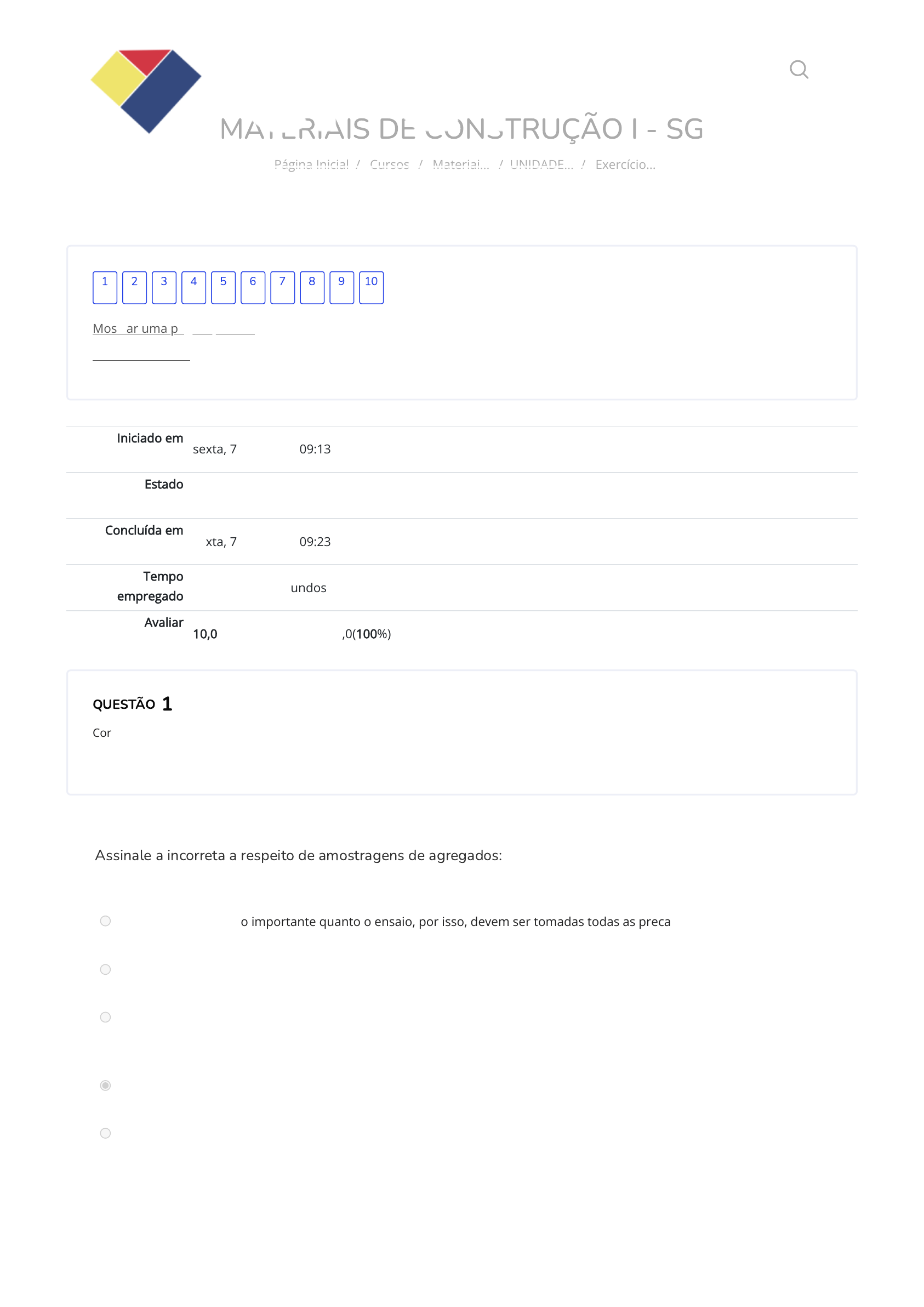 07/10/2022 09:23 Exercício de Fixação: Aula 08 - Ensaio de Agregados: Revisão da tentativa https://cpetead.com.br/mod/quiz/review.php?attempt=3017518&cmid=46998 1/6 MATERIAIS DE CONSTRUÇÃO I - SG Página Inicial / Cursos / Materiai… / UNIDADE… / Exercício… Iniciado em sexta, 7 Out 2022, 09:13 Estado Finalizada Concluída em sexta, 7 Out 2022, 09:23 Tempo empregado 9 minutos 27 segundos Avaliar 10,0 de um máximo de 10,0(100%) QUESTÃO Correto Atingiu 1,0 de 1,0 Mostrar uma página por vez Terminar revisão 1 2 3 4 5 6 7 8 9 10 1 Assinale a incorreta a respeito de amostragens de agregados: Escolha uma opção: a. A amostragem é tão importante quanto o ensaio, por isso, devem ser tomadas todas as precauções necessárias para que se obtenha amostras representativas quanto às suas natureza e características. b. As amostras parciais, tomadas em diferentes pontos do lote, devem representar todas as possíveis variações do material, podendo assim resultar na porção mais representativa do material. c. As amostras de ensaio devem ser remetidas em sacos, containers, caixas ou recipientes adequados e limpos, precavendo-se contra a perda de qualquer parte da amostra, ou dani�cação do recipiente durante o manuseio e transporte. d. Deve-se efetuar a amostragem quando o material estiver totalmente seco e, caso essa condição não se veri�que, cabe secar completamente o material para evitar a segregação da parte pulverulenta. e. O número de amostras parciais é de�nido em função do volume de material e da maior ou menor variação de suas características. Sua resposta está correta. https://cpetead.com.br/ https://cpetead.com.br/course/index.php https://cpetead.com.br/course/view.php?id=1996 https://cpetead.com.br/mod/quiz/view.php?id=46998 https://cpetead.com.br/mod/quiz/review.php?attempt=3017518&cmid=46998&showall=0 https://cpetead.com.br/mod/quiz/view.php?id=46998 https://cpetead.com.br/ 07/10/2022 09:23 Exercício de Fixação: Aula 08 - Ensaio de Agregados: Revisão da tentativa https://cpetead.com.br/mod/quiz/review.php?attempt=3017518&cmid=46998 2/6 QUESTÃO Correto Atingiu 1,0 de 1,0 QUESTÃO Correto Atingiu 1,0 de 1,0 2 A respeito do Teor de Umidade Total em Agregados, associe: Como a temperatura não é alta e possui grande variabilidade, o agregado tem a sua superfície seca, porém, os poros permeáveis mais internos não são completamente secos. ----- Neste caso todos os poros permeáveis encontram-se saturados. Essa situação é encontrada na prática de determinação de absorção e massa especí�ca de agregados graúdos. ----- Devido à alta e constante temperatura, o agregado encontra-se completamente seco, tanto no seu exterior quanto no seu interior (vazios permeáveis). ----- Seco ao ar Saturado com superfície seca Agregado seco em estufa Sua resposta está correta. 3 As partículas inferiores à 0,075 mm (materiais pulverulentos) são constituídas de silte e argila. Em geral, a presença desses materiais é desejável na constituição do concreto, pois um agregado com alto teor de materiais pulverulentos aumenta aderência do agregado à pasta ou argamassa, bene�ciando de forma direta a resistência do concreto. Escolha uma opção: Verdadeiro Falso 07/10/2022 09:23 Exercício de Fixação: Aula 08 - Ensaio de Agregados: Revisão da tentativa https://cpetead.com.br/mod/quiz/review.php?attempt=3017518&cmid=46998 3/6 QUESTÃO Correto Atingiu 1,0 de 1,0 QUESTÃO Correto Atingiu 1,0 de 1,0 4 Assinale a correta sobre o ensaio de impurezas orgânicas em agregados: Escolha uma opção: a. Todas as outras são corretas. b. É um método de determinação colorimétrica de impurezas orgânicas em agregado miúdo destinado ao preparo do concreto. c. Devido a sua origem orgânica, exercem ação prejudicial sobre a pega e o endurecimento das argamassas e concretos. d. No caso da solução resultante da amostra pós ensaio apresentar cor mais escura que a da solução padrão, a areia é considerada suspeita e deverão ser procedidos outros ensaios de qualidade, conforme NBR 7221. e. Impurezas orgânicas são materiais indesejáveis que estão presentes nas areias. Sua resposta está correta. 5 São equipamentos do método de tomada aleatória para redução da amostra de agregados, exceto: Escolha uma opção: a. Pá reta. b. Pá côncava. c. Concha de amostragem. d. Colher de pedreiro. e. Separador mecânico. Sua resposta está correta. 07/10/2022 09:23 Exercício de Fixação: Aula 08 - Ensaio de Agregados: Revisão da tentativa https://cpetead.com.br/mod/quiz/review.php?attempt=3017518&cmid=46998 4/6 QUESTÃO Correto Atingiu 1,0 de 1,0 QUESTÃO Correto Atingiu 1,0 de 1,0 QUESTÃO Correto Atingiu 1,0 de 1,0 6 A distribuição granulométrica dos agregados é determinada usualmente por meio de uma análise por peneiramento. Nessa análise uma amostra seca de agregado é fracionada através de uma série de peneiras com aberturas de malha progressivamente menores. Escolha uma opção: Verdadeiro Falso 7 Ao contrário do cimento, e embora ocupem 30 a 50 por cento do volume do concreto, os agregados são frequentemente considerados como um material de enchimento inerte e, portanto, não se dá muita atenção ao seu possível efeito nas propriedades do concreto. Escolha uma opção: Verdadeiro Falso 8 A respeito da redução de amostra de agregados, tem a função de normatizar as condições exigíveis para a redução de amostras de campo a um tamanho adequado para ensaios de laboratório, de maneira que a amostra para ensaio seja a mais representativa possível da amostra de campo. Escolha uma opção: Verdadeiro Falso 07/10/2022 09:23 Exercício de Fixação: Aula 08 - Ensaio de Agregados: Revisão da tentativa https://cpetead.com.br/mod/quiz/review.php?attempt=3017518&cmid=46998 5/6 QUESTÃO Correto Atingiu 1,0 de 1,0 QUESTÃO Correto Atingiu 1,0 de 1,0 9 Associe, com relação ao teor de umidade em agregados. É o aumento da massa do agregad