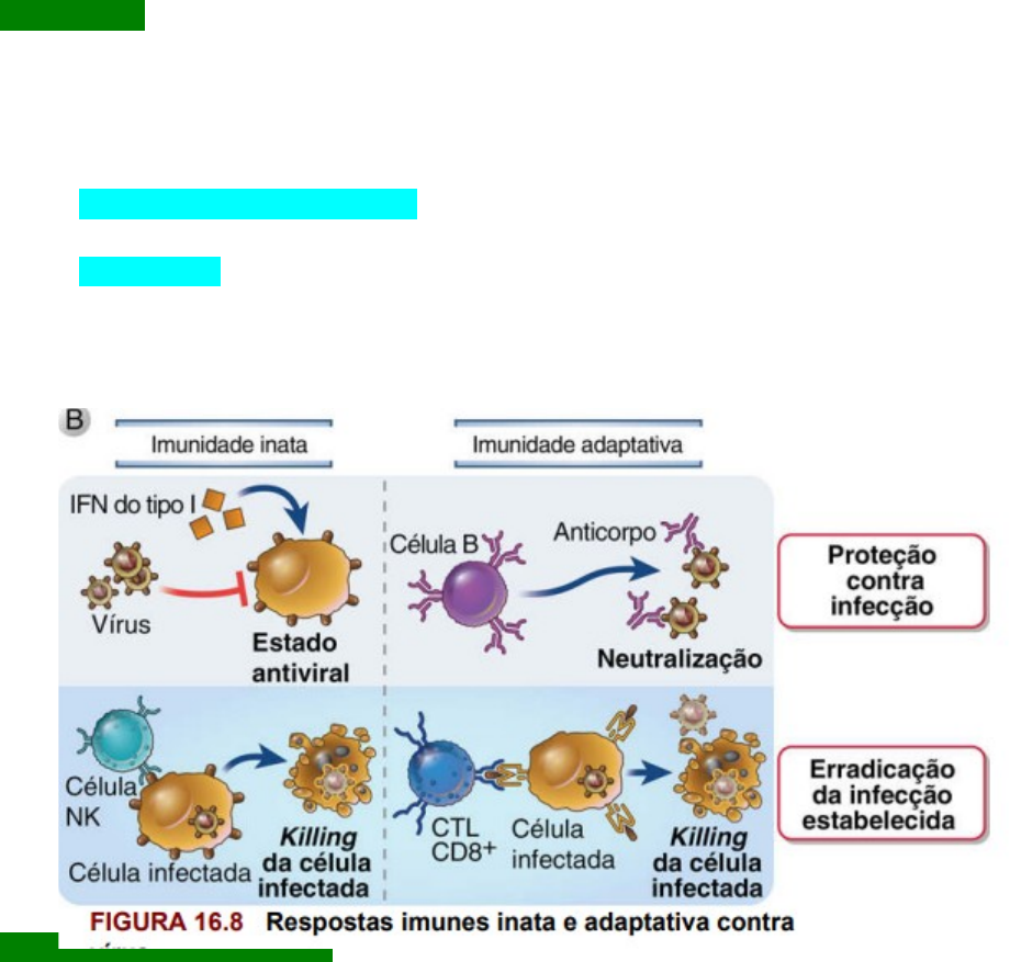 Imunidade aos vírus-Imunologia Introdução: · Os vírus são microrganismos intracelulares obrigatórios usam componentes do ácido nucleico e a maquinaria de síntese proteica do hospedeiro para se replicar · Os vírus infectam vários tipos celulares por endocitose mediada por receptor · Os vírus podem causar lesão tecidual e doenças por diversos mecanismos · Efeito citopático dos vírus: a replicação viral interfere na síntese proteica e na função celular normal leva a lesão morte da célula infectada · Efeito lítico: interferência na replicação da célula hospedeira · Os vírus podem causa respostas inflamatórias que causam danos aos tecidos · Respostas imunes inata e adaptativa aos vírus são destinadas a bloquear a infecção e a eliminar células infectadas Imunidade Inata aos vírus: · Inibição da infecção por interferons do tipo I · Killing das células infectadas mediado por células NK · Infecção por muitos vírus associada à produção de interferons (IFNs) do tipo I pelas células infectadas e por células dendríticas · Vias bioquímicas: · Disparam a produção de IFNs · Reconhecimento de RNA e DNA viral por TLRs endossômicos · Ativação de receptores tipo RIG citoplasmáticos · Essas vias convergemna ativação de proteínas quinases essas proteínas ativam fatores de transcrição IRF que estimulam a transcrição do gene de IFN · IFNs do tipo I atuam inibindo a replicação viral tanto em células infectadas como em células não infectadas · Células NK matam células infectadas por vírus · MHC I frequentemente é “desligada” nas células infectadas por vírus como um mecanismo para escapar dos CTLsisso permite que as células NK matem as células infectadas *A ausência de classe I libera células NK de um estado normal de inibição* Imunidade Adaptativa aos vírus: · É mediada por anticorposque bloqueiam a ligação e a entrada dos vírus nas células hospedeiras · É mediada por CTLs (linfócitos T citotóxicos)eliminam a infecção destruindo as células infectadas · Anticorpos + efetivos são os de alta afinidade produzidos nas reações de centros germinativos T-dependentes · Anticorpos são efetivos contra os vírus durante o estágio extracelular das vidas desses microrganismos · Os vírus podem ser extracelulares: · antes de infectarem as células hospedeiras · quando são liberados das células infectadas por brotamento viral ou com a morte das células infectadas · Anticorpos antiviraisse ligam ao envelope viral ou aos antígenos do capsídeo atuam principalmente como anticorpos neutralizadores (prevenir a fixação e entrada dos vírus nas células hospedeiras) · Anticorposprevinem a infecção inicial e a disseminação célula à célulaneutraliza e podem opsonizar partículas virais (promovendo sua eliminação pelos fagócitos) · Anticorpos secretados do isotipo IgA importante para neutralizar os vírus juntos aos tratos respiratório e intestinal *Imunização oral contra o poliovírusfunciona induzindo a imunidade de mucosa* · Ativação do complemento pode participar da imunidade viral mediada por anticorpoprincipalmente via promoção de fagocitose e pela lise direta dos vírus contendo envelopes lipídicos · Imunidade humoral costuma ser específica para o tipo sorológico (anticorpo-definido) do vírus *Vírus Influenzaa exposição a um tipo sorológico não confere a resistência aos outros sorotipos do vírus* · Eliminação de vírus residentes nas células mediada por CTLs que matam as células infectadas · CTLs (células T CD8) · Reconhecem peptídeos virais citosólicos apresentados por moléculas de MHC classe I · Sofrem intensa proliferação durante a infecção viral · Apresentação cruzada: ocorre quando uma célula infectada for uma célula tecidual, a célula infectada pode ser fagocitada pela célula dendrítica que processa os antígenos virais e os apresenta às células T CD8 naive · Infecções latentes: · O DNA viral persiste nas células hospedeiras, porém o vírus não se replica nem mata as células infectadas · Estado de equilíbrio entre infecção e resposta imune · CTLs podem controlar a infeção, mas são incapazes de erradicá-la · Os vírus podem persistir nas células infectadas por toda a vida · Vírus comuns: Epstein Barr e outros da família do herpesvírus · Reativação da infecção associada à expressão de genes virais responsáveis pelos efeitos citopáticos e pela disseminação do vírus · A deficiência da resposta imunepode resultar falha no controle de uma infecção latente reativada · Lesões teciduais causadas por CTLshepatite viral Imunoevasão por vírus · Os vírus podem alterar seus antígenos e deixarem de ser alvo das respostas imunes · Antígenos afetados são + comumente glicoproteínas de superfícies reconhecidas por anticorpos, porém os epítopos da célula T também podem sofrer variação · Principais mecanismos de ativação antigênicamutações pontuais e o rearranjo dos genomas de RNA que levam à deriva antigênica e à variação antigênica · Deriva genéticaos genomas virais sofrem mutações nos genes codificadores dessas proteínas de superfície · Variação antigênica alterações na estrutura antigênica a partir da recombinação de genes viraisdevido a essa variação um vírus pode se tornar resistente à imunidade gerada na população por infecções prévias *Existem muitos sorotipos de Rinovírus que a vacinação contra o resfriado comum pode não ser uma estratégia preventiva fatível* *HIV-1é capaz de uma tremenda variação antigênica devido a uma elevada taxa de erros na transcrição reversa de seu genoma de RNA durante a reprodução viral* · Alguns vírus inibem a apresentação de antígenos proteicos citosólicos associada ao MHC de classe I · Os vírus produzem várias proteínas que bloqueiam diferentes etapas no processamento, transporte e apresentação do antí