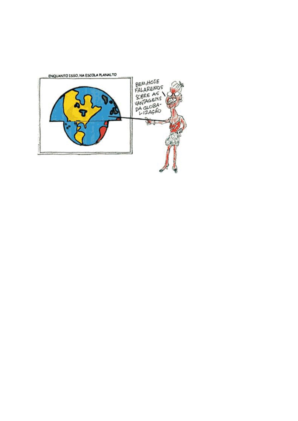 Pergunta 6 0,5 em 0,5 pontos A ilustração de Millôr Fernandes é uma crítica à ordem global atual. Além disso, ela faz referência: Fonte: Millôr Fernandes. In: VESENTINI, José William. Geografia: o mundo em transição. São Paulo: Editora Ática, 2012. p. 323. Respostas: a. À visão eurocêntrica das projeções cartográficas. b. À visão conceitual da globalização realizada no processo de ensino-aprendizagem. c. À forma com que o Planalto Central opera o processo de inserção da globalização no Brasil. d. À Divisão Internacional do Trabalho, em que os países do sul subdesenvolvido são dependentes do norte desenvolvido. e. À influência da globalização sobre o processo de transformação da educação brasileira. Comentário da resposta: Resposta: D Comentário: a charge apresenta uma crítica irônica às supostas “vantagens” da globalização, expressa na fala da professora. O que se vê, na divisão do globo terrestre, com o norte maior que o sul, é a expressão da Divisão Internacional do Trabalho, em que os países do norte desenvolvido estabelecem sua soberania sobre os países do sul subdesenvolvido que menos se beneficia da produção e das tecnologias. NÃO ESQUEÇA DO LIKE