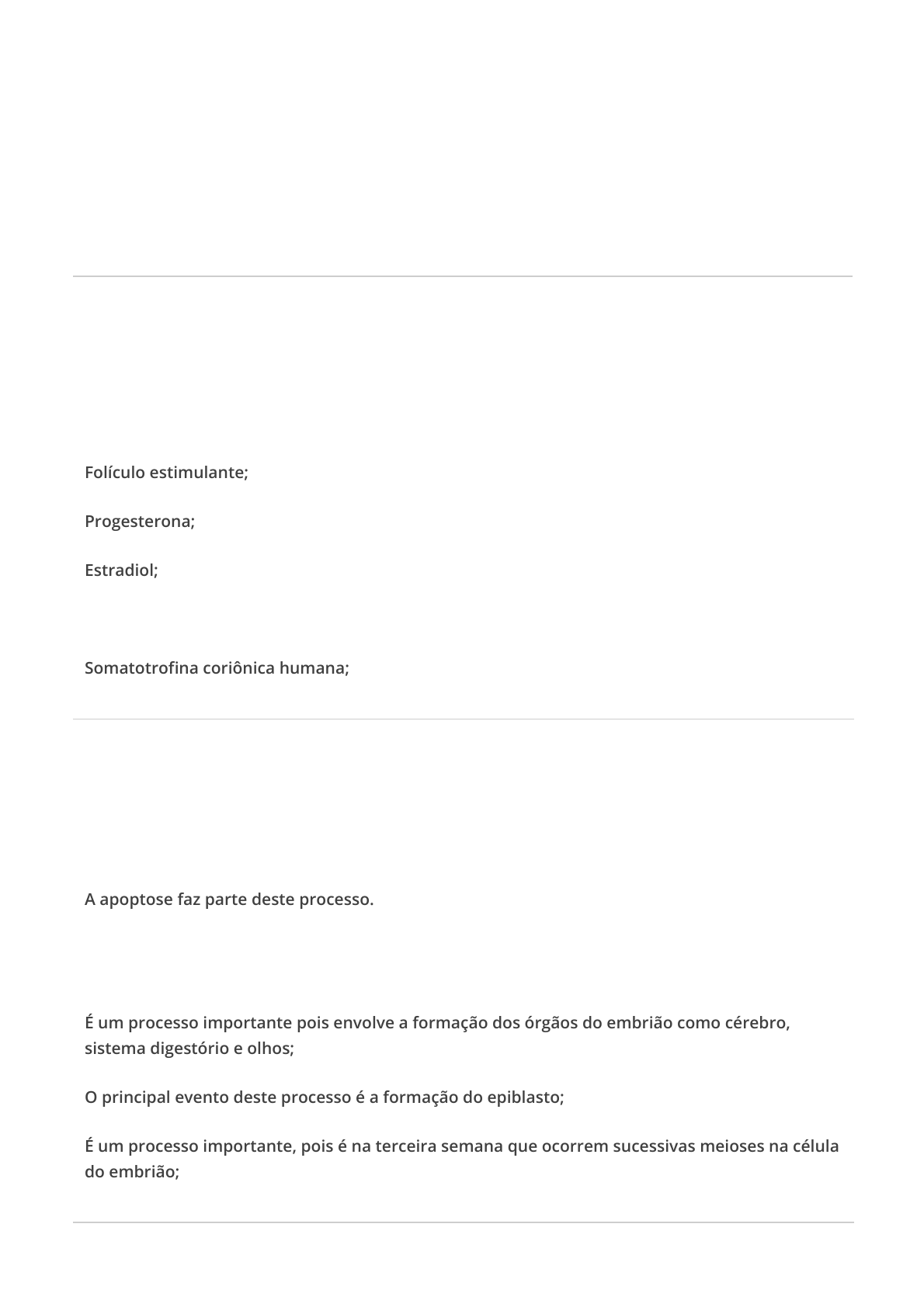 29/06/2021 Comentários https://sereduc.blackboard.com/ultra/courses/_50117_1/outline/assessment/_3418889_1/overview/attempt/_13113910_1/review/inline-feedback?… 1/5 Conteúdo do exercício Pergunta 1 “A __________________ é produzida no início da gravidez, pelo sinciciotrofoblasto e, é ele que estimula a produção de elevados níveis de estrogênio e progesterona pelo corpo lúteo. Assinale a alternativa que preenche corretamente esta lacuna. Folículo estimulante; Progesterona; Estradiol; Resposta corretaGonadotrofina coriônica humana; Somatotrofina coriônica humana; Pergunta 2 Segundo WOLPERT,L. (2010), “O principal evento da terceira semana é a gastrulação (...).” O que ele quis dizer com isto? Assinale a alternativa correta. A apoptose faz parte deste processo. Resposta correta É um processo importante pois envolve movimentos celulares que estabelecem as três camadas germinativas no embrião; É um processo importante pois envolve a formação dos órgãos do embrião como cérebro, sistema digestório e olhos; O principal evento deste processo é a formação do epiblasto; É um processo importante, pois é na terceira semana que ocorrem sucessivas meioses na célula do embrião; 29/06/2021 Comentários https://sereduc.blackboard.com/ultra/courses/_50117_1/outline/assessment/_3418889_1/overview/attempt/_13113910_1/review/inline-feedback?… 2/5 Pergunta 3 O blastocisto consiste em uma camada superficial, o trofoblasto (ou trofoectoderma), e em um pequeno grupo interno de células, o embrioblasto (ou massa celular interna). A massa celular interna é separada da blastocele por processos celulares que se estendem do trofoblasto. O trofoblasto deriva parte da placenta. A placenta é um órgão materno-fetal. Marque a alternativa que melhor exprime a importância da placenta: A placenta só consegue desempenhar suas funções, caso as vilosidades coriônicas estejam amadurecidas. Durante a formação da placenta temos a formação de redes de proteínas responsáveis por manter o feto integro; A placenta é responsável pelo processo da gametogênese; É através da placenta que a mãe consegue interromper o fluxo de sangue durante a gestação; Resposta correta A placenta tem como principais funções a contribuição no metabolismo fetal, transferência e secreção endócrina; Pergunta 4 Embora o feto esteja no corpo da mãe, eles não estão em contato direto. Diante dessa afirmativa podemos dizer que: Resposta corretaIsso deve-se a presença de membranas fetais. Presença da placenta; Deve-se a presença do líquido amniótico; Devido a presença do cordão umbilical; A presença dos folhetos embrionários; Pergunta 5 Nas primeiras semanas da gestação, o saco vitelino é um local transitório de formação. Mas os processos definitivos, entretanto, derivam de uma população de células-tronco observada, inicialmente, na região AGM (aorta-gônadas-mesonefros). A aorta-gônadas-mesonefros, é responsável pela formação de qual processo? Espermatogênese; 29/06/2021 Comentários https://sereduc.blackboard.com/ultra/courses/_50117_1/outline/assessment/_3418889_1/overview/attempt/_13113910_1/review/inline-feedback?… 3/5 Espermatogênese; Resposta corretaHematogênese; Blastogênese; Oogênese; Angiogênese; Pergunta 6 O dobramento no plano longitudinal do corpo faz com que a porção mais cranial do tubo neural projete-se para frente e para baixo, ultrapassando, sobretudo: A área coriônica e a cavidade amniótica; A membrana bucofaríngea e a área neural. A área neural e a membrana placentária; A placa pré-cordal e a área da notocorda; Resposta corretaA membrana bucofaríngea e a área cardiogênica; Pergunta 7 No fim do período embrionário, na oitava semana, o embrião adquire um aspecto humano, então passa a ser denominado, ao iniciar o terceiro mês (na nona semana), de feto. O desenvolvimento durante o período fetal está relacionado com: Formação do sistema digestório; Resposta corretaDiferenciação de tecidos e órgãos; Formação da medula óssea; Diferenciação entre a linha primitiva e o nó primitivo; Diferenciação da notocorda em placa pré-cordal; Pergunta 8 29/06/2021 Comentários https://sereduc.blackboard.com/ultra/courses/_50117_1/outline/assessment/_3418889_1/overview/attempt/_13113910_1/review/inline-feedback?… 4/5 A concentração de células do epiblasto estabelece uma linha mediana e caudal. Na sua extremidade cranial, há um maior acúmulo de células, o nó primitivo (ou nó de Hensen). Com relação ao nós primitivo, marque a alternativa que representa a resposta correta. Resposta corretaÉ um engrossamento terminal da linha primitiva; É um encurtamento terminal da linha caudal. É um engrossamento inicial da linha primitiva; É um filamento terminal da placa pré-cordal; É uma filamento axial inicial da linha primitiva; Pergunta 9 “A formação da _______________ ocorre entre o ectoderma e endoderma pela linha média em direção ao encéfalo, indo até a placa pré-cordal, que não ultrapassa o cérebro anterior. Assinale a alternativa que preenche corretamente esta lacuna. Resposta corretaNotocorda; Pré-corda; Mórula; Linha primitiva; Linha caudal; Pergunta 10 “ A ___________________ , é um polipeptídeo de cadeia simples, atua no crescimento e possui ação lactogênica, é considerado o hormônio do crescimento na gravidez. Assinale a alternativa que preenche corretamente esta lacuna. Estradiol; Resposta corretaSomatotrofina coriônica humana; Insulina. Progesterona; 29/06/2021 Comentários https://sereduc.blackboard.com/ultra/courses/_50117_1/outline/assessment/_3418889_1/overview/attempt/_13113910_1/review/inline-feedback?… 5/5 Gonadotrofina coriônica humana;