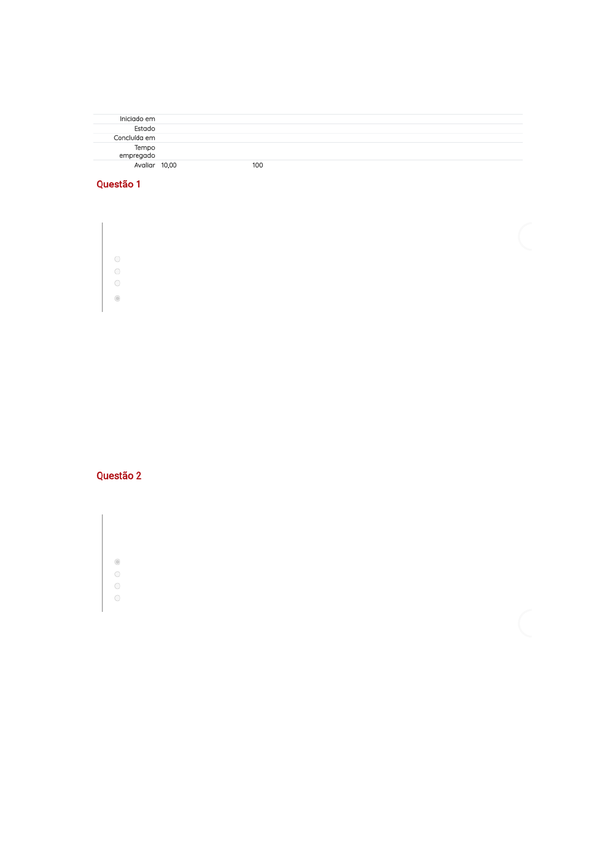Impresso por José Ronaldo, E-mail C.mmirim@hotmal.com para uso pessoal e privado. Este material pode ser protegido por direitos autorais e não pode ser reproduzido ou repassado para terceiros. 22/08/2022 15:15:18 Tuesday, 28 Jun 2022, 09:45 Finalizada Tuesday, 28 Jun 2022, 10:02 17 minutos 16 segundos de um máximo de 10,00( %) Correto Atingiu 1,00 de 1,00 A insulina é o hormônio que regula a concentração de glicose no sangue. Esse hormônio é produzido no(a) Escolha uma opção: a. Tireóide b. Hipóse c. Fígado d. Pâncreas A resposta correta é: Pâncreas Correto Atingiu 1,00 de 1,00 Na placenta é originado alguns hormônios. Dentre eles qual promove o crescimento dos órgãos sexuais da futura mamãe e tecidos do feto? Escolha uma opção: a. Estrogênio b. Somatomamotropina humana c. Progesterona d. Gonadotropina Sua resposta está correta. A resposta correta é: Estrogênio Impresso por José Ronaldo, E-mail C.mmirim@hotmal.com para uso pessoal e privado. Este material pode ser protegido por direitos autorais e não pode ser reproduzido ou repassado para terceiros. 22/08/2022 15:15:18 Correto Atingiu 1,00 de 1,00 Quando se come um cozido, as batatas e a carne começam a ser digeridas, respectivamente: Escolha uma opção: a. No estômago e na boca. b. No estômago e no duodeno. c. Na boca e no duodeno. d. no duodeno e no estômago. e. Na boca e no estômago. A resposta correta é: Na boca e no estômago. Correto Atingiu 1,00 de 1,00 Que tipo de contração o músculo liso gastrintestinal exibe bem como contrações rítmicas, sendo ela contínua, não estando associada a modulação elétrica básica de ondas lentas, mas quase sempre duram de minutos a horas? Escolha uma opção: a. Contração Tônica b. Contração Muscular c. Contração Isométrica d. Contração Isotônica Sua resposta está correta. A resposta correta é: Contração Tônica Impresso por José Ronaldo, E-mail C.mmirim@hotmal.com para uso pessoal e privado. Este material pode ser protegido por direitos autorais e não pode ser reproduzido ou repassado para terceiros. 22/08/2022 15:15:18 Correto Atingiu 1,00 de 1,00 Existem inúmeras características que nos permitem diferenciar a matéria viva da inanimada. A característica “O ser vivo é capaz de manter a constância do meio interno” é identicada como: Escolha uma opção: a. nutrição b. metabolismo c. irritabilidade d. homeostase A resposta correta é: homeostase Correto Atingiu 1,00 de 1,00 Quando falamos em homeostase, referimo-nos à tendência do organismo de manter o meio interno em relativa estabilidade. Entende-se por meio interno: Escolha uma opção: a. o conjunto de todos os sistemas do organismo. b. os uidos que circulam pelas nossas células. c. o interior dos órgãos. d. o conjunto de todas as células do corpo. A resposta correta é: os uidos que circulam pelas nossas células. Impresso por José Ronaldo, E-mail C.mmirim@hotmal.com para uso pessoal e privado. Este material pode ser protegido por direitos autorais e não pode ser reproduzido ou repassado para terceiros. 22/08/2022 15:15:18 Correto Atingiu 1,00 de 1,00 Qual a unidade do sistema renal a qual se adapta mesmo quando existe a retirada de um rim? Escolha uma opção: a. capsula de browman b. N.D.A c. capilares d. néfron Sua resposta está correta. A resposta correta é: néfron Correto Atingiu 1,00 de 1,00 Quando há um excesso de eliminação de urina é chamado ______________,que serão eliminados de 50 a 250ml de urina por dia, e quando há uma diminuição do débito urinário é chamado de _______________,que são menos de 50ml de urina eliminada por dia. Escolha uma opção: a. oliguria e anuria b. desidratação e hiperdratação c. N.D.A d. litíase renal e nefronlise Sua resposta está correta. A resposta correta é: oliguria e anuria Impresso por José Ronaldo, E-mail C.mmirim@hotmal.com para uso pessoal e privado. Este material pode ser protegido por direitos autorais e não pode ser reproduzido ou repassado para terceiros. 22/08/2022 15:15:18 Correto Atingiu 1,00 de 1,00 A atividade do espermatozoide é muito aumentada em meio ___________ ou ligeiramente _______________como o existente no sêmen ejaculado, mas é muito deprimida em meio ligeiramente _______________. Meio fortemente ácido pode causar a morte rápida do espermatozoide Escolha uma opção: a. Acido, básico e ácido b. Básico, ácido e alcalino c. Alcalino, ácido e básico d. Neutro, alcalino e ácido Sua resposta está correta. A resposta correta é: Neutro, alcalino e ácido Correto Atingiu 1,00 de 1,00 Em humanos, a espermatogênese e a ovulogênese apresentam eventos citológicos e genéticos correspondentes. Considerando eventos normais, assinale a alternativa que não é exemplo de correspondência entre as duas gametogêneses: Escolha uma opção: a. Ocorrência de vários ciclos de mitose nas ovogônias (espermatogônias e ovogônias). b. Alteração de tamanho nas células que formam os gametas. c. Proporcionalidade de gametas viáveis produzidos. d. Presença de células diploides em cito-I (espermatócito I e ovócito I). A resposta correta é: Proporcionalidade de gametas viáveis produzidos. ATIVIDADE ANTERIOR Avaliação Formativa I PRÓXIMA ATIVIDADE AP3.1 Avaliação Formativa Processual