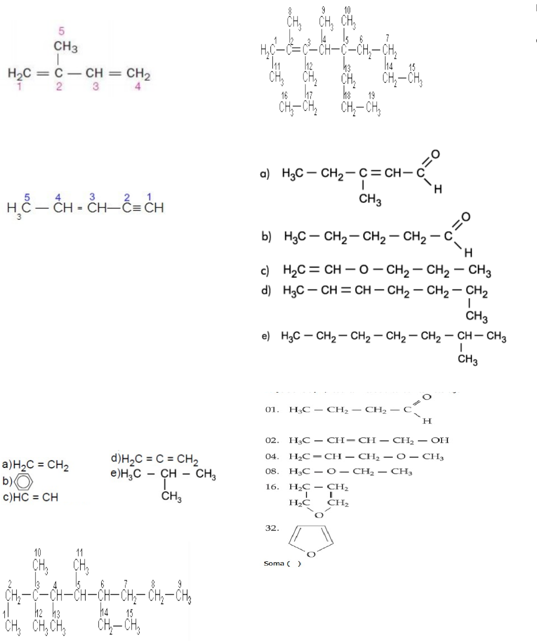 1. Na estrutura representada a seguir, os carbonos numerados são, respectivamente: a) sp2, sp, sp2, sp2, sp3. b) sp, sp3, sp2, sp, sp4. c) sp2, sp2, sp2, sp2, sp3. d) sp2, sp, sp, sp2, sp3. e) sp3, sp, sp2, sp3, sp4. 2. (UFV MG) Considere a fórmula estrutural abaixo: São feitas as seguintes afirmativas: I. O átomo de carbono 5 forma 4 ligações (sigma) II. O átomo de carbono 3 forma 3 ligações (sigma) e 1 ligação (pi). III. O átomo de carbono 2 forma 3 ligações (pi) e 1 ligação (sigma) IV. O total de ligações (pi) na estrutura é igual a 3. Assinale a alternativa CORRETA: a) Todas as afirmativas são corretas. b) Apenas as afirmativas I e II são corretas. c) Apenas as afirmativas I, II e IV são corretas. d) Apenas as afirmativas I e IV são corretas. e) Apenas as afirmativas II e III são corretas. 3. (UFRGS-RS) O hidrocarboneto que apresenta todos os átomos de carbono com orientação espacial tetraédrica é o: 4. Identifique quais são os carbonos primários, secundários e terciários nos compostos a seguir : primário : secundário terciário : quaternário : primário : secundário terciário : quaternário : 5. (UF-SC) A cadeia carbônica insaturada, homogênea, ramificada é: 6. (UCG-GO) Apresentam cadeia carbônica heterogênea e insaturada os compostos: 7. (UFV-MG) Considerando os compostos abaixo: I) H3C(CH2)3CH3 IV) CH3CH2CH(OH)CH3 II) C(CH3)3CH2CH3 V) H3CCHBrCHBrCH3 III) H3CCH2CH(CH3)2 São cadeias carbônicas ramificadas: a) I e II d) I, IV e V b) II e IV e) II, III, IV e V c) II e III 8. (Fuvest-SP) A vitamina K3 pode ser representada pela fórmula a seguir. Determine a fórmula molecular deste composto. 9. (PUC-RJ) Um grupo de compostos, denominado ácidos graxos, constitui a mais importante fonte de energia na dieta do Homem. Um exemplo destes é o ácido linoleico, presente no leite humano. A sua fórmula estrutural simplificada é: CH3(CH2)4(CH)2CH2(CH)2(CH2)7COOH Sua cadeia carbônica é classificada como: a) Aberta, normal, saturada e homogênea. b) Aberta, normal, insaturada e heterogênea. c) Aberta, ramificada, insaturada e heterogênea. d) Aberta, ramificada, saturada e homogênea. e) Aberta, normal, insaturada e homogênea. 10. (PUC-RS) Classifique as cadeias abaixo: