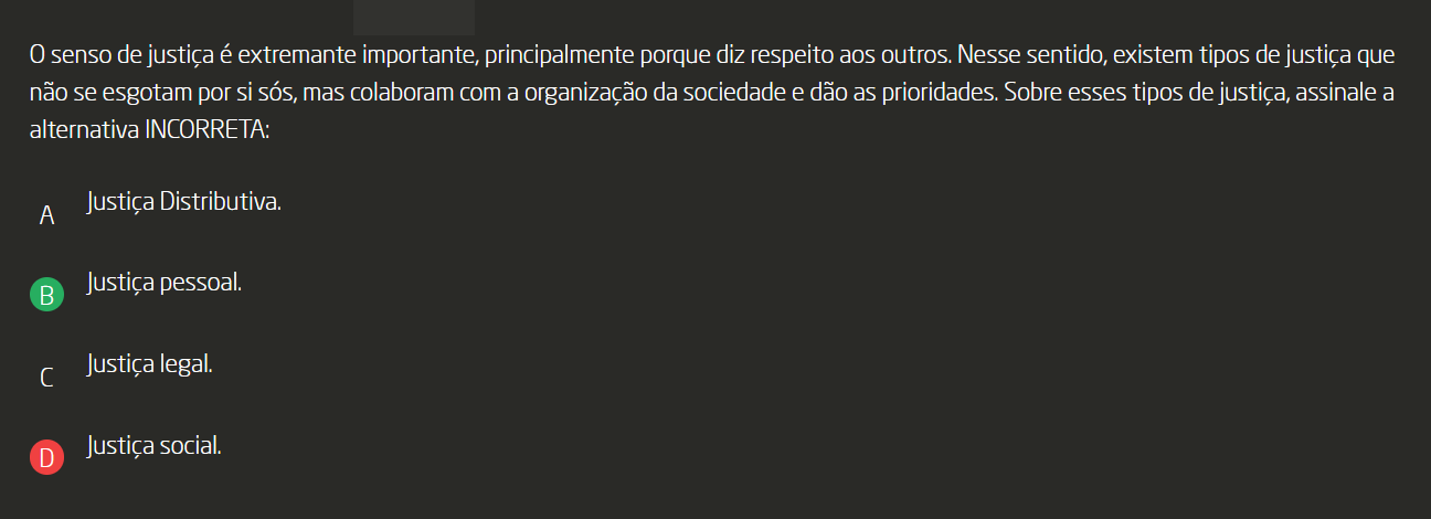 0 senso de justiça é extremante importante, principalmente porque diz respeito aos outros. Nesse sentido, existem tipos de justiça que não se esgotam por si sós, mas colaboram com a organização da sociedade e dão as prioridades. Sobre esses tipos de justiça, assinale a alternativa INCORRETA: A Justiça Distributiva. B Justiça pessoal. C legal. D social.