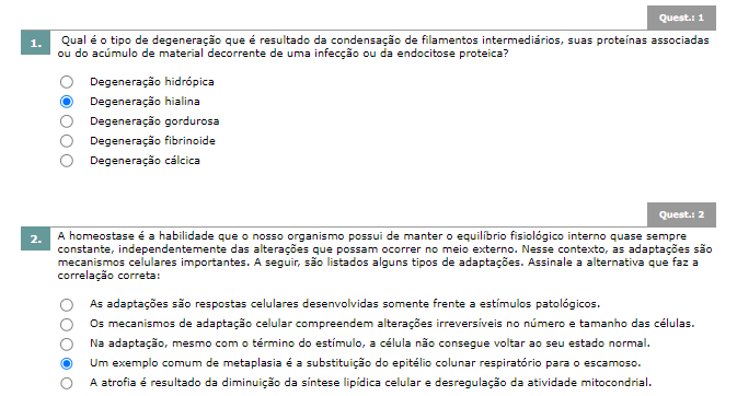 Qual é tipo de degeneração que é resultado da condensação de filamentos intermediários, suas proteínas associadas ou do de material decorrente de uma infecção ou da endocitose proteica? Degeneração hidrópica Degeneração hialina Degeneração gordurosa Degeneração fibrinoide Degeneração cálcica