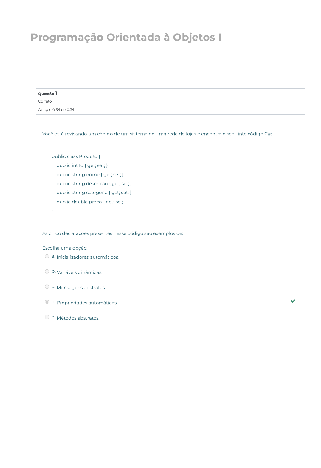 Programação Orientada à Objetos I Questão 1 Correto Atingiu 0,34 de 0,34 Você está revisando um código de um sistema de uma rede de lojas e encontra o seguinte código C#: public class Produto { public int Id { get; set; } public string nome { get; set; } public string descricao { get; set; } public string categoria { get; set; } public double preco { get; set; } } As cinco declarações presentes nesse código são exemplos de: Escolha uma opção: a. Inicializadores automáticos. b. Variáveis dinâmicas. c. Mensagens abstratas. d. Propriedades automáticas. e. Métodos abstratos. Questão 2 Correto Atingiu 0,34 de 0,34 Questão 3 Correto Atingiu 0,34 de 0,34 Na linguagem de programação C#, a declaração dos tipos e de seus membros permite que seja determinada a sua visibilidade por meio de modi�cadores de acesso. Os modi�cadores disponíveis para esse �m são: Escolha uma opção: a. full-access, write, write-only, read e read-only. b. public, private, protected, internal e protected internal. c. default, open, closed, partial e full. d. global, local, nested e virtual. e. public, private, published e protected. Em programação orientada a objetos, qual o tipo de controle de acesso que permite que um método seja acessado apenas pela classe que o criou ou por todas as suas dependentes? a. Protected b. Public c. Private d. Nenhuma das outras alternativas e. Default Questão 4 Correto Atingiu 0,34 de 0,34 Questão 5 Correto Atingiu 0,34 de 0,34 O seu app importou de um arquivo texto uma string de 1500 caracteres. O problema é que você deve veri�car se todos os caracteres são válidos. Para isto você criou um método minhaString.veri�caCaracter() que veri�ca o caractere que está sendo lido da string importada. Para ir do primeiro caracter ao último, os limites inferior e superior do indice são: Escolha uma opção: a. 1 e 1500. b. 1 e 1501. c. 1 e 1499. d. 0 e 1500. e. 0 e 1499. Você está desenvolvendo um sistema de cadastro de pessoas cujo número de telefone é fornecido por uma string. Você irá contruir uma expressão regular que veri�que se o caracter que está sendo lido é um decimal (a classe de caracter é \d) e o formato é ##-####-####. A sintaxe da classe de caracter é \d{número de digitos). Logo, \d{3} é igual a ###. Lembre-se que para colocar carateres especiais em uma string você deve usar \ (contra-barra). Para comparar você utilizará System.Text.RegularExpressions.Regex.IsMatch . Qual é a expressão regular correta para fazer esta comparação? Escolha uma opção: a. "^\d{4}-\d{4}-\d{4}$" b. "^\\d{3}-\\d{4}-\\d{4}$" c. "^\\d{2}-\\d{4}-\\d{4}$" d. "^\\d{4}-\\d{4}-\\d{4}$" e. "^\d{2}-\d{4}-\d{4}$"