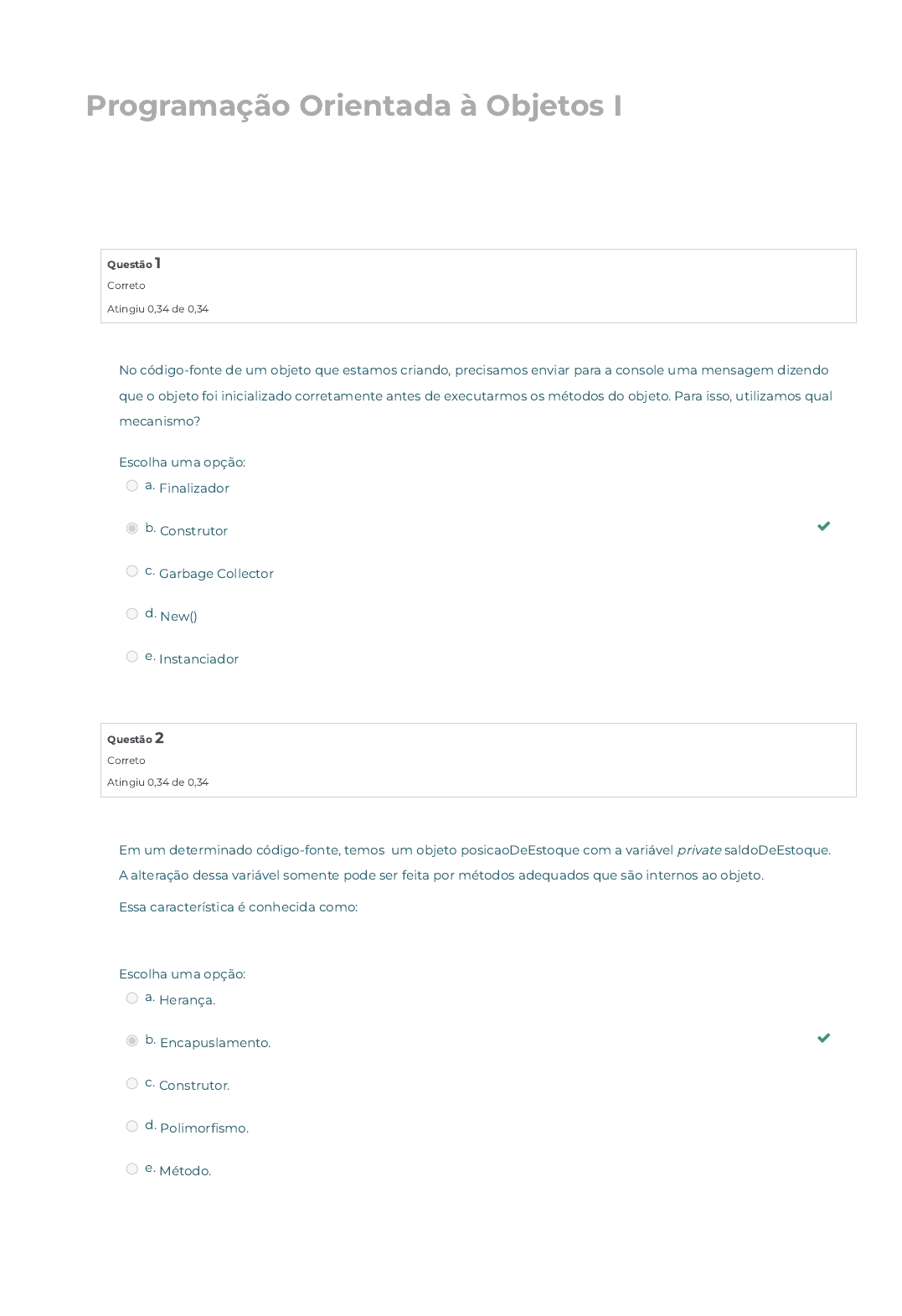 Programação Orientada à Objetos I Questão 1 Correto Atingiu 0,34 de 0,34 Questão 2 Correto Atingiu 0,34 de 0,34 No código-fonte de um objeto que estamos criando, precisamos enviar para a console uma mensagem dizendo que o objeto foi inicializado corretamente antes de executarmos os métodos do objeto. Para isso, utilizamos qual mecanismo? Escolha uma opção: a. Finalizador b. Construtor c. Garbage Collector d. New() e. Instanciador Em um determinado código-fonte, temos um objeto posicaoDeEstoque com a variável private saldoDeEstoque. A alteração dessa variável somente pode ser feita por métodos adequados que são internos ao objeto. Essa característica é conhecida como: Escolha uma opção: a. Herança. b. Encapuslamento. c. Construtor. d. Polimor�smo. e. Método. Questão 3 Correto Atingiu 0,34 de 0,34 Questão 4 Correto Atingiu 0,34 de 0,34 Dada uma classe A que possui variáveis e métodos, e uma classe B que herda da classe A essas características, podemos dizer que: Escolha uma opção: a. A é polimór�co de B. b. A encapsula B. c. B é subclasse de A. d. B encapsula A. e. A é subclasse de B. Em um sistema de controle de meios de transporte, temos o objeto meioDeTransporte e a função calculaVelocidade. No entanto, essa função foi escrita originalmente para calcular a velocidade em m/s. Agora, precisamos criar um objeto barco, cuja velocidade é em nós. Para fazer isso, criamos um objeto embracacoes, que herda da classe meioDeTransporte, e reescrevemos a função calculaVelocidade, para calcular a velocidade em nós. Em PO, o mecanismo que se utiliza para reescrever o método de uma superclasse para que o este método seja adequado às necessidades do novo objeto instanciado chama-se: Escolha uma opção: a. Sobrecarga. b. Herança. c. Revisão de método. d. Relacionamento entre classes. e. Polimor�smo. Questão 5 Correto Atingiu 0,34 de 0,34 Dado um sistema em execução com mil objetos no seu código. Vários objetos são criados o tempo todo. Se não houvesse um mecanismo para liberar memória em pouco tempo, o servidor de aplicação pararia. Para liberar a memória, o sistema executa um mecanismo que é executado quando o objeto não é mais utilizado. Esse mecanismo gerencia a liberação e alocação de memória do aplicativo. Qual método do objeto é invocado quando o mecanismo acima citado atua? Escolha uma opção: a. Finalizador b. Garbage Collector c. Liberação de memória d. Sobrecarga e. Construtor