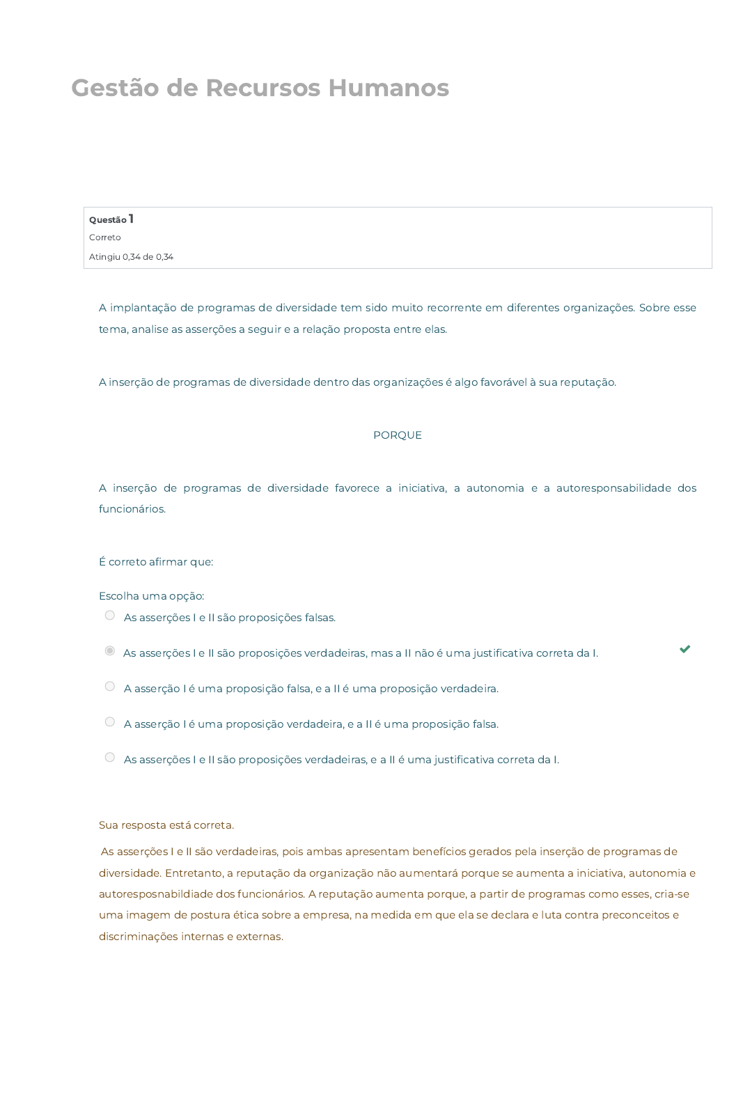 Gestão de Recursos Humanos Questão 1 Correto Atingiu 0,34 de 0,34 A implantação de programas de diversidade tem sido muito recorrente em diferentes organizações. Sobre esse tema, analise as asserções a seguir e a relação proposta entre elas. A inserção de programas de diversidade dentro das organizações é algo favorável à sua reputação. PORQUE A inserção de programas de diversidade favorece a iniciativa, a autonomia e a autoresponsabilidade dos funcionários. É correto a�rmar que: Escolha uma opção: As asserções I e II são proposições falsas. As asserções I e II são proposições verdadeiras, mas a II não é uma justi�cativa correta da I. A asserção I é uma proposição falsa, e a II é uma proposição verdadeira. A asserção I é uma proposição verdadeira, e a II é uma proposição falsa. As asserções I e II são proposições verdadeiras, e a II é uma justi�cativa correta da I. Sua resposta está correta. As asserções I e II são verdadeiras, pois ambas apresentam benefícios gerados pela inserção de programas de diversidade. Entretanto, a reputação da organização não aumentará porque se aumenta a iniciativa, autonomia e autoresposnabildiade dos funcionários. A reputação aumenta porque, a partir de programas como esses, cria-se uma imagem de postura ética sobre a empresa, na medida em que ela se declara e luta contra preconceitos e discriminações internas e externas. Questão 2 Correto Atingiu 0,34 de 0,34 Elancers, empresa de sistemas de recrutamento e seleção, em pesquisa realizada com 10 mil empresas, declarou o seguinte resultado: 1 em cada 5 empresas não contrataria homossexuais para determinados cargos. Fonte: Adaptado de <http://g1.globo.com/concursos-e-emprego/noticia/2015/05/1-em-cada-5-empresas-nao- contrataria-homossexuais-diz-estudo.html>; . Sobre o resultado apresentado pela pesquisa da Elancers, é correto a�rmar que: Escolha uma opção: Demonstra a discriminação por sexo existente dentro das organizações. Ressalta a importância de haver mais ações a�rmativas para a contratação de homosexuais. Prova que a comunidade LGBT sofre mais preconceitos que as outras minorias. Fortalece o preconceito sofrido pela comunidade LGBT, no que diz respeito a postos de trabalho. Minimiza o problema enfrentado pelos homessexuais no ambiente organizacional. Sua resposta está correta. Os resultados não fortalecem o preconceito sofrido pela comunidade LGBT, apenas demonstram que existe discriminação contra homosexuais e, por isso, é importante ações a�rmativas voltadas para a contratação destes pro�ssionais. http://g1.globo.com/concursos-e-emprego/noticia/2015/05/1-em-cada-5-empresas-nao-contrataria-homossexuais-diz-estudo.html%3E Questão 3 Correto Atingiu 0,34 de 0,34 Leia a seguinte reportagem: Um homem negro que tentava entrar em uma agência do Banco do Brasil de Cuiabá (MT) foi coagido e humilhado por dois gerentes e o caso acabou na delegacia. De acordo com o Boletim de Ocorrência (BO), o cliente não estava conseguindo entrar na agência pela porta giratória de segurança. Do lado de dentro da agência, o gerente do banco proferiu a seguinte frase, em voz alta: “Avisa a este mulato que ele só vai entrar quando tirar todos os metais do bolso”. Um outro cliente que estava dentro da agência �cou indignado e questionou a falta de respeito, dizendo que o gerente não poderia ter dito aquilo. O gerente, então, rebateu dizendo que “um negro como aquele nem que tivesse só uma moeda no bolso, não entraria”. Fonte: Adaptado de https://www.pragmatismopolitico.com.br/2017/07/homem-negro-e-humilhado-por-gerentes-do- banco-do-brasil.html. 06/07/2017. Acesso em 21/12/2018. Diante do exposto, analise as seguintes a�rmações: O gerente do banco estava certo em sua conduta, pois estava apenas tentando proteger a agência de um possível roubo. Nota-se claramente uma postura discriminatória do gerente, que deveria ser punido pela sua postura. O gerente foi rude, mas , neste caso, não houve discriminação, pois não houve nada que o gerente tenha falado que pudesse ofender o homem negro. O banco deveria estar atento à postura dos seus funcionários, submetendo-os a um treinamento sobre diversidade. É correto o que se a�rma apenas em: Escolha uma opção: II e IV. I e II. I e IV. II e III. III e IV. Sua resposta está correta. No caso exposto, veri�ca-se uma ação discriminatória em relação ao negro, por isso, o banco deve prestar mais atenção nas condutas dos seus funcionários, tomando ações que possam evitar este tipo de comportamento. https://www.pragmatismopolitico.com.br/2017/07/homem-negro-e-humilhado-por-gerentes-do-banco-do-brasil.html Questão 4 Correto Atingiu 0,34 de 0,34 Há uma grande di�culdade enfrentada por indivíduos com algum tipo de de�ciência para conseguir ingressar no mercado de trabalho. Sobre este tipo de discriminação, é correto a�rmar: Escolha uma opção: O Estado instituiu a lei nº 8.213, de 24 de julho de 1991, que estabelece uma cota de vagas para pessoas com de�ciência, em função do número de empregados da empresa. O problema enfrentado pelos de�cientes é de caráter educacional, não passa pelas questões empregatícias. O Estado deveria se preocupar mais em oferecer possibilidade de habilitação e reabilitação para este público, ao invés de estabelecer cotas. A pessoa com de�ciência não sofre o mesmo preconceito que as demais minorias; o problema é estrutural, isto é, as empresas não têm como adaptar suas estruturas físicas para recebê-los. A lei de cotas para de�cientes físicos dentro das organizações diminuem a dignidade destas pessoas, que se veem inferiorizadas por leis como estas. Sua resposta está correta. A lei nº 8.213, de 24 de julho de 1991, estabelece a obrigatoriedade de contratação de de�cientes, em um número percentual que varia de acordo com a quantidade de funcionários que a e
