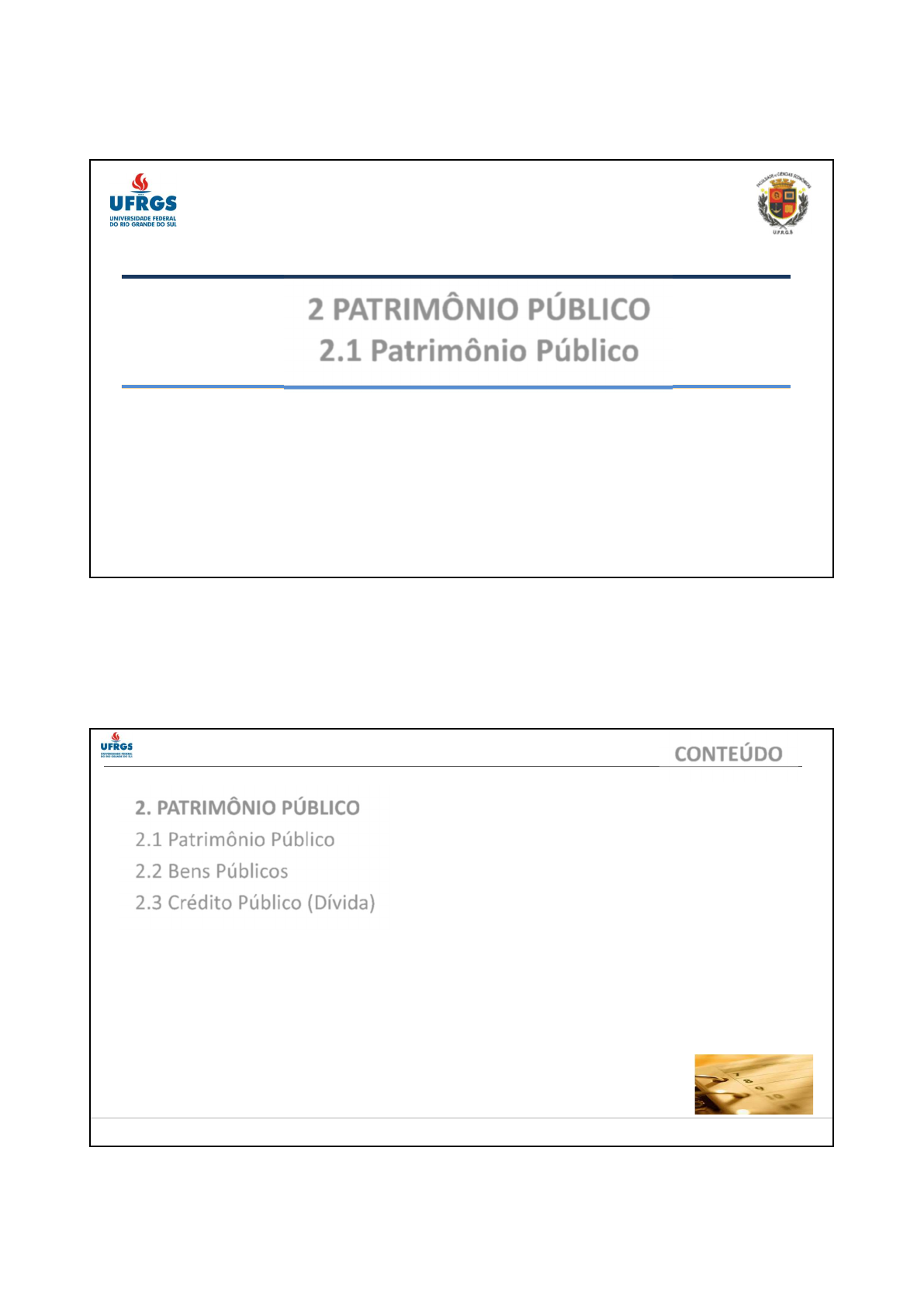 Contabilidade Governamental I Universidade Federal do Rio Grande do Sul Faculdade de Ciências Econômicas Departamento de Ciências Contábeis e Atuariais 2 PATRIMÔNIO PÚBLICO 2.1 Patrimônio Público Prof. Diego de Oliveira Carlin Prof. Diego de Oliveira Carlin Contabilidade Governamental I CONTEÚDO 2. PATRIMÔNIO PÚBLICO 2.1 Patrimônio Público 2.2 Bens Públicos 2.3 Crédito Público (Dívida) Prof. Diego de Oliveira Carlin Contabilidade Governamental I CONTEÚDO 2. PATRIMÔNIO PÚBLICO 2.1 Patrimônio Público 2.2 Bens Públicos 2.3 Crédito Público (Dívida) Prof. Diego de Oliveira Carlin Contabilidade Governamental I CONTEÚDO PARA FINS DIDÁTICOS AS CITAÇÕES NÃO SERÃO SEMPRE LITERAIS. FONTES PRINCIPAIS: • MCASP 9.º Edição (Secretaria do Tesouro Nacional) • SECRETARIA DO TESOURO NACIONAL. Alinhamento Pedagógico (2020) • PESAVENTO, Roberto. “Cadernão” de Contabilidade Governamental . Vol. I LEGISLAÇÃO • BRASIL: Lei 4.320/64 – Direito Financeiro, Orçamento e Contabilidade Público • CFC: Normas Brasileiras Técnicas – Setor Público (NBC T SP) Prof. Diego de Oliveira Carlin Contabilidade Governamental I CONTEÚDO 2.1 PATRIMÔNIO PÚBLICO 2.1.1 Definições 2.1.2 Características 2.1.3 Enfoque Patrimonial 2.1.4 Enfoque Orçamentário 2.1.5 Receitas e Despesas: Enfoque orçamentário e Patrimonial Prof. Diego de Oliveira Carlin Contabilidade Governamental I CONTEÚDO 2.1 PATRIMÔNIO PÚBLICO 2.1.1 Definições 2.1.2 Características 2.1.3 Enfoque Patrimonial 2.1.4 Enfoque Orçamentário 2.1.5 Receitas e Despesas: Enfoque orçamentário e Patrimonial Prof. Diego de Oliveira Carlin Contabilidade Governamental I 2.1 PATRIMÔNIO PÚBLICO 2.1.1. Definições Patrimônio Público é o conjunto de direitos e bens, tangíveis ou intangíveis, onerados ou não, adquiridos, formados, produzidos, recebidos, mantidos ou utilizados pelas entidades do setor público, que seja portador ou represente um fluxo de benefícios, presente ou futuro, inerente à prestação de serviços públicos ou à exploração econômica por entidades do setor público e suas obrigações. (Resolução CFC Nº 1.129, de 21 de novembro de 2008, revogada) O conjunto de bens, direitos e obrigações avaliáveis em moeda corrente, das entidades que compõem a Administração Pública (KOHAMA, 2009, p. 11) (PESAVENTO, p. 6) Patrimônio público, como objeto da CASP, deve ser entendido aqui em sentido amplo, contemplando fatos financeiros, orçamentários, contábeis e patrimoniais. Prof. Diego de Oliveira Carlin Contabilidade Governamental I CONTEÚDO 2.1 PATRIMÔNIO PÚBLICO 2.1.1 Definições 2.1.2 Características 2.1.3 Enfoque Patrimonial 2.1.4 Enfoque Orçamentário 2.1.5 Receitas e Despesas: Enfoque orçamentário e Patrimonial Prof. Diego de Oliveira Carlin Contabilidade Governamental I 2.1 PATRIMÔNIO PÚBLICO (PESAVENTO, p. 11) ESTUDO QUALITATIVO ESTUDO QUANTITATIVO DEFINIÇÃO O patrimônio é considerado um conjunto complexo de bens ou meios econômicos, como os valores, créditos e dívidas, heterogêneos e coordenadamente dispostos, à disposição do Estado em um dado momento histórico DEFINIÇÃO Quantitativamente ou financeiramente, o patrimônio é considerado um fundo de valores decorrente da atribuição de uma medida comum, a moeda, a todos os elementos patrimoniais positivos e negativos OBJETIVO Qualidade funcional das contas: a natureza das contas, as categorias, classes ou espécies, a função e o funcionamento OBJETIVO Expressão Monetária das Contas O patrimônio é constituído pelos elementos Ativo e Passivo que o formam, e esses elementos devem ser avaliados com uma única medida, a moeda, de modo que possam ser reduzidos a uma única expressão numérica; o patrimônio, então, é definido como um fundo de valores. 2.1.2. Características: a) Aspectos Qualitativo e Quantitativo Prof. Diego de Oliveira Carlin Contabilidade Governamental I 2.1 PATRIMÔNIO PÚBLICO (PESAVENTO, p. 11) Qualitativa Medida Comum Quantitativa Bens Créditos Obrigações Moeda Fundo de Valores APLICAÇÃO DOS RECURSOS ORIGEM DOS RECURSOS Ativo Capitais de Terceiros Capitais Próprios 2.1.2. Características: a) Aspectos Qualitativo e Quantitativo Prof. Diego de Oliveira Carlin Contabilidade Governamental I 2.1 PATRIMÔNIO PÚBLICO (PESAVENTO, p. 11) A - Bens Numerários São os recursos de Caixa, como os valores em espécie ou dinheiros, cheques, ordens de pagamento, bem como os depósitos bancários de livre movimentação, depósitos bancários vinculados a determinadas operações. B - Créditos de Tesouraria São os créditos de curtíssimo prazo, basicamente de natureza extra orçamentária, que são inscritos no grupo Realizável do Ativo Financeiro. C - Bens de Uso Refere-se aos bens de uso continuado, os de uso especial, destinados a servir de instrumento material dos serviços públicos. São os bens utilizados pelas repartições públicas, na realização da atividade administrativa; são constituídos de móveis e imóveis. D - Bens para Transformação São os bens ou equipamentos industriais utilizados na produção de outros bens, de consumo ou não (móveis), como uma fábrica de ração, marcenaria, matadouro, etc. E - Bens de Renda São bens que produzem rendas ou Receitas Patrimoniais, como dividendos, juros, “aluguéis”, etc., e as contas que as produzem estão em diversos grupos do Ativo. F - Bens de Uso Comum do Povo São os bens de livre fruição do povo, como os mares, rios, ruas, avenidas, praças públicas, viadutos, pontes, etc. Nunca foram patrimoniados, mas agora, esses bens começam a ter tratamento diferente do passado. 2.1.2. Características: b) Elementos Positivos Prof. Diego de Oliveira Carlin Contabilidade Governamental I 2.1 PATRIMÔNIO PÚBLICO (PESAVENTO, p. 11) G - Créditos de Funcionamento São os créditos a receber decorrentes das atividades normais da entidade perante outras pessoas físicas ou jurídicas, que não sejam decorrentes