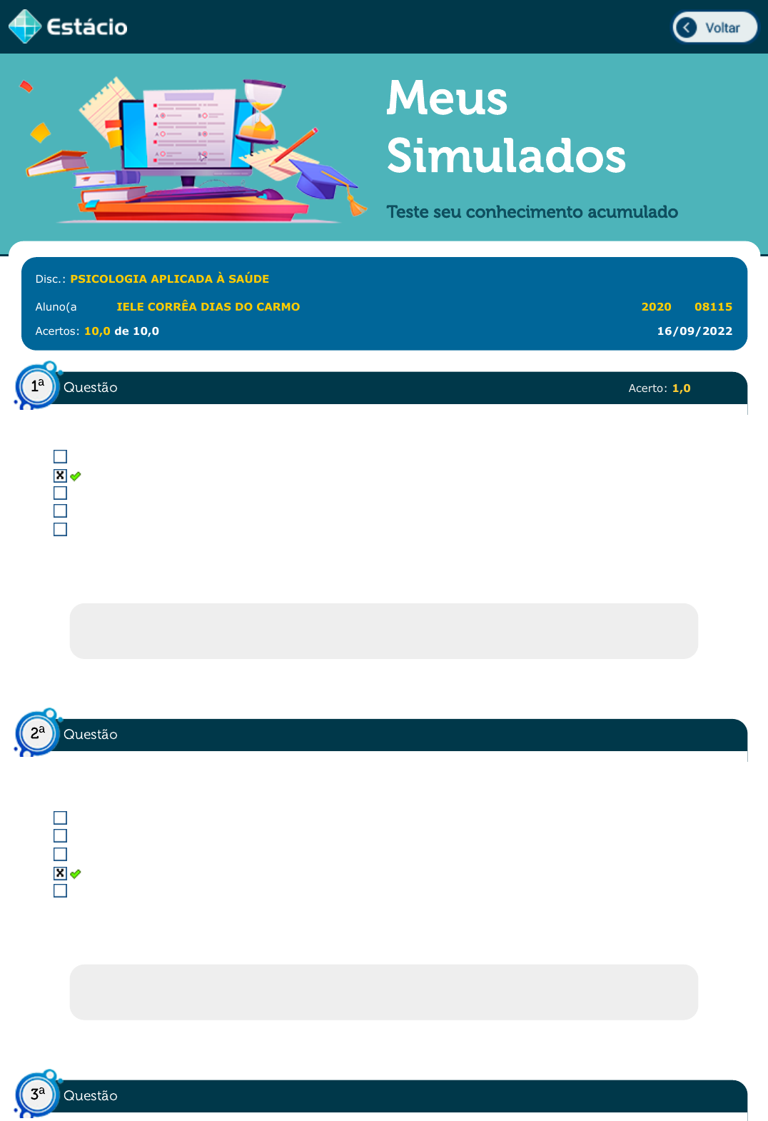 Meus Simulados Teste seu conhecimento acumulado Disc.: PSICOLOGIA APLICADA À SAÚDE Aluno(a): DANIELE CORRÊA DIAS DO CARMO 202004108115 Acertos: 10,0 de 10,0 16/09/2022 Acerto: 1,0 / 1,0 A palavra Biopsicossocial é a combinação de outras três palavras, são elas: Biológico + Psiquiátrico + Socioeconômico Biológico + Psicológico + Social Bioético + Psicológico + Social Biológico + Psicológico + Socioemocional Biológico + Psiquiátrico + Social Respondido em 16/09/2022 18:17:52 Explicação: A resposta correta é: Biológico + Psicológico + Social Acerto: 1,0 / 1,0 Nos anexos da resolução n° 02/01 do Conselho Federal de Psicologia, há a descrição das atribuições do psicólogo especialista em Psicologia Hospitalar. Não é uma atribuição do psicólogo hospitalar: Atender familiares. Atender os responsáveis pelo paciente. Atender pacientes. Atender os filhos do médico que estejam precisando de terapia. Atender membros da equipe multiprofissional. Respondido em 16/09/2022 18:18:23 Explicação: A resposta correta é: Atender os filhos do médico que estejam precisando de terapia. Acerto: 1,0 / 1,0 Questão1 a Questão2 a Questão3 a https://simulado.estacio.br/alunos/inicio.asp javascript:voltar(); Usuário Destacar Há duas vertentes que compreendem o problema mente e corpo de formas distintas: o monismo e o dualismo. NÃO é uma característica do dualismo: A compreensão da mente e do corpo como instâncias únicas Compreensão da mente e do corpo como instâncias separadas Tem como representantes Platão e Descartes A total inexistência da relação entre mente e corpo A crença de que os animais possuem apenas corpo Respondido em 16/09/2022 18:18:46 Explicação: A resposta correta é: A compreensão da mente e do corpo como instâncias únicas Acerto: 1,0 / 1,0 Existem divergências com relação a base conceitual do estresse, mas esta pergunta deve ser respondida utilizando a proposta apresentada pelo modelo Trifásico de Selye, no qual, o estresse pode progredir e percorrer as 3 fases do modelo, quais são elas: Inicial, aguda e crônica Expectativa, internalização e sintomas Alerta, resistência e exaustão. Inicial, intermediário e final Vazio, desespero e medo Respondido em 16/09/2022 18:19:05 Explicação: A resposta correta é: Alerta, resistência e exaustão. Acerto: 1,0 / 1,0 De acordo com um conceito generalista, o medo e ansiedade desproporcionais frente a um determinado objeto ou situação está relacionado _________________. Ao Transtorno do pânico Ao Transtorno de Ansiedade Generalizada A Agorafobia A Fobia específica Ao Transtorno do Estresse Pós Traumático Respondido em 16/09/2022 18:19:23 Explicação: A resposta correta é: A Fobia específica Questão4 a Questão5 a Acerto: 1,0 / 1,0 Qual o termo utilizado para designar um conjunto de sintomas que não necessariamente terão uma causa definida pela possibilidade de terem múltiplos fatores causadores do problema. Doença Síndrome Fobia Transtorno Estresse Respondido em 16/09/2022 18:19:30 Explicação: A resposta correta é: Síndrome Acerto: 1,0 / 1,0 Os pesquisadores do desenvolvimento humano, através de estudos longitudinais, apresentam resultados que norteiam as ações na saúde. Com base em nossos estudos, qual fase do ciclo vital estabelece a base para a construção de relações saudáveis e produtivas? Velhice Pré-adolescência Infância Adolescência Vida adulta Respondido em 16/09/2022 18:20:08 Explicação: A resposta correta é: Infância Acerto: 1,0 / 1,0 A capacidade de compreender e se adaptar frente a situações que saem do controle, não desanimando frente aos obstáculos, é a: Assertividade Comunicação Trabalhar sob pressão Motivação Resiliência Respondido em 16/09/2022 18:21:18 Questão6 a Questão7 a Questão8 a Explicação: A resposta correta é: Resiliência Acerto: 1,0 / 1,0 Sobre a Psicologia da Saúde é correto afirmar: Foi reconhecida como especialidade em 2003. É caracterizada pela prática de psicoterapia individual. A Psicologia da Saúde também é chamada de Psicologia Hospitalar, porque acontece dentro dos hospitais. A Psicologia da Saúde é a área que mais emprega psicólogos no Brasil. No âmbito da saúde, os hospitais privados contratam mais psicólogos que o SUS. Respondido em 16/09/2022 18:24:02 Explicação: A resposta correta é: A Psicologia da Saúde é a área que mais emprega psicólogos no Brasil. Acerto: 1,0 / 1,0 Magda Diemenstein (2000) aponta os problemas que a transposição das práticas da clínica tradicional para o campo da saúde coletiva acarreta ao cotidiano das instituições públicas de saúde. (DIMENSTEIN, M. A Cultura profissional do psicólogo e o ideário individualista: implicações para a pática no campo da assistência pública à saúde. Estudos de Psicologia, 95-121, 2000) Leia as afirmativas da autora sobre os principais impactos causados no Sistema de Saúde. I. Conflito entre as representações dos conceitos de saúde e de doença. II. Alta eficácia das terapêuticas. III. Baixo número de abandono dos tratamentos IV. Seleção da clientela De acordo com o exposto, marque a alternativa correta Somente as afirmativas II e IV estão corretas. Somente a afirmativa I está correta. Somente as afirmativas II e III estão corretas. Somente as afirmativas I e IV estão corretas. Somente as afirmativas III e IV estão corretas. Respondido em 16/09/2022 18:22:29 Explicação: As afirmativas I e IV estão corretas pois um dos problemas causados é o conflito entre as representações dos conceitos de saúde e de doença entre usuários e psicólogos, além da seleção da clientela para tratamento. As afirmativas II e III estão incorretas porque tal situação levará a uma situação oposta,de baixa eficácia terapêutica e alto número de abandono dos tratamentos. Questão9 a Questão10 a javascript:abre_colabore('38403','293487478','5665578671');