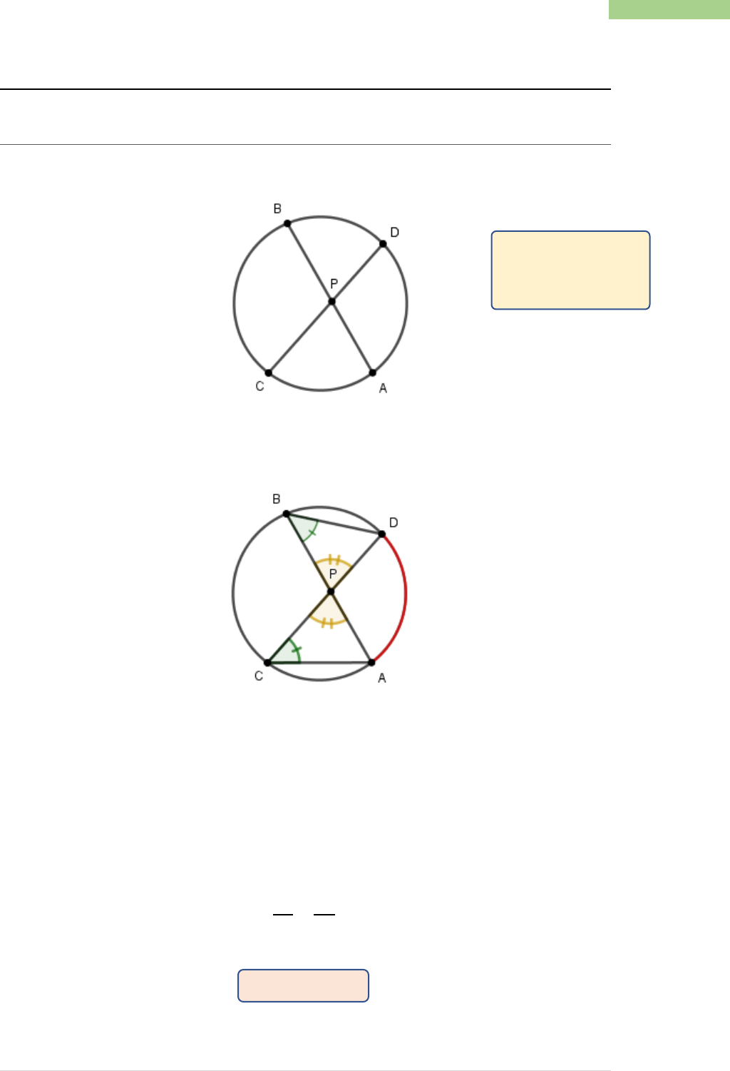 1 | P á g i n a Material elaborado para a 2ª etapa – Prova Prática de Didática - IMPARH Matemática Prof. Me. Esp. Jefferson Macedo Notas de Aula – Relações métricas no círculo 1 RELAÇÃO ENTRE DUAS CORDAS DE UMA CIRCUNFERÊNCIA Considere uma circunferência qualquer e duas cordas 𝐴𝐵̅̅ ̅̅ e 𝐶𝐷̅̅ ̅̅ que se cruzam, em um ponto 𝑃, como mostra a figura a seguir Ao traçar os segmentos 𝐴𝐶̅̅ ̅̅ e 𝐵𝐷̅̅ ̅̅ , formamos os triângulos 𝑃𝐶𝐴 e 𝑃𝐵𝐷. Vamos mostrar que esses triângulos são semelhantes. Observe que 𝐶�̂�𝐴 ≅ 𝐵�̂�𝐷, isto é, são congruentes pois são opostos pelo vértice. Os ângulos inscritos 𝐴�̂�𝐷 e 𝐴�̂�𝐷 são associados ao mesmo arco AB e, portanto, são congruentes. Logo, o terceiro ângulo é congruente. Então, pelo caso de semelhança A.A.A. concluímos que os triângulos são semelhantes. Assim, comparando as medidas dos lados correspondentes dos triângulos 𝑃𝐶𝐴 e 𝑃𝐵𝐷, temos 𝑃𝐵 𝑃𝐶 = 𝑃𝐷 𝑃𝐴 Isto é, 𝑃𝐴. 𝑃𝐵 = 𝑃𝐶. 𝑃𝐷 Figura 1:Elemento gerado no Geogebra Corda: Segmento ligando dois pontos de um círculo. Figura 2: Elemento gerado no Geogebra 2 | P á g i n a Material elaborado para a 2ª etapa – Prova Prática de Didática - IMPARH Matemática Prof. Me. Esp. Jefferson Macedo 2 RELAÇÃO ENTRE DOIS SEGMENTOS SECANTES A UMA CIRCUNFERÊNCIA Considere uma circunferência qualquer e dois segmentos secantes 𝑃𝐴̅̅ ̅̅ e 𝑃𝐶̅̅̅̅ em que extremidade 𝑃 é um ponto externo à circunferência, como na figura a seguir. Ao traçar os segmentos 𝐴𝐷̅̅ ̅̅ e 𝐵𝐶̅̅ ̅̅ , obtemos os triângulos 𝑃𝐴𝐷 e 𝑃𝐶𝐵. Vamos mostrar que esses triângulos são semelhantes. Os ângulos 𝑃�̂�𝐷 e 𝑃�̂�𝐵 são inscritos e associados ao mesmo arco 𝐵𝐷 e, portanto, são congruentes. O ângulo �̂� é comum aos triângulos. Então, pelo caso 𝐴. 𝐴. 𝐴. de semelhança de triângulos, concluímos que os triângulos 𝑃𝐴𝐷 e 𝑃𝐶𝐵 são semelhantes. Comparando as medidas de comprimento dos lados correspondentes dos triângulos 𝑃𝐴𝐷 e 𝑃𝐶𝐵, temos 𝑃𝐴 𝑃𝐶 = 𝑃𝐷 𝑃𝐵 isto é, 𝑃𝐴. 𝑃𝐵 = 𝑃𝐶. 𝑃𝐷 Figura 3:Elemento gerado no Geogebra Figura 4:Elemento gerado no Geogebra 3 | P á g i n a Material elaborado para a 2ª etapa – Prova Prática de Didática - IMPARH Matemática Prof. Me. Esp. Jefferson Macedo 3 RELAÇÃO ENTRE UM SEGMENTO SECANTE E UM SEGMENTO TANGENTE A UMA CIRCUNFERÊNCIA Considere uma circunferência qualquer e um segmento secante 𝑃𝐵̅̅ ̅̅ e outro segmento 𝑃𝑇̅̅̅̅ tangente à circunferência. É possível mostrar que a relação abaixo é verdadeira: 𝑃𝐴. 𝑃𝐵 = (𝑃𝑇)2 4 ATIVIDADES 1. Obtenha a medida do comprimento do segmento 𝐸𝐽̅̅ ̅ representado na figura a seguir. 2. Calcule o valor de 𝑥 em cada uma das figuras abaixo: a) b) Figura 5:Elemento gerado no Geogebra 4 | P á g i n a Material elaborado para a 2ª etapa – Prova Prática de Didática - IMPARH Matemática Prof. Me. Esp. Jefferson Macedo 3. Calcule a medida do segmento 𝑉𝐸̅̅ ̅̅ tangente à circunferência em 𝐸. 5 REFERÊNCIAS BARBOSA, João Lucas, Geometria Euclidiana Plana, .... SAMPAIO, Fausto Arnaud. Trilhas da matemática, 9º ano: Ensino Fundamental, anos finais - 1 a ed., São Paulo: Saraiva, 2018.
