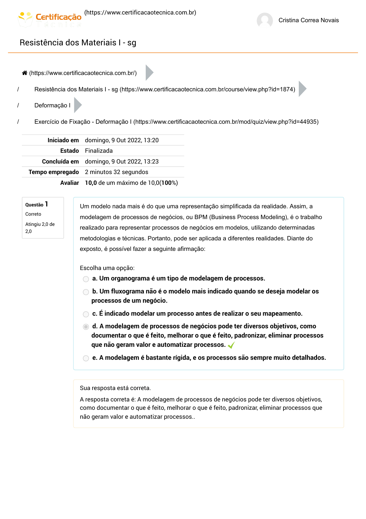 (https://www.certificacaotecnica.com.br) Cristina Correa Novais Resistência dos Materiais I - sg Questão 1 Correto Atingiu 2,0 de 2,0 / / / Iniciado em domingo, 9 Out 2022, 13:20 Estado Finalizada Concluída em domingo, 9 Out 2022, 13:23 Tempo empregado 2 minutos 32 segundos Avaliar 10,0 de um máximo de 10,0(100%) Um modelo nada mais é do que uma representação simplificada da realidade. Assim, a modelagem de processos de negócios, ou BPM (Business Process Modeling), é o trabalho realizado para representar processos de negócios em modelos, utilizando determinadas metodologias e técnicas. Portanto, pode ser aplicada a diferentes realidades. Diante do exposto, é possível fazer a seguinte afirmação: Escolha uma opção: a. Um organograma é um tipo de modelagem de processos. b. Um fluxograma não é o modelo mais indicado quando se deseja modelar os processos de um negócio. c. É indicado modelar um processo antes de realizar o seu mapeamento. d. A modelagem de processos de negócios pode ter diversos objetivos, como documentar o que é feito, melhorar o que é feito, padronizar, eliminar processos que não geram valor e automatizar processos. e. A modelagem é bastante rígida, e os processos são sempre muito detalhados. Sua resposta está correta. A resposta correta é: A modelagem de processos de negócios pode ter diversos objetivos, como documentar o que é feito, melhorar o que é feito, padronizar, eliminar processos que não geram valor e automatizar processos.. (https://www.certificacaotecnica.com.br/) Resistência dos Materiais I - sg (https://www.certificacaotecnica.com.br/course/view.php?id=1874) Deformação I Exercício de Fixação - Deformação I (https://www.certificacaotecnica.com.br/mod/quiz/view.php?id=44935) https://www.certificacaotecnica.com.br/ https://www.certificacaotecnica.com.br/ https://www.certificacaotecnica.com.br/course/view.php?id=1874 https://www.certificacaotecnica.com.br/mod/quiz/view.php?id=44935 Questão 2 Correto Atingiu 2,0 de 2,0 Existem diferentes abordagens para conceitualizar processos. Diante das opções a seguir, assinale a alternativa CORRETA no que se refere ao conceito de processos: I. Uma cooperação de atividades e recursos distintos voltados à realização de um objetivo global, orientado para o cliente final, que é comum ao processo e ao produto/serviço. II. Um conjunto de atividades que, juntas, produzem um resultado de valor para um consumidor. III. É uma ordenação específica de atividades de trabalho com início, fim e um conjunto claramente definido de entradas e saídas. IV. Um conjunto de atividades (funções) estruturadas sequencialmente, de acordo com requisitos e tempos preestabelecidos. V. Envolve uma ordenação lógica e atemporal de atividades que são executadas para concluir determinada tarefa. Escolha uma opção: a. Três afirmativas estão incorretas. b. Apenas a alternativa V está incorreta. c. I, II, III e V estão corretas. d. I e III estão corretas. e. Todas as alternativas estão corretas. Sua resposta está correta. A resposta correta é: Apenas a alternativa V está incorreta.. Questão 3 Correto Atingiu 2,0 de 2,0 Questão 4 Correto Atingiu 2,0 de 2,0 Analise as seguintes afirmações e, a seguir, marque a opção correta. 1. Os processos podem ser desdobrados em elementos centrais e elementos complementares. Os centrais envolvem a ação, os recursos em transformação e o objeto em fluxo. 2. A forma com que a coordenação organizacional é conduzida pouco interfere nos processos organizacionais. 3. Os processos gerenciais resultam em capacitações de gestão, e os processos operacionais resultam em capacitações operacionais que, em conjunto, resultam ou explicam o desempenho organizacional. Escolha uma opção: a. Apenas a afirmação 3 é verdadeira. b. Apenas a afirmação 1 é verdadeira. c. Todas as afirmações são verdadeiras. d. As afirmações 1 e 3 são verdadeiras. As duas afirmações estão de acordo com a leitura indicada para esta unidade. e. Nenhuma afirmação é verdadeira. Sua resposta está correta. A resposta correta é: As afirmações 1 e 3 são verdadeiras.. No que se refere à importância (ou criticidade) de um processo, pode-se afirmar que: Escolha uma opção: a. Todas as alternativas anteriores estão corretas. b. As consequências de falhas em um processo crítico podem gerar um grande número de problemas de grandes proporções. c. Envolve o nível de contribuição para a transformação de um produto, com o objetivo de uma percepção positiva por parte do cliente. d. Está relacionada à orientação dos critérios para priorizar processos a serem geridos com maior atenção. e. Envolve o nível de contribuição de um processo para a agregação de valor a um produto/serviço. Sua resposta está correta. A resposta correta é: Todas as alternativas anteriores estão corretas.. Questão 5 Correto Atingiu 2,0 de 2,0 Um processo organizacional tem diversos componentes. Assinale a alternativa que apresenta componentes de processos organizacionais. Escolha uma opção: a. Saídas, ou seja, o resultado do processo. b. Recursos de diferentes fontes. c. Todas as alternativas anteriores estão corretas. Todos os seguintes elementos compõem processos organizacionais: entradas tangíveis ou intangíveis; saídas/resultados; recursos; custos. d. Entradas tangíveis ou intangíveis. e. O custo dos recursos utilizados. Sua resposta está correta. A resposta correta é: Todas as alternativas anteriores estão corretas..
