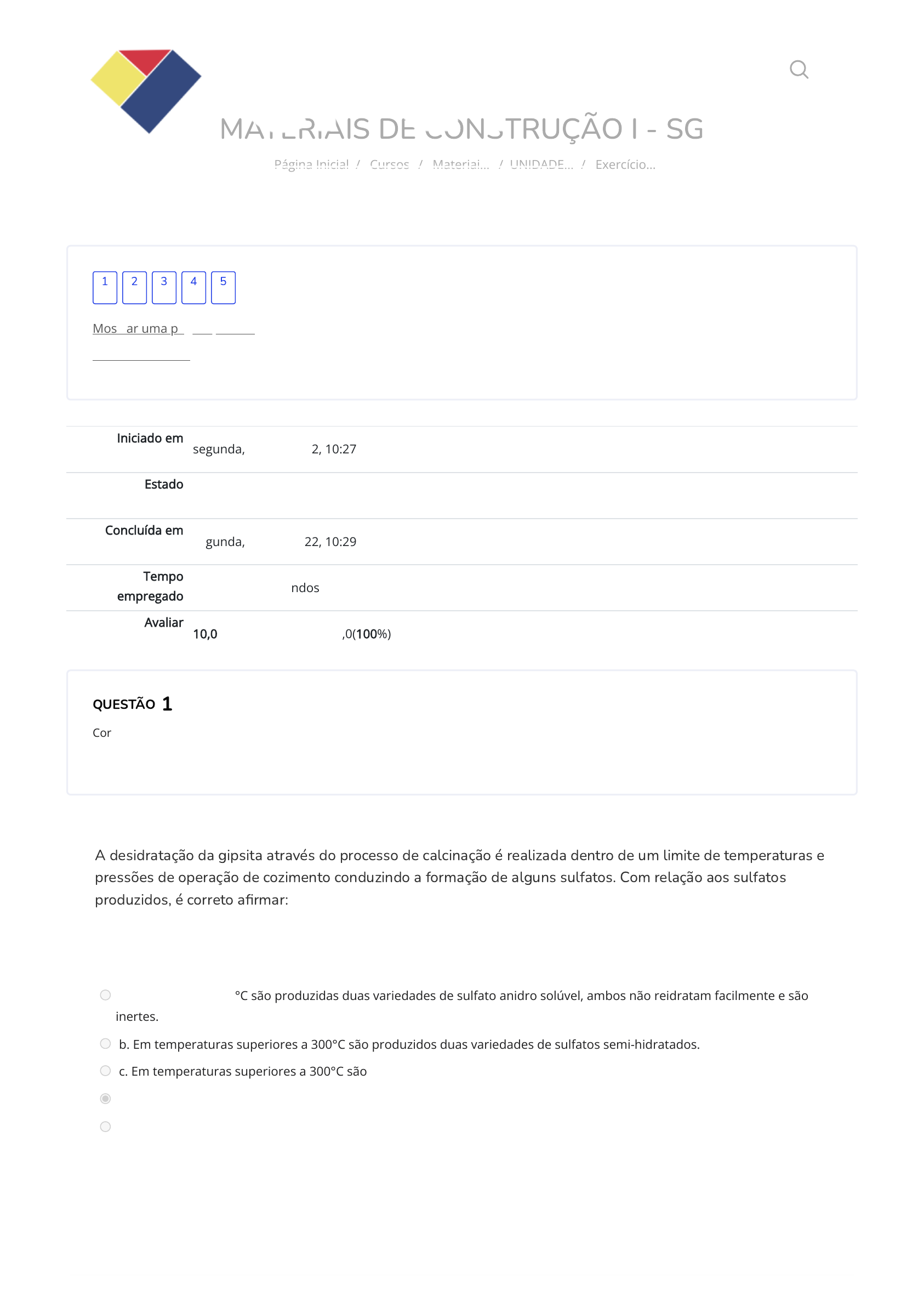 10/10/2022 10:29 Exercício de fixação - Gesso: Revisão da tentativa https://cpetead.com.br/mod/quiz/review.php?attempt=3029891&cmid=47057 1/4 MATERIAIS DE CONSTRUÇÃO I - SG Página Inicial / Cursos / Materiai… / UNIDADE… / Exercício… Iniciado em segunda, 10 Out 2022, 10:27 Estado Finalizada Concluída em segunda, 10 Out 2022, 10:29 Tempo empregado 2 minutos 2 segundos Avaliar 10,0 de um máximo de 10,0(100%) QUESTÃO Correto Atingiu 2,0 de 2,0 Mostrar uma página por vez Terminar revisão 1 2 3 4 5 1 A desidratação da gipsita através do processo de calcinação é realizada dentro de um limite de temperaturas e pressões de operação de cozimento conduzindo a formação de alguns sulfatos. Com relação aos sulfatos produzidos, é correto a�rmar: Escolha uma opção: a. Entre 100°C e 300°C são produzidas duas variedades de sulfato anidro solúvel, ambos não reidratam facilmente e são inertes. b. Em temperaturas superiores a 300°C são produzidos duas variedades de sulfatos semi-hidratados. c. Em temperaturas superiores a 300°C são produzidos duas variedades de sulfato anidro solúvel. d. O sulfato anidro insolúvel na presença de água não reidrata rapidamente. e. O sulfato anidro insolúvel na presença de água reidrata rapidamente, produzindo o fenômeno chamado de pega do gesso. Sua resposta está correta. A resposta correta é: O sulfato anidro insolúvel na presença de água não reidrata rapidamente. https://cpetead.com.br/ https://cpetead.com.br/course/index.php https://cpetead.com.br/course/view.php?id=1996 https://cpetead.com.br/mod/quiz/view.php?id=47057 https://cpetead.com.br/mod/quiz/review.php?attempt=3029891&cmid=47057&showall=0 https://cpetead.com.br/mod/quiz/view.php?id=47057 https://cpetead.com.br/ 10/10/2022 10:29 Exercício de fixação - Gesso: Revisão da tentativa https://cpetead.com.br/mod/quiz/review.php?attempt=3029891&cmid=47057 2/4 QUESTÃO Correto Atingiu 2,0 de 2,0 QUESTÃO Correto Atingiu 2,0 de 2,0 2 No processo de fabricação do cimento o gesso é adicionado para: Escolha uma opção: a. Controlar o tempo de pega. b. Aumentar sua resistência. c. Reduzir o tempo de pega. d. Aumentar a resistência à água. e. Características estéticas. Sua resposta está correta. A resposta correta é: Controlar o tempo de pega. 3 Assinale a alternativa correta a respeito do gesso: Escolha uma opção: a. Condutibilidade térmica das pastas endurecidas de gesso é alta. b. Pastas e argamassas de gesso não aderem a tijolos. c. Pastas endurecidas com gesso possuem excelente isolamento acústico. d. Pastas endurecidas de gesso não aderem a pedras. e. Pastas endurecidas com gesso não possuem propriedades acústicas. Sua resposta está correta. A resposta correta é: Pastas endurecidas com gesso possuem excelente isolamento acústico. 10/10/2022 10:29 Exercício de fixação - Gesso: Revisão da tentativa https://cpetead.com.br/mod/quiz/review.php?attempt=3029891&cmid=47057 3/4 QUESTÃO Correto Atingiu 2,0 de 2,0 QUESTÃO Correto Atingiu 2,0 de 2,0 4 O gesso quando misturado com a água inicia seu processo de endurecimento em razão da formação de uma malha de cristais. Depois de iniciada a pega, ele continua a endurecer como os demais aglomerantes. Portanto é correto a�rmar que: Escolha uma opção: a. Presença de impurezas ou uso de aditivos in�uenciam no tempo de pega. b. Presença de impurezas não in�uencia no tempo de pega do gesso. c. A �nura não é um in�uenciador do tempo de pega. d. Temperatura e tempo de calcinação não in�uenciam no tempo da pega. e. Quantidade de água no amassamento não in�uencia no tempo de pega do gesso. Sua resposta está correta. A resposta correta é: Presença de impurezas ou uso de aditivos in�uenciam no tempo de pega. 5 O limite de impurezas do gesso varia desde pequenas proporções até um limite máximo de: Escolha uma opção: a. 6%. b. 2%. c. 1%. d. 0%. e. 0,1%. Sua resposta está correta. A resposta correta é: 6%. ◄ Gesso Seguir para... Leitura Obrigatória: Aula 12 - Gesso ► https://cpetead.com.br/mod/lti/view.php?id=47012&forceview=1 https://cpetead.com.br/mod/url/view.php?id=47013&forceview=1 10/10/2022 10:29 Exercício de fixação - Gesso: Revisão da tentativa https://cpetead.com.br/mod/quiz/review.php?attempt=3029891&cmid=47057 4/4 Quem somos Cursos Certi�cação Unidades Contato Copyright © 2021 CPET - Centro de Pro�ssionalização e Educação Técnica https://www.cpet.com.br/quem-somos-cpet-cursos-tecnicos-a-distancia-ead/ https://www.cpet.com.br/course-cat/cursos/cursos-online/ https://www.cpet.com.br/certificacao-cpet/ https://www.cpet.com.br/unidades-cpet/ https://www.cpet.com.br/contato/ https://www.facebook.com/CPET-Centro-de-Profissionaliza%C3%A7%C3%A3o-e-Educa%C3%A7%C3%A3o-T%C3%A9cnica-1039179026236475/ https://twitter.com/soucpet/ https://www.instagram.com/soucpet/