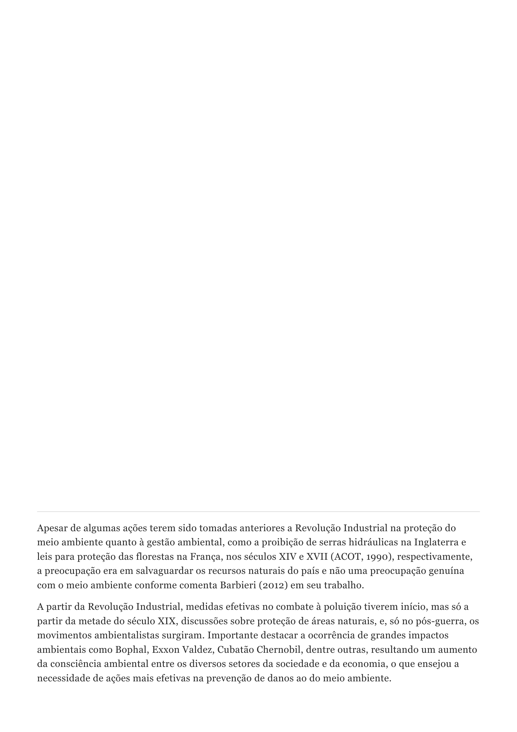 29/05/2021 Modelos de Gestão Ambiental https://cead.uvv.br/saladeaula/conteudo.php?aula=modelos-de-gestao-ambiental&dcp=meio-ambiente-sustentabilidade-eficiencia-energetica-e-energias-sustentaveis&topico=6 1/20 Lição 06 Modelos de Gestão Ambiental Meio Ambiente, Sustentabilidade, E�ciência Energética e Energias Renováveis Começar a aula 1. Introdução Apesar de algumas ações terem sido tomadas anteriores a Revolução Industrial na proteção do meio ambiente quanto à gestão ambiental, como a proibição de serras hidráulicas na Inglaterra e leis para proteção das florestas na França, nos séculos XIV e XVII (ACOT, 1990), respectivamente, a preocupação era em salvaguardar os recursos naturais do país e não uma preocupação genuína com o meio ambiente conforme comenta Barbieri (2012) em seu trabalho. A partir da Revolução Industrial, medidas efetivas no combate à poluição tiverem início, mas só a partir da metade do século XIX, discussões sobre proteção de áreas naturais, e, só no pós-guerra, os movimentos ambientalistas surgiram. Importante destacar a ocorrência de grandes impactos ambientais como Bophal, Exxon Valdez, Cubatão Chernobil, dentre outras, resultando um aumento da consciência ambiental entre os diversos setores da sociedade e da economia, o que ensejou a necessidade de ações mais efetivas na prevenção de danos ao do meio ambiente. 29/05/2021 Modelos de Gestão Ambiental https://cead.uvv.br/saladeaula/conteudo.php?aula=modelos-de-gestao-ambiental&dcp=meio-ambiente-sustentabilidade-eficiencia-energetica-e-energias-sustentaveis&topico=6 2/20 O conhecimento crescente das populações em todo o mundo, das causas e consequências de fenômenos como o Aquecimento Global, conforme já comentado no tópico 1, destruição da camada de ozônio, perda acelerada das florestas e biodiversidade dos ecossistemas, contaminação e exaurimento dos recursos naturais vêm gerando maior cobrança dos governos por leis mais restritivas ao uso não sustentável dos recursos naturais e ao mesmo tempo mais severas quanto à punição de indivíduos e empresas à contaminação e exaurimento de destes mesmos recursos. Nesse contexto, as empresas vêm assumindo uma nova postura no intuito de procurar obter soluções ou minimizar o impacto de suas ações sobre o meio ambiente. Mas, para isso, não basta investir em tecnologias, treinamentos e mão de obra especializada, mas sim, sobretudo, em sistemas gerenciais administrativos que balizem, normatizem e tornem mais racionais as ações focadas na prevenção e proteção ambientais, como na Gestão Ambiental Empresarial, cuja importância no atendimento a essas necessidades serão abordadas também neste tópico. 2. Definição de gestão ambiental Várias são as definições encontradas na literatura referentes à Gestão Ambiental. Barbieri (2012, p. 19) define-a como sendo: As diretrizes e as atividades administrativas e operacionais, tais como planejamento, direção, controle, alocação de recursos e outras realizadas com o objetivo de obter efeitos positivos sobre o meio ambiente, tanto reduzindo, eliminando ou compensando os danos ou problemas causados pelas ações humanas, quanto evitando que eles surjam. Já Sánchez (2008, p.19) conceitua Gestão ambiental, como sendo: Um conjunto de medidas de ordem técnica e gerencial que visam a assegurar que o empreendimento seja implantado, operado e desativado em conformidade com a legislação ambiental e outras diretrizes relevantes, a fim de minimizar os riscos ambientais e os impactos adversos, além de maximizar os efeitos benéficos. Lanna (1995, p.17) coloca “Gestão Ambiental como sendo o: Processo de articulação das ações dos diferentes agentes sociais que interagem em um dado espaço, visando garantir, com base em princípios e diretrizes previamente acordados/definidos, a adequação dos meios de exploração dos recursos ambientais/naturais, econômicos e socioculturais às especificidades do meio ambiente. 29/05/2021 Modelos de Gestão Ambiental https://cead.uvv.br/saladeaula/conteudo.php?aula=modelos-de-gestao-ambiental&dcp=meio-ambiente-sustentabilidade-eficiencia-energetica-e-energias-sustentaveis&topico=6 3/20 Mas, o que essas definições teriam em comum? As ações de controle ambiental derivadas dos planos de Gestão Ambiental encontram sua única aplicação na fase de operação? Pelas definições apresentadas, pode-se perceber que um ponto comum a todas é o fato de utilizarem diferentes formas de gestão e controle, balizadas por normas e diretrizes ambientais, com o objetivo de proteger o meio ambiente, reduzindo e/ou minimizando as agressões, ou evitando-as. Quando Lanna (1995) menciona diferentes agentes sociais, inclui, nesse contexto, o setor públicotambém como agente utilizador e promotor da gestão ambiental, e não só aquelas ligadas à iniciativa privada. Apesar das ações de controle ambiental ser muito utilizadas na fase de operação, principalmente quando originadas do Sistema de Gestão Ambiental (SGA), Sánchez (2008), em sua definição, menciona também as fases de implantação e desativação dos empreendimentos (inerentes ao EIA - Tópico 5 –, salientando a importância dos planos de Gestão Ambiental a eles aplicados. 3. Dimensões da gestão ambiental Embora as iniciativas à Gestão Ambiental tenham tido origem em ações governamentais com o objetivo de enfrentar a escassez de recursos naturais, com o tempo, outras questões ambientais foram sendo consideradas por outros agentes e com alcances diferentes. Segundo Barbieri (2011), qualquer proposta de gestão ambiental inclui no mínimo três dimensões: 1. Dimensão ESPACIAL que concerne área na qual se espera que as ações de gestão tenham eficácia, podendo ser global, regional, nacional, local, setorial, empresarial e outros; 2. Dimensão TEMÁTICA que delimita as questões ambientais às quais as ações se destinam como o ar, águas