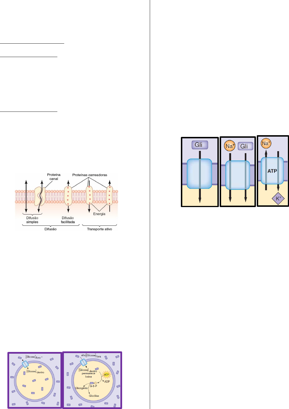 Gabriela Sensi Santhiago TXIX Medicina Universidade Positivo Transportes Através do Membranas Tipos de Transporte transporte ativo o envolve o consumo de energia química (ATP) o moléculas movem-se contra o gradiente de concentração o transporte vesicular (ATP): endocitose, fagocitose e exocitose o mediado por proteínas: transporte ativo primário e transporte ativo secundário transporte passivo o não envolve o consumo de energia química (ATP) o moléculas movem-se a favor do gradiente de concentração o difusão simples – gradiente de concentração o mediado por proteínas: difusão facilitada, canal iônico e aquaporinas Transporte Passivo o movimento molecular aleatório de substâncias molécula a molécula impulsionado por energia cinética (energia térmica) o não envolve gasto de ATP difusao simples o através dos espaços intermolecures da membrana o passagem de íons e outras moléculas através de proteínas de canal (Guyton) difusao facilitada o através de proteínas carreadoras o transporte de moléculas polares que não poderiam atravessar facilmente a membrana celular o açúcares ou aminoácidos são transportados para o meio intracelular ou extracelular desse modo (exemplo: GLUT) o moléculas transportadoras movem-se a favor do gradiente de concentração o não requer adição de energia externa o movimento de líquido cessa com o equilíbrio Proteínas Transportadoras o proteínas carreadoras o proteínas de canal – canais abertos e canais com portão proteínas carreadoras o grandes e complexas – possuem múltiplas subunidades o substância a ser transportada liga-se às proteínas carreadoras o transporte é realizado mediante alteração de conformação da proteína o o transporte ocorre de modo muito mais lento do que através de uma proteína de canal o nunca criam uma passagem continua entre o lado interno e o lado externo da célula 1. proteínas carreadoras uniporte 2. proteínas carreadoras cotransportadores: simporte e antiporte o passagem aberta para um lado → estado de transição com ambos os portões fechados → passagem aberta para o outro lado proteínas de canal - canais abertos: o canais de vazamento ou poros o passam a maior parte do tempo com seu portão aberto o a maioria desses canais se comporta como se não tivessem portões o ocasionalmente podem se fechar - canais com portão/comportas: o passam a maior parte do tempo com seu portão fechado o regulam o movimento de íons que passam através deles o quando os portões se abrem, funcionam como um canal aberto o quando se fecham, não permitem a passagem dos íons através deles 1. canais controlados mecanicamente: respondem a forcas físicas como aumento de temperatura ou pressão que aplica tensão na membrana e faz o portão do canal se abrir 2. canais dependentes de voltagem: abrem e fecham quando o estado elétrico da célula muda Gabriela Sensi Santhiago TXIX Medicina Universidade Positivo 3. canais controlados quimicamente: controlados por moléculas mensageiras intracelulares ou por ligantes extracelulares que se ligam ao canal proteíco Transporte Ativo transporte primário direto o energia proveniente diretamente da hidrólise do ATP o muitos dos transportadores são chamados de ATPases - Na+-K+ ATPase/Bomba de sódio e potássio: o 3Na+ do LIC ligam-se a sítios de alta afinidade Na+-K+ ATPase o a ATPase é fosforilada com Pi do ATP – a proteína muda sua conformação o 3Na+ são liberados no LEC o um sitio com alta afinidade pelo K+ aparece o 2K+ do LEC ligam-se ao novo sítio – a proteína muda sua conformação o 2K+ são liberados no LIC o sítios de alta afinidade pelo Na+ aparecem O CICLO REINICIA transporte secundário indireto o energia proveniente de um gradiente de concentração (criado anteriormente pelo ATP) o utiliza energia cinética de uma molécula que se move a favor do seu gradiente de concentração para empurrar outras moléculas contra o seu gradiente de concentração o esse tipo de transporte é denominado cotransporte e pode ser de dois tipos: 1. simporte: moléculas cotransportadas na mesma direção através da membrana 2. antiporte: moléculas cotransportadas em direções opostas através da membrana o sistemas de transporte ativo secundário mais comuns: aqueles impulsionados pelo gradiente de concentração do íons Na+ → cotransporte o conforme o sódio entra na célula: leva uma ou mais moléculas com ele (mesmo sentido) – simporte – e troca de lugar com moléculas que saem da célula (sentidos opostos) – antiporte - Na+-glicose: o Na+ liga-se ao carreador o a ligação de Na+ cria sítio com alta afinidade pela glicose o a ligação de glicose muda a conformação da proteína, de modo que os sítios de ligação agora estão voltados para o LIC o o Na+ é liberado no citosol, em que [Na+] é baixa – a liberação muda a afinidade do sítio para a glicose o a glicose é liberada especificidade no transporte mediado por carreadores o GLUT: especifico para hexoses – reconhece maltose, se liga a ela, mas não transporta o maltose: inibidor competitivo do GLUT
