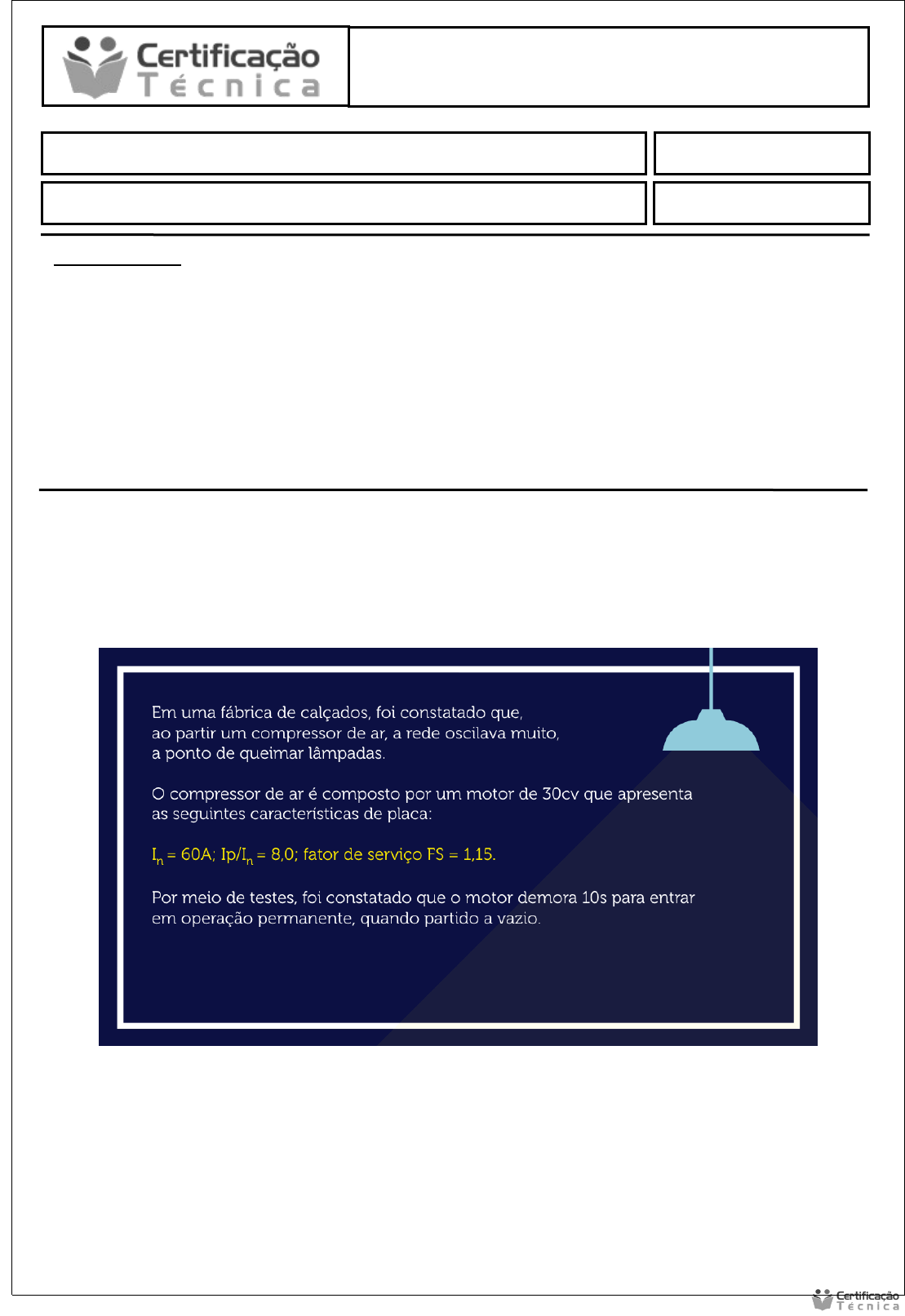 Acionamentos Elétricos Data: .10/10/2022 Aluno (a): Matheus Martins Cornélio Avaliação Pratica INSTRUÇÕES: · Esta Avaliação contém 1 (uma) questão, totalizando 10 (dez) pontos; · Baixe o arquivo disponível com a Atividade Pratica; · Você deve preencher dos dados no Cabeçalho para sua identificação: · Nome / Data de entrega. · As respostas devem ser digitadas abaixo de cada pergunta; · Ao terminar grave o arquivo com o nome Atividade Prática; · Quando solicitado · Envio o arquivo pelo sistema no local indicado; · Em caso de dúvidas consulte o seu Tutor. É comum a utilização de motores para diversas finalidades em um ambiente industrial. Casualmente, esses motores apresentam grande potência para atender à demanda mecânica necessária e, consequentemente, apresentam inércia de partida elevada. Imagine que você é o eletricista que foi contratado para resolver o seguinte caso: Que tipo de estratégia pode ser adotado, atuando na partida desse motor, para resolver esse problema? Explique e dimensione os elementos para essa estratégia. Dimensionamento: Para solucionar o problema de oscilação da rede na empresa do cliente a partida do motor será utilizado a partida em Estrela - Triângulo, a partida do motor será mais suave e com corrente departida reduzida. Será utilizado: 3 contadores 1 relé de sobrecarga K1 = 2 contatos NA. (Ref.AC-3 de 50A, Referencia Weg CWB50-11-30) K2 = 1 contato NA e 1 contato NF. (AC-3 de 50A, Referencia Weg CWB50-11-30) K3 = 1 contato NA e 1 contato NF. (AC-3 de 32A, referência Weg RW67-5D3-U0030) Relé de sobrecarga = (32 a 50A, referência Weg RW67-5D3-U0030) Determinando K1 e K2 a) Corrente de linha 𝐼𝑛 = 𝐼𝐿 → 𝐼𝐿 = 60𝐴 𝐼𝑛 = 𝐼𝐿 → 𝐼𝐿 = 60𝐴 b) Corrente de fase 𝐼∆ = 𝐼𝐿 → 𝐼∆ = 60 = 34,64𝐴 √3. √ 𝐼∆ = 𝐼𝐿 → 𝐼∆ = 60 = 34,64𝐴 √3. √3. c) Corrente de emprego dos contatores 𝐼𝑒 𝐼𝑒 = 𝐼∆ ∙ 1,25 = 34,64 ∙ 1,25 = 43,3𝐴 Contatores com classe AC-3 de 50A, referência Weg CWB50-11-30 Determinando K3 K3 conduz corrente apenas durante o fechamento em estrela a) Corrente de emprego 𝐼𝑒 = 𝐼𝑛 ∙ 0,33 ∙ 1,25 = 60 ∙ 0,33 ∙ 1,25 = 24,75A Contatores com classe AC-3 de 32A, referência Weg CWB32-11-30 Determinando o relé de sobrecarga 𝐼𝑅𝑇 = 𝐼𝑛 = 60 = 34,64𝐴 √3. √3 A escolha do relé de sobrecarga está relacionada ao contator selecionado, no caso K1 e K 2.Será utilizado um relé de sobrecarga com range de ajuste de 32 á 50A, referência Weg RW67-5D3-U0030