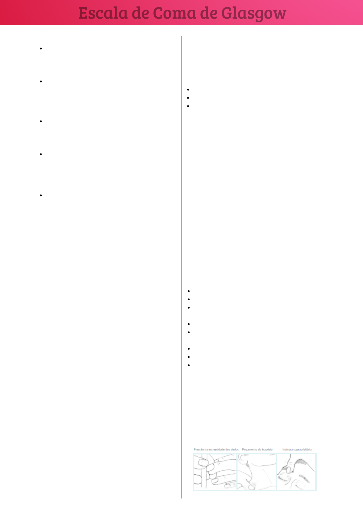 Escala de Coma de GlasgowEscala de Coma de Glasgow O funcionamento do sistema nervoso é realizado por meio da manipulação de informações sobre os ambientes externo e interno. O sistema nervoso é dividido em sistema nervoso central (SNC) e sistema nervoso periférico (SNP). Exame neurológico Confusão Mental: configura-se por perda de atenção, o pensamento não é claro, as respostas são lentas e não há uma percepção temporoespacial normal. Torpor ou estupor: quando a alteração de consciência for mais pronunciada, mas o paciente ainda é capaz de ser despertado por estímulos mais fortes e tem movimentos espontâneos. Coma: quando o paciente não for despertado por estímulos fortes e não tiver movimentos espontâneos. Diferença de Confusão mental, torpor e coma Coma É um estado de inconsciência, habitualmente prolongado (com duração de horas, dias ou meses) do qual o paciente pode ou não emergir. Esse estado de inconsciência não pode ser revertido pelos estímulos externos comuns, critério que torna possível distinguir o coma do estado de inconsciência do sono fisiológico. O coma é a expressão de falência das funções encefálicas, podendo ser determinado por lesões estruturais do parênquima encefálico, disfunções metabólicas e intoxicações exógenas com repercussão no sistema nervoso central (SNC). Escala de Coma de Glasgow O que é? A escala foi descrita em 1974 por Graham Teasdale e Bryan Jennett, como foram de se comunicar sobre o nível de consciência de pacientes com prejuízo cerebral agudo. Utilização: Os resultados que utilizam a escala garantem a tomada de decisão inicial e monitoram as tendências de capacidade resposta que são importantes para sinalizar a necessidade de novas ações. Os extremos da escala, valores próximos a 15 ou 3 pontos, caracterizam a normalidade (15 pontos) ou o estado de coma grave (3 pontos). Entre os dois extremos, encontram-se vários graus de comprometimento de nível de consciência, sendo que abaixo de 8 pontos, corresponde ao estado de coma. Abertura Ocular Resposta Verbal Melhor Resposta Motora Utilização A escala considera 3 fatores principais e determina uma pontuação de acordo com o nível de consciência apontada em cada um desses casos (espontaneamente ou através de estímulo). São eles: Primeiro Passo: É o verifique que tem o objetivo de checar fatores que interferem com a comunicação, capacidade de respostas e outras lesões. Deve-se avaliar se o paciente apresenta algum fator que impossibilite a aplicação da escala. Abertura Ocular Conteúdo do Discurso Movimentos do Hemicorpos direito e esquerdo Segundo Passo: É o observe. Nesse ponto o profissional observa 3 critérios: 1. 2. 3. É válido ressaltar que a escala de Glasgow pode ser aplicada em apenas algumas variáveis. Isso se dá porque alguns fatores podem impossibilitar a avaliação. Linguagem ou diferenças culturais; Défice intelectual ou neurológico; Perda auditiva ou impedimento de fala; Intubação ou traqueostomia; Sedação; Fratura orbital/craniana; Disfasia ou Hemiplegia; Dano na Medula Espinhal; Fatores Pré-existentes: Efeitos do Tratamento Atual: Efeitos de Outras Lesões ou Lesões: Estimulação sonora com ordem em tom de voz normal ou em voz alta. Estimulação física com pressão na extremidade dos dedos, trapézio ou incisura supraorbitária. Terceiro Passo: É o estimule. Nesse ponto será feita: 1. 2. Locais para Estimulação Física @_leticiaba @_leticiaba Características da Resposta em Flexão Na postura de decorticação ocorre a flexão dos membros superiores, rotação interna dos membros inferiores e flexão plantar dos pés. A postura de descerebração envolve extensão e rotação externa dos membros superiores e flexão plantar dos pés. Decorticação e Descerebração Sugere lesão destrutiva dos tratos corticoespinhais no interior dos hemisférios cerebrais ou muito próxima a eles. É causada por lesão no diencéfalo, mesencéfalo ou ponte, embora transtornos metabólicos graves, como hipóxia e hipoglicemia também possam produzi-la. Escala de Coma de Glasgow com Resposta Pupilar (ECG - P) Essa escala têm o acréscimo da avaliação da reatividade da pupila. Após terminar a escala convencional, o examinador deve avaliar a resposta pupilar à luz. Inexistente (2 pontos): nenhuma pupila reage ao estímulo de luz; Parcial (1 ponto): apenas uma pupila reage ao estímulo de luz; Completa (0 pontos): as duas pupilas reagem ao estímulo de luz; Escala de Coma de Glasgow @_leticiaba
