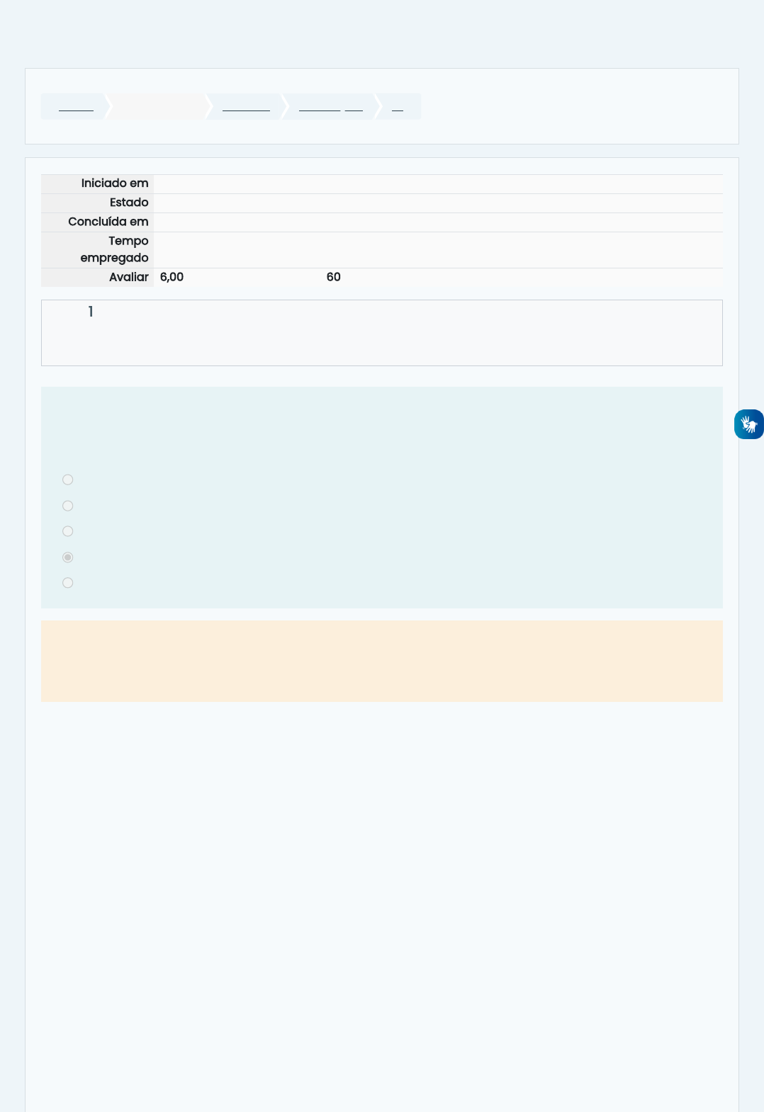 Painel Meus cursos N0383N1 AVALIAÇÃO V1 Iniciado em sábado, 17 set 2022, 09:20 Estado Finalizada Concluída em sábado, 17 set 2022, 10:43 Tempo empregado 1 hora 22 minutos Avaliar 6,00 de um máximo de 10,00(60%) Questão 1 Correto Atingiu 0,50 de 0,50 A fome é um sintoma de que o fígado está trabalhando demais para manter a concentração normal de glicose na corrente sangüínea. No fígado, a glicose fica armazenada sob a forma de: a. Galactose b. Frutose c. Amido d. Glicogênio e. Glicose Sua resposta está correta. A resposta correta é: Glicogênio https://ead.universo.edu.br/my/ https://ead.universo.edu.br/course/view.php?id=3367 https://ead.universo.edu.br/course/view.php?id=3367#section-4 https://ead.universo.edu.br/mod/quiz/view.php?id=410160 Questão 2 Correto Atingiu 0,50 de 0,50 Questão 3 Correto Atingiu 0,50 de 0,50 A respiração celular é um processo bioquímico que ocorre na célula para obtenção de energia. Pergunta-se, qual O produto final da respiração aeróbica? a. ácido pirúvico e água. b. gás carbônico e água. c. ácido pirúvico e oxigênio. d. piruvato e água e. oxigênio e água. Sua resposta está correta. A resposta correta é: gás carbônico e água. Transportador de glicose na célula muscular: marque a opção correta. a. GLUT 4 b. LACTATO c. NAD d. GLUCAGON e. INSULINA Sua resposta está correta. A resposta correta é: GLUT 4 https://exerciciosweb.com.br/citologia/a-composicao-quimica-dos-seres-vivos-agua-e-sais-minerais-exercicios/ Questão 4 Correto Atingiu 0,50 de 0,50 Questão 5 Correto Atingiu 1,00 de 1,00 Marque a alternativa que indica quais os elementos encontrados na composição de um monossacarídeo. Escolha uma opção: a. Carbono, hidrogênio, nitrogênio e oxigênio. b. Carbono, oxigênio e hidrogênio. c. Carbono, cálcio e potássio. d. Sódio, potássio e carbono e. Carbono, magnésio e hidrogênio. Sua resposta está correta. A resposta correta é: Carbono, oxigênio e hidrogênio. O ciclo de krebs inicia-se com o acetil Coa como substrato, o qual foi formado com base na oxidação do piruvato. Os dois carbonos do acetil CoA combinam-se com oxalacetato, um composto de quatro carbonos, formando um composto de seis carbonos, denominado citrato. Pergunta-se: Em que local na célula ocorre esta reação? Marque a opção correta. a. Citoplasma b. Membrana mitocondrial externa c. Cristas mitocondriais d. Matriz mitocondrial e. Membrana interna mitocondrial Sua resposta está correta. A resposta correta é: Matriz mitocondrial Questão 6 Correto Atingiu 1,00 de 1,00 Questão 7 Incorreto Atingiu 0,00 de 1,00 sobre a digestão do carboidrato, onde ocorre a quebra das moléculas restantes desse polissacarídeo em maltases e oligossacarídeos pela enzima amilase pancreática. Escolha uma opção: a. pâncreas b. duodeno c. estômago d. intestino grosso e. esôfago Sua resposta está correta. A resposta correta é: duodeno Sobre o glicogênio, é correto afirmar: a. É classificado como oligossacarídeo e apresenta funções energéticas e estruturais em animais e vegetais. b. Constitui a principal forma de armazenamento de glicose em células vegetais. c. Participa das reações conhecidas como glicólise, sendo seu principal substrato o piruvato. d. Pode ser armazenado no fígado e nos músculos, sob a forma de glicogênio hepático e muscular, respectivamente. e. É um monossacarídeo composto por uma única molécula, cuja fórmula é: C6H12O6. Sua resposta está incorreta. A resposta correta é: Pode ser armazenado no fígado e nos músculos, sob a forma de glicogênio hepático e muscular, respectivamente. Questão 8 Correto Atingiu 1,00 de 1,00 Questão 9 Incorreto Atingiu 0,00 de 1,00 São funções da água exceto: Escolha uma opção: a. lubrificação das artivculações b. remoção de toxinas c. ajuda na absorção de nutrientes d. regulação das toxinas do corpo e. movimento de alavanca óssea Sua resposta está correta. A resposta correta é: movimento de alavanca óssea Considerando-se seus diferentes destinos, o piruvato é convertido em a. A ácido lático no músculo, em condições aeróbicas. b. A acetil-CoA nos músculos, em condições anaeróbicas. c. A lactato nos músculos, em condições aeróbicas. d. A acetil CoA nos músculos, em condições aeróbicas. e. A acetil-CoA no cérebro, em condições anaeróbicas. Sua resposta está incorreta. A resposta correta é: A acetil CoA nos músculos, em condições aeróbicas. Questão 10 Correto Atingiu 1,00 de 1,00 O metabolismo dos carboidratos é fundamental para o ser humano, pois a partir desses compostos orgânicos obtém-se grande parte da energia para as funções vitais. Por outro lado, desequilíbrios nesse processo podem provocar hiperglicemia ou diabetes. O caminho do açúcar no organismo inicia-se com a ingestão de carboidratos que, chegando ao intestino, sofrem a ação de enzimas, “quebrando-se” em moléculas menores (glicose, por exemplo) que serão absorvidas. A insulina, hormônio produzido no pâncreas, é responsável por facilitar a entrada da glicose nas células. Se uma pessoa produz pouca insulina, ou se sua ação está diminuída, dificilmente a glicose pode entrar na célula e ser consumida. Com base nessas informações, pode-se concluir que: a. O acúmulo de glicose no sangue é provocado pelo aumento da ação da insulina, levando o indivíduo a um quadro clínico de hiperglicemia. b. A insulina produzida pelo pâncreas tem um papel enzimático sobre as moléculas de açúcar. c. O papel realizado pelas enzimas pode ser diretamente substituído pelo hormônio insulina d. A diminuição da insulina circulante provoca um acúmulo de glicose no sangue. e. principal papel da insulina é manter o nível de glicose suficientemente alto, evitando, assim, um quadro clínico de diabetes. Sua resposta está correta. A resposta correta é: A diminuição da insulina circulante provoca um acúmulo de glicose no sangue. Questão 11 Inc