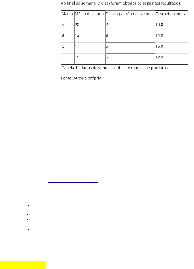 FMU – Inferência Estatística Atividade 3 Da tabela 1, temos: Média de Venda(unidades) Custo de Compra (R$) A: 18 ↔ 22 10,00 B: 4 ↔ 20 14,00 C: 12 ↔ 23 15,00 D: 10 ↔ 20 12,00 Supondo: μ⩾20+12+17+15 4 =16 H0 : μ ≥ 16 H1 : μ < 16 O Mercado comprou um lote de cada produto Mesma quantidade de unidades! α = 5% → 0,05 (significância) Variância Populacional igual para todas as marcas, portanto: Conhecidas! Do Quadro 1 valores de Z p < 0,3 1,645 Resposta A marca B deve ser descartada pois há um desvio padrão grande e custo de compra elevado. Escolha do supermercado: Marcas A e C