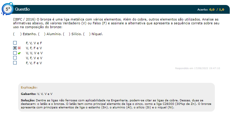 (IBFC 2016) O bronze é uma liga metálica com vários elementos. Além do cobre, outros elementos são utilizados. Analise as afirmativas abaixo, dê valores Verdadeiro (V) ou Falso (F) e assinale a altern