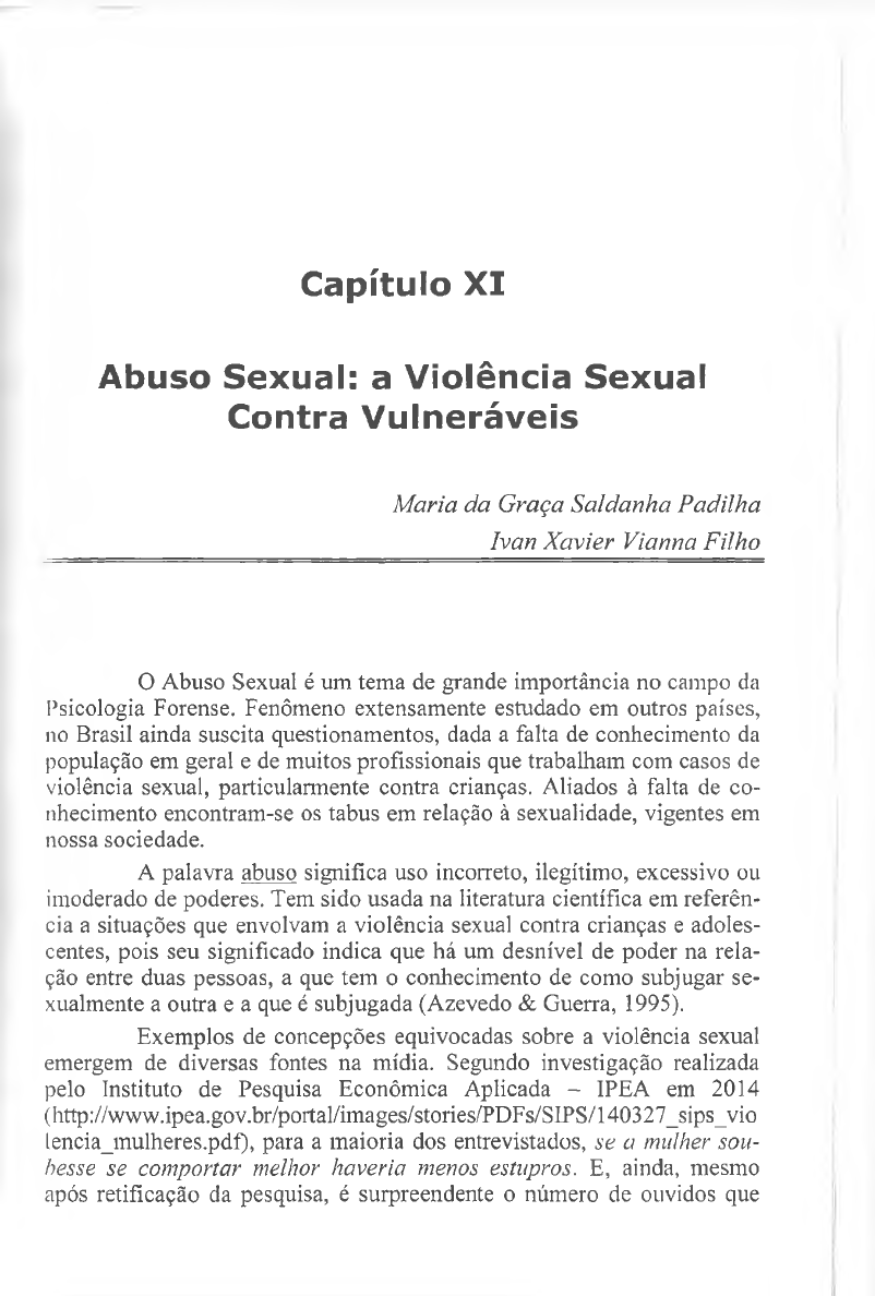 Capítulo XI Abuso Sexual: a Violência Sexual Contra Vulneráveis Maria da Graça Saldanha Padilha Ivan Xavier Vianna Filho O Abuso Sexual é um tema de grande importância no campo da Psicologia Forense. Fenômeno extensamente estudado em outros países, no Brasil ainda suscita questionamentos, dada a falta de conhecimento da população em geral e de muitos profissionais que trabalham com casos de violência sexual, particulannente contra crianças. Aliados à falta de co nhecimento encontram-se os tabus em relação à sexualidade, vigentes em nossa sociedade. A palavra abuso significa uso incorreto, ilegítimo, excessivo ou imoderado de poderes. Tem sido usada na literatura científica em referên cia a situações que envolvam a violência sexual contra crianças e adoles centes, pois seu significado indica que há um desnível de poder na rela ção entre duas pessoas, a que tem o conhecimento de como subjugar se xualmente a outra e a que é subjugada (Azevedo & Guerra, 1995). Exemplos de concepções equivocadas sobre a violência sexual emergem de diversas fontes na mídia. Segundo investigação realizada pelo Instituto de Pesquisa Econômica Aplicada - 1PEA em 2014 (http://www.ipea.gov.br/portal/images/stories/PDFs/SIPS/140327_sips_vio lencia_mulheres.pdf), para a maioria dos entrevistados, se a mulher sou besse se comportar melhor haveria menos estupros. E, ainda, mesmo após retificação da pesquisa, é surpreendente o número de ouvidos que INDEX BOOKS GROUPS: Perpetuando impressões! INDEX BOOKS GROUPS: Perpetuando impressões! http://www.ipea.gov.br/portal/images/stories/PDFs/SIPS/140327_sips_vio 184 Maria da Graça Saldanha Padilha / Ivan Xavier Vianna Filho sustenta a possibilidade de a vestimenta poder justificar o estupro (26%). Há fundamento jurídico-penal para a conclusão apresentada? No filme O Processo do Desejo, do diretor italiano Marco Bel- lochio, não se apercebendo de que o museu no qual se encontrava fecha ria em determinado horário, uma mulher permanece presa no seu interior até o dia seguinte, dele saindo por ocasião da abertura. Ao longo da noite encontra um homem com quem se envolve sexualmente. Descobre, po rém, depois, que o parceiro tinha a chave da porta do museu e, sentindo- -se por ele traída, o denuncia. E é no julgamento desse homem, acusado pela prática de estupro, que se trava um rico diálogo que tem por objeto o valor a ser preservado. Em outras palavras e por um lado, diz a defesa que o acusado respeitou vontade do corpo e o desejo da mulher. Em con trapartida, afirma a acusação, houve repúdio à vontade intelectual e racio nal da mulher, que não queria praticar o ato sexual. Qual dos valores em cotejo deve prevalecer? Houve ou não crime sexual? Ainda nessa linha, procedem as acusações de pedofilia envol vendo Woody Allen e sua filha adotiva, no início dos anos 1990? Seria o caso de um pai-negação de pai que violentou a enteada? Ou de uma mãe- -negação de mãe, uma Medeia, que criou a versão e manipulou a filha para se vingar do ex-esposo? E a vítima, filha comum do casal, seria inocente, porque teria denunciado o fato em decorrência de falsa de me mória de abuso, provocada pelo inconformismo de Mia Farrow com o casamento do marido de outrora com a enteada, sua filha adotiva. Qual o diagnóstico jurídico do caso? E qual o diagnóstico psicológico do caso? O desenvolvimento tecnológico, o incremento da internet, a di fusão imediata de informações pelos meios de comunicação, a maior inserção das mulheres no campo profissional, o reconhecimento da sua independência, a mudança dos costumes, a flexibilização de valores, o surgimento de novas demandas populares, entre tantos outros fatores, têm sido responsáveis pela constante reivindicação de adequação da legisla ção, inclusive penal, às novas realidades. E, assim, no Brasil, em menos de dez anos, sobrevieram três significativas alterações do Código Penal (CP) - na parte dos crimes sexuais (Jesus, 2010). Foram criados novos tipos penais (assédio sexual), eliminados outros (sedução) e, ainda, fun didas, em um mesmo dispositivo, condutas antes dispostas em artigos distintos. E o caso do estupro e atentado violento ao pudor, que passaram a ter o mesmo domicílio normativo (art. 213, CP). Para os fins de que trata o presente texto, o que se revela impor tante é saber que existem vários crimes sexuais que tem como vítimas pessoas que a lei considera vulneráveis. Entre estes, (a) estupro contra INDEX BOOKS GROUPS: Perpetuando impressões! INDEX BOOKS GROUPS: Perpetuando impressões! Introdução à Psicologia Forense 185 vulnerável - art. 217-A, CP, (b) indução de vulnerável para satisfazer a lascívia de outrem - art. 218, CP, e (c) satisfação da lascívia na presença de criança ou adolescente, art. 218-A, do CP. Tratar-se-á, nesta oportunidade, do estupro contra vulnerável. E considerado vulnerável a) o menor de 14 anos, b) a pessoa que por en fermidade ou doença mental não tem discernimento para praticar o ato e c) a pessoa que, por outra causa, não pode oferecer resistência. O termo abuso sexual será utilizado para as situações em que o vulnerável é o menor de 14 anos e o adolescente entre 14 e 18 anos, que também pode ser vítima de relações abusivas. Na primeira parte do texto serão abordadas as definições de abuso sexual contra crianças e adolescentes, primeira classe de vulnerá veis, os dados epidemiológicos, suas consequências e as implicações desses conhecimentos para a Psicologia Forense, interface da Psicologia com o Direito. Na segunda parte, serão abordadas questões jurídico- -penais relativas ao estupro contra vulnerável, nas suas três categorias, discutindo-se a presunção absoluta da violência e as penas previstas no Código Penal para esse crime. Abuso Sexual contra Crianças e Adolescentes Definições de termos De acordo com Eisenstein (2004), abuso sexual é “qualquer ato ou cont