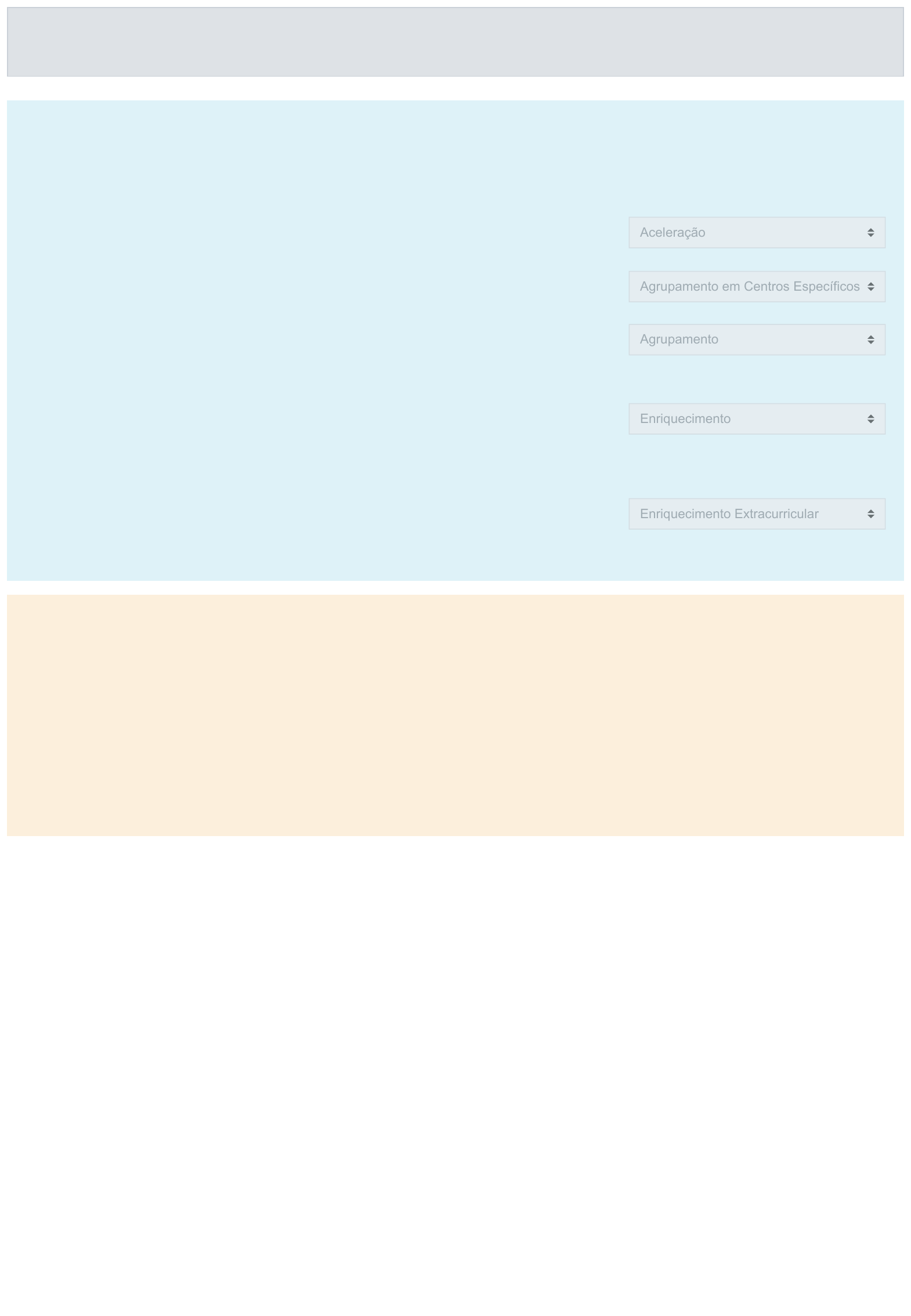 Questão 1 Correto Atingiu 20 de 20 Após a identificação das Altas Habilidades/Superdotação do estudante é chegado o momento de realizar a potencialização deste estudante. Mediante as diversas possibilidades de desenvolvimento das habilidades do estudante em questão, três alternativas de atendimento especializado se destacam: enriquecimento, agrupamento e aceleração. Para cada definição abaixo indique a alternativa de atendimento especializado correta. Tradicionalmente, significa cumprir o programa escolar em menor tempo. Variando desde “saltar” séries até a flexibilização do currículo escolar para que etapas possam ser cumpridas em menos tempo do que o estabelecido. Esta modalidade deverá ser indicada quando os estudantes têm habilidades específicas e precisam suplementar o que já sabem individualmente contribuindo para o seu avanço. Consiste em agrupar estudantes em escolas, sejam na sala de AEE, ou sob forma de pequenos grupos atendidos em salas de aula regular de forma diferenciada dos demais estudantes, levando em consideração a área de interesse, o nível de habilidade ou ainda o desempenho. Possui uma definição ampla e diversificada, para os autores Heward e Or-lansky (citado por Gibson & Efinger, 2001) o enriquecimento consiste em uma “abordagem educacional que oferece à criança experiências de aprendizagem diversas das que o currículo normalmente apresenta”. Para outros, consiste em solicitar ao estudante o desenvolvimento de projetos originais em determinadas áreas de conhecimento, podendo acontecer tanto na própria sala de aula como através de atividades extracurriculares. Esta modalidade acontecerá por meio de mentores que contribuirão para o desenvolvimento do potencial do estudante. Os mentores poderão ser o professor de Atendimento Educacional Especializado (AEE), o professor regente em consonância com a área de interesse do estudante, um profissional especialista que assumirá a função de “parceria” e que não faça parte do quadro de profissionais da escola. Aceleração Agrupamento em Centros Específicos Agrupamento Enriquecimento Enriquecimento Extracurricular Sua resposta está correta. A resposta correta é: Tradicionalmente, significa cumprir o programa escolar em menor tempo. Variando desde “saltar” séries até a flexibilização do currículo escolar para que etapas possam ser cumpridas em menos tempo do que o estabelecido. → Aceleração, Esta modalidade deverá ser indicada quando os estudantes têm habilidades específicas e precisam suplementar o que já sabem individualmente contribuindo para o seu avanço. → Agrupamento em Centros Específicos, Consiste em agrupar estudantes em escolas, sejam na sala de AEE, ou sob forma de pequenos grupos atendidos em salas de aula regular de forma diferenciada dos demais estudantes, levando em consideração a área de interesse, o nível de habilidade ou ainda o desempenho. → Agrupamento, Possui uma definição ampla e diversificada, para os autores Heward e Or-lansky (citado por Gibson & Efinger, 2001) o enriquecimento consiste em uma “abordagem educacional que oferece à criança experiências de aprendizagem diversas das que o currículo normalmente apresenta”. Para outros, consiste em solicitar ao estudante o desenvolvimento de projetos originais em determinadas áreas de conhecimento, podendo acontecer tanto na própria sala de aula como através de atividades extracurriculares. → Enriquecimento, Esta modalidade acontecerá por meio de mentores que contribuirão para o desenvolvimento do potencial do estudante. Os mentores poderão ser o professor de Atendimento Educacional Especializado (AEE), o professor regente em consonância com a área de interesse do estudante, um profissional especialista que assumirá a função de “parceria” e que não faça parte do quadro de profissionais da escola. → Enriquecimento Extracurricular. Questão 2 Correto Atingiu 20 de 20 Observe a figura do “Modelo Triádico de Enriquecimento” proposto por Joseph Renzulli para a Escola. Após analisa-lo, marque a alternativa correta: Escolha uma opção: a. Todas as alternativas estão corretas. b. As atividades do Tipo I, II e III não obedecem a uma ordem linear. Dessa forma, uma atividade do Tipo I pode desencadear uma atividade do Tipo III e uma do Tipo II pode requerer uma Atividade do Tipo I. c. As atividades do Tipo III estimulam os estudantes a buscarem respostas para problemas reais, o que pode envolver, por exemplo, o desenvolvimento de oficinas, trabalhos com grupos de pesquisa. d. O objetivo principal da atividade do Tipo II é instigar os estudantes a “como fazer”, o que poderia envolver o treinamento de técnicas de desenho, produção de textos, manuseio de equipamentos tecnológicos, treinamento para realização de entrevistas entre outras atividades englobando diferentes metodologias e tecnologias que exploram a criatividade e o conhecimento. e. As atividades do Tipo I, conhecidas como Atividades Exploratórias, devem envolver os assuntos pouco explorado na escola, utilizando diferentes metodologias atrativas para o envolvimento do estudante. Sua resposta está correta. A resposta correta é: Todas as alternativas estão corretas. Questão 3 Correto Atingiu 20 de 20 Questão 4 Correto Atingiu 20 de 20 Após ler o relato de caso abaixo e estudar o conteúdo disponibilizado no material de estudo, assinale a melhor alternativa de atendimento educacional especializado que deverá ser proposta à estudante. Angelina é uma adolescente de 14 anos, muito expansiva, alegre e independente. Sempre teve muita facilidade de aprendizagem na área acadêmica e desenha muito bem. Seus pais afirmam que ela sempre foi precoce tanto na área artística (desenho) quanto na aprendizagem acadêmica. Angelina sempre aprendeu de forma rápida, com pouca instrução, tem independência nos estudos, é uma ávida leitora, tem ótima memória, é muito curiosa, al