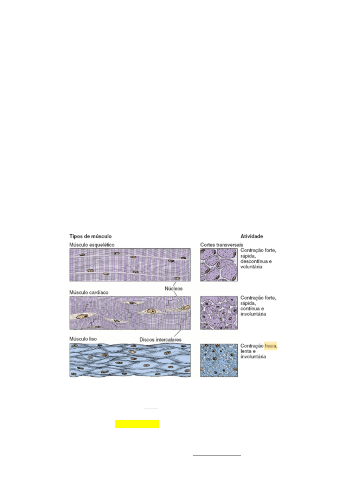 Tecido Muscular - Resumo Completo #Características gerais ● Formado por células alongadas → citoesqueleto especializado → função de diminuir e aumentar o tamanho da célula ● Fortemente associado ao tecido conjuntivo → ○ transmite a força de contração ○ permite o trânsito de capilares e nervos até o tecido muscular ● Há 3 tipos de tecido muscular: ○ tecido muscular estriado esquelético ○ tecido muscular estriado cardíaco ○ tecido muscular liso À esquerda da imagem: corte longitudinal À direita da imagem: corte transversal ● Músculo esquelético → contração forte, rápida e voluntária ● Músculo cardíaco → contração forte, rápida e involuntária ● Músculo Liso → contração forte , lenta e involuntária ➔ Atenção para um grave equívoco marcado pela cor laranja: músculo liso não pode ter a sua contração considerada fraca; basta pensar no exemplo das contrações do parto, assim, devemos pensar: as contrações para expulsar um bebê no útero são contrações fracas? não! logo, trata-se de um tecido com contrações fortes também. ● Célula mioepitelial → um tipo especializado de célula epitelial → TAMBÉM sofre encurtamento MAS não é considerada uma célula muscular #Esquema dos 3 tipos de células musculares mais a célula mioepitelial (que não faz parte das células musculares). ● Devido a sua alta especialização, o tecido muscular recebe diferentes nomes p/ suas estruturas: ○ célula muscular → fibra muscular ○ membrana plasmática → membrana sarcoLEMA! ○ citoplasma → sarcoplasma ○ retículo endoplasmático liso → retículo sarcoplasmático MÚSCULO ESQUELÉTICO ● Desenvolvimento do músculo → Importante lembrar que, assim como quase todas as estruturas, nesse caso também iremos ter uma unidade básica originando estruturas maiores e essas estruturas maiores originando outras estruturas maiores ainda, logo, é de se imaginar que iremos ter uma célula precursora de todos os eventos, nesse caso, o mioblasto ○ mioblastos (células do músculo) → começam a se unir → formam células longas e com vários núcleos (multinucleadas) → chamadas de miotúbulo s ○ os miotúbulos → produzem os filamentos contráteis (miofilamentos) ○ os miofilamentos (filamentos contráteis) → se juntam → miofibrilas ● Crescimento muscular: dois processos diferentes contribuem para o crescimento do músculo ○ Hiperplasia → contribui menos para o aumento de volume → aumento do número de mioblastos → ainda pode sofrer mitose ○ Hipertrofia → cada célulazinha irá aumentar o número de miofilamentos → aumento do volume da célula → aumento do volume do músculo Atenção ! Uma célula muscular estriada esquelética nunca vai se dividir → nessas células, não existe a possibilidade de uma célula estriada já diferenciada se dividir Para fazer mitose, é preciso que a célula tenha formato esférico, coisa que a célula muscular estriada não tem. ● Ação da miostatina : ○ proteína produzida pelas próprias células musculares estriadas esqueléticas ○ regula o crescimento muscular inibindo tanto o processo hiperplásico quanto o hipertrófico → sem ela, teremos um aumento descontrolado do músculo ○ a sua falta ou a disfunção na atividade dos receptores acarreta em um aumento anormal da musculatura ○ a mutação acontece em diferentes espécies → roedores, bovinos, humanos… ○ ligada a um pro-peptídeo → só se torna ativa no meio extracelular → clivagem ○ atua sobre um receptor de membrana chamado Activina IIB → por onde exerce o efeito de inibição do crescimento muscular A mutação também pode afetar humanos.; Liam Hoekstra aos 3 anos de idade: Fonte: https://www.thesun.co.uk/news/17225624/worlds-strongest-toddler-unrecognisable-now/ ● célula estriada esquelética → células multinucleadas → dezenas de mioblastos → muitos núcleos ● células longas e cilíndricas → citoplasma (sarcoplasma) ocupado por miofibrilas ● células estriadas → estriações transversais ● núcleos periféricos ● a contração muscular inicia em uma estrutura chamada SARCÔMERO → delimitada por 2 discos Z ● cada sarcômero contém 1 banda A → bandas escuras ● cada sarcômero contém 2 metades de banda I → bandas claras ● filamento grossos → formados pela associação de várias proteínas miosina → banda escura → região central ● filamentos finos → formados pela associação de várias proteínas actina → disco Z ● endomísio → produzido pela própria célula muscular → membrana plasmática associado com fibras reticulares (colágeno tipo III) ● túbulos T → são projeções da membrana plasmática (sarcolema) para o interior da célula → se conectam com estruturas dentro da célula ● miofibrilas → estruturas cilíndricas formadas por miofilamentos de actina e miosina → elas quem contém os sarcômeros → ocupa a maior parte do citoplasma #RETÍCULO SARCOPLASMÁTICO (REL) ● envolve cada uma das miofibrilas ● armazena Ca2+ ○ apresenta canais de Ca2+ ⇒ quando abrem a membrana é despolarizada (torna-se positiva) ● apresentam cisternas (redes) que cercam um túbulo T (tríade, formada por invaginações da membrana) ● regula a contração muscular: ○ quando despolarizado → libera Ca2+ para o citoplasma → sem gasto de energia → início da contração ○ depois retira Ca2+ do citoplasma → com gasto de energia → através da calcequestrina → para o relaxamento #Representação esquemática de uma fibra muscular ➔ A: fibra muscular com a membrana plasmática(vermelho) e as miofibrilas (verde) ➔ B: detalhamento de uma tríade (invaginação da membrana plasmática, a miofibrila e o retículo sarcoplasmático) ➔ C: membrana do túbulo T (membrana plasmática) está muito próxima da membrana do REL, quando o túbulo T despolariza causa despolarização da membrana do REL; isso vai