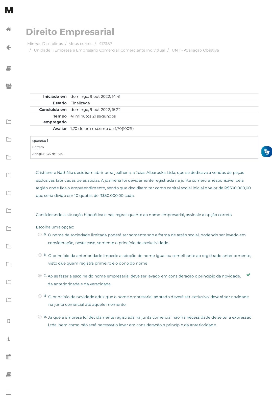 Minhas Disciplinas / Meus cursos / 417387 / Unidade 1: Empresa e Empresário Comercial: Comerciante Individual / UN 1 - Avaliação Objetiva Direito Empresarial Iniciado em domingo, 9 out 2022, 14:41 Estado Finalizada Concluída em domingo, 9 out 2022, 15:22 Tempo empregado 41 minutos 21 segundos Avaliar 1,70 de um máximo de 1,70(100%) Questão 1 Correto Atingiu 0,34 de 0,34 Cristiane e Nathália decidiram abrir uma joalheria, a Joias Albaruska Ltda, que se dedicava a vendas de peças exclusivas fabricadas pelas sócias. A joalheria foi devidamente registrada na junta comercial responsável pela região onde �ca o empreendimento, sendo que decidiram ter como capital social inicial o valor de R$500.000,00 que seria divido em 10 quotas de R$50.000,00 cada. Considerando a situação hipotética e nas regras quanto ao nome empresarial, assinale a opção correta Escolha uma opção: a. O nome da sociedade limitada poderá ser somente sob a forma de razão social, podendo ser levado em consideração, neste caso, somente o princípio da exclusividade. b. O princípio da anterioridade impede a adoção de nome igual ou semelhante ao registrado anteriormente, visto que quem registra primeiro é o dono do nome c. Ao se fazer a escolha do nome empresarial deve ser levado em consideração o princípio da novidade, da anterioridade e da veracidade. d. O princípio da novidade aduz que o nome empresarial adotado deverá ser exclusivo, deverá ser novidade na junta comercial até aquele momento. e. Já que a empresa foi devidamente registrada na junta comercial não há necessidade de se ter a expressão Ltda, bem como não será necessário levar em consideração o princípio da anterioridade. https://avap.multivix.edu.br/my/ https://avap.multivix.edu.br/course/view.php?id=19084 https://avap.multivix.edu.br/course/view.php?id=19084§ion=2 https://avap.multivix.edu.br/mod/quiz/view.php?id=1265262 https://avap.multivix.edu.br/my/ https://avap.multivix.edu.br/course/view.php?id=19084 https://avap.multivix.edu.br/user/index.php?id=19084 https://avap.multivix.edu.br/course/view.php?id=19084§ion=1 https://avap.multivix.edu.br/course/view.php?id=19084§ion=2 https://avap.multivix.edu.br/course/view.php?id=19084§ion=3 https://avap.multivix.edu.br/course/view.php?id=19084§ion=4 https://avap.multivix.edu.br/course/view.php?id=19084§ion=5 https://avap.multivix.edu.br/course/view.php?id=19084§ion=6 https://avap.multivix.edu.br/course/view.php?id=19084§ion=7 https://avap.multivix.edu.br/course/view.php?id=19084§ion=8 https://avap.multivix.edu.br/course/view.php?id=19084§ion=9 https://avap.multivix.edu.br/course/view.php?id=19084§ion=10 https://avap.multivix.edu.br/course/view.php?id=19084§ion=11 https://avap.multivix.edu.br/hooks/portal/ https://avap.multivix.edu.br/mod/page/view.php?id=1252%2F%22%20target%3D%22_blank https://avap.multivix.edu.br/calendar/view.php/ https://avap.multivix.edu.br/local/staticpage/view.php?page=biblioteca https://portalweb.multivix.edu.br/gabaritos/login.aspx https://avap.multivix.edu.br/ Questão 2 Correto Atingiu 0,34 de 0,34 Questão 3 Correto Atingiu 0,34 de 0,34 João de Deus, famoso empresário no ramo de sorvete é um empresário individual, no entanto foi submetido à um exame por junta médica que atestou que ele é esquizofrênico, o que fez com que fosse quali�cado como incapaz. Por ter se tornado intelectualmente incapaz seu �lho solicitou sua interdição para que pudesse representá-lo diante de seu empreendimento. Considerando a situação apresentada, assinale a opção correta. Escolha uma opção: a. O �lho de João de Deus, caso consiga a interdição do pai, poderá continuar exercendo a atividade empresarial do pai. b. João de Deus deve dar baixa no registro de sua empresa para a extinção da mesma. c. Caso haja clientes que ainda não receberam sua mercadoria (sorvete por atacado) e pagaram à vista não poderão reclamar prejuízo em razão da doença de João de Deus. d. Se o �lho de João de Deus for impedido por qualquer motivo não poderá gerenciar o empreendimento do pai e terá de extinguir a empresa. e. Por João de Deus ser empresário individual deve seu empreendimento ser extinto, pois nesse caso não existe a possibilidade de seu �lho gerir o negócio. Suzane quer constituiu uma EIRELI com sede em Belo Horizonte para a comercializar os quadros que pinta, cuja matéria prima será adquirida em casas de artesãos de BH. Ela pretende adotar como nome empresarial a denominação social e solicitou um amigo, formado em ciências contábeis, para administrar seu empreendimento. Considerando a hipótese descrita, assinale a opção correta. Escolha uma opção: a. A EIRELI deve ser construída a partir de 100 vezes o menor salário mínimo vigente no país b. A empresa só poderá ser administrada por Suzane. c. Suzane não poderá adotar, por nome empresarial, �rma ou denominação sendo obrigatória a expressão “EIRELI” d. Suzane poderá constituir EIRELI para comercializar seus quadros, pois a EIRELI pode ser constituída para atividades empresárias, e não empresárias e. A EIRELI só pode ser constituída de forma originária. https://avap.multivix.edu.br/my/ https://avap.multivix.edu.br/course/view.php?id=19084 https://avap.multivix.edu.br/user/index.php?id=19084 https://avap.multivix.edu.br/course/view.php?id=19084§ion=1 https://avap.multivix.edu.br/course/view.php?id=19084§ion=2 https://avap.multivix.edu.br/course/view.php?id=19084§ion=3 https://avap.multivix.edu.br/course/view.php?id=19084§ion=4 https://avap.multivix.edu.br/course/view.php?id=19084§ion=5 https://avap.multivix.edu.br/course/view.php?id=19084§ion=6 https://avap.multivix.edu.br/course/view.php?id=19084§ion=7 https://avap.multivix.edu.br/course/view.php?id=19084§ion=8 https://avap.multivix.edu.br/course/view.php?id=19084§ion=9 https://avap.multivix.edu.br/course/view.php?id=19084§ion=10 https://avap.multivix.edu.br/course/view.php?id=19084