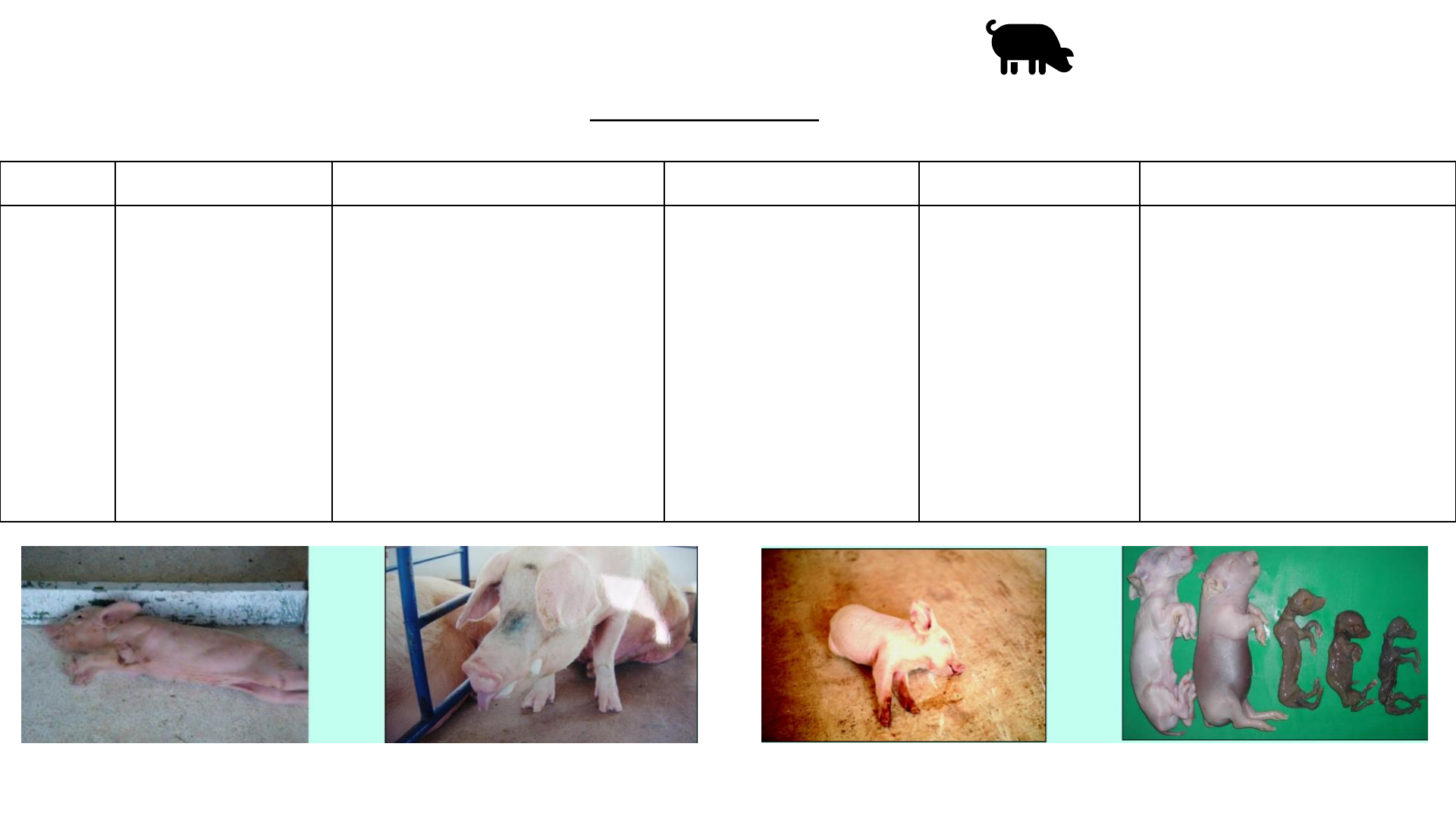 Doenças Virais de suínos Doença de Aujeszky Doença Características Sinais Clínicos Patogênese Diagnóstico Prevenção Doença de Aujeszky (Suid herpesvírus 1 ) • Pseudoraiva suína; • Também infecta ruminantes, equinos, cães e felinos; • Transmissão limitada, mas de rápida ação e fatal (SNC); • Rs em erradicação; • Resistente no meio, permanece em produtos cárneos; • Cresce em cultivo celular. • Adultos: respiratórios e reprodutivos; • Jovens: nervosos • Respiratórios ➝jovens no desmame: tosse, espirros, febre, fezes duras e secas, crescimento deficiente. • Nervosos (encefalite) ➝ lactantes: febre e tremores musculares, paralisias (morte rápida). • Reprodutivos ➝ fêmeas: aborto, natimortos, fetos mumificados, macerados ou fracos. • Via oral ou nasal ➝ Orofaríngeo 1ª replicação ➝ Gânglios nervosos craniais e medula ➝ SNC meningoencefalite ➝ Morte; • Mortalidade e morbilidade. Transmissão: • horizontal ➝ aerossóis (saliva e secreções nasais) e carcaças; • vertical ➝ transplacentária • Sorologia➝ ELISA e Soroneutralização; • Soropositivos: latência viral – fontes de vírus; • Soronegativos: susceptíveis • Imunofluorescência: tecidos alterados; • Isolamento viral: cérebro, abortos, pulmão e rins; • PCR: rápido e confirmatório; • Isolar animais doentes; • Vacinação – somente em focos (controle com ELISA gE); Programa de Erradicação: • Vacinação permitida só em focos; • Vigilância sanitária; • Monitoramento sorológico da população; • Controle de movimento de animais e produtos; • Identificar e eliminar suínos infectados; • Certificação de duas sorologias negativas com intervalo de 180 dias. Peste Suína Clássica Doença Características Sinais Clínicos Patogênese Diagnóstico Prevenção Peste Suína Clássica (Pestivírus C) • Família Flaviridae; • Hospedeiros: suínos domésticos e selvagens; • Fonte de vírus: animal infectado(sangue, saliva, fezes, urina, secreções); • Suínos subclínicos, PI ou crônicos; • Maioria dos países considerados livre sem vacinação pela OIE; • Restos de alimentos, vetores mecânicos e Artrópodes. • Mortalidade e morbilidade. • Periaguda➝ morte súbita; • Aguda➝ curso 7 dias; • Febre alta, anorexia, depressão, conjuntivite, dispneia, tosse, incoordenação motora e vômito. • Severa leucopenia, púrpura no abdômen e orelhas, lesão-infarto baço. • Sub-aguda ou crônica➝ + frequente, curso longo e intermitente: • Retardo de crescimento, diarréia crônica, dermatite, púrpura, infecções bacterianas secundárias, lesões – atrofia de timo, centros germinativos e baço, transtornos reprodutivos Vírus via oronasal➝ Tonsilas: replicação 1ª➝ viremia➝ células endoteliais, órgãos linfoides e medula óssea, replicação 2ª (transtornos reprod., febre e diarreia) ➝ febre, leucopenia e hemorragia➝morte. Transmissão • Horizontal➝ secreções, excreções, carcaças e fômites; • vertical➝ transplacentária; • Diagnóstico clínico: difícil → confirmação laboratorial • Sorologia : ELISA e SN • Imunofluorescência: nódulos, linfáticos, baço, tonsilas, pâncreas • Isolamento viral: cultivo celular, não causa ecp → Imunoperoxidase ou Imunofluorescência • PCR: mais preciso, mais rápido, diferenciar Pestivirus • Vacinação é proibida (somente em focos); • Vigilancia sanitária; • Monitoramento sorológico população (ELISA); • Controle de movimento de animais e produtos; • Identificar e eliminar suínos infectados; • Javalis. Peste Suína Africana Doença Características Sinais Clínicos Patogênese Diagnóstico Prevenção Peste Suína Africana (Família Asfarviridae) • Erradicada na África desde 1987; • Permanece infectante em carcaças e produtos cárneos (comum a entrada do vírus dessa forma em outros países); • Uso para alimentar suínos ➝ surtos; • Javalis africanos não apresentam sinais, mas são reservatórios; • Sobreviventes são portadores e disseminadores; • Induz fracamente a produção de anticorpos • Febre; • Hemorragias; • Morte súbita; • Alta mortalidade • Carrapatos do gênero Ornithodoros; • Doença aguda em suínos e javalis; • Diagnóstico laboratorial: imunofluorescência em baço, tonsilas e linfonodos; • Isolamento viral: sangue, secreções e tecidos linfóides➝ induz ecp. • Erradicação (zonas livres); • Vigilância sanitária; • Identificar e eliminar animais e produtos infectados. Síndrome Respiratória e Reprodutiva de Suínos Doença Características Sinais Clínicos Diagnóstico Prevenção Síndrome respiratória e Reprodutiva de Suínos –PRRRS (Família Arteriviridae) • Hospedeiros: suídeos; • Causa infecção persistente e assintomática (até 200 dias), associada a outros fatores pode ser severa. Maior incidência em meses frios; • Morbilidade e mortalidade; • Anorexia, febre, cianose (orelhas, focinho e vulva); • Reprodutivos: agalaxia, aborto tardio (110 dias), mumificados, natimortos, nascimentos prematuros; • Nascimentos a termo congenitamente infectados são pouco viáveis➝ sinais respiratórios • Soroneutralização: amostras pareadas; • Isolamento viral: leitões moribundos e suabe faríngeo; • PCR de tecidos • Isolar e eliminar doentes • Vacina acentuada em regiões com problema (não disponível no Brasil ➝ exótico) Doença Características Sinais Clínicos Diagnóstico Prevenção Circovirose Suína (Família Circoviridae) • Síndrome da dermatite e nefropatia suína; • Associado com PRRS, PPV, desmame e estresse; • Problemas de cutâneos, nefropatia, reprodutivos e sistêmicos; • Emagrecimento; • Dispneia e tosse; • Aumento de linfonodos e diarreia; • Predispõe a infecções secundárias; • Doenças de pele; • Reprodutivos (abortos, mumificações e natimortos). • PCR; • Isolamento viral (