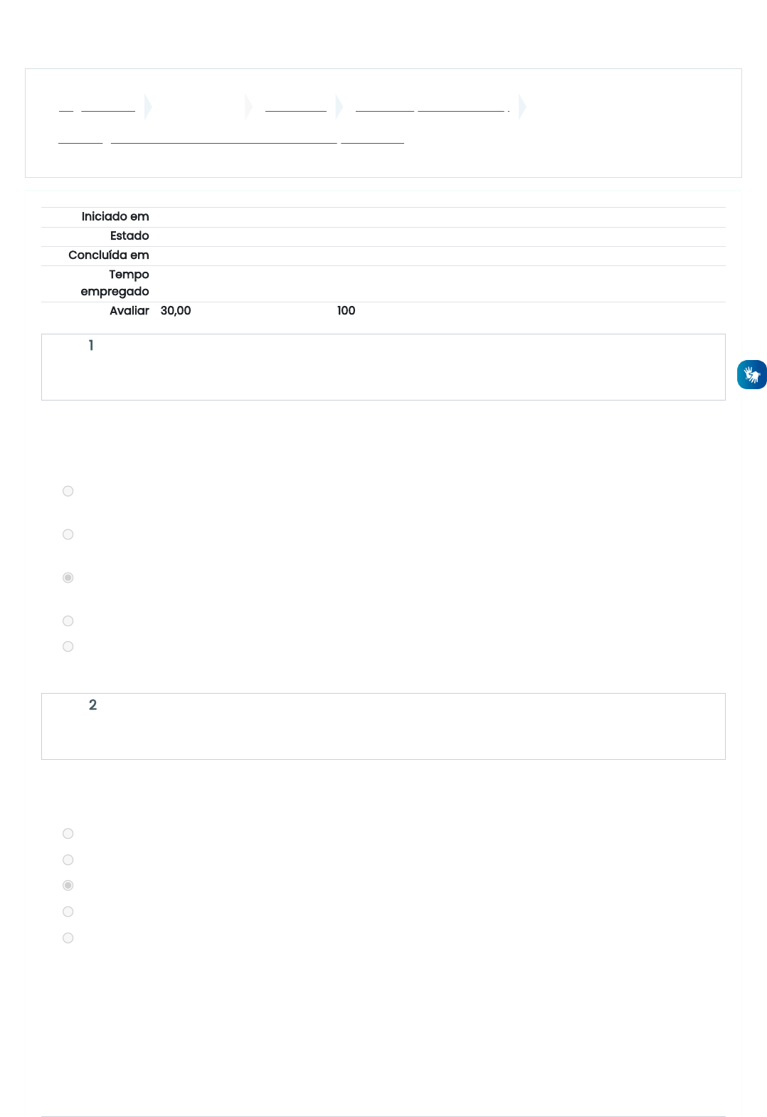 Página inicial Meus cursos TECASS-22 Módulo III (De 12.09 a 09.10) Tecnologia Assistiva no contexto educacional - Questionário Iniciado em domingo, 16 out 2022, 09:36 Estado Finalizada Concluída em domingo, 16 out 2022, 09:48 Tempo empregado 12 minutos 23 segundos Avaliar 30,00 de um máximo de 30,00(100%) Questão 1 Completo Atingiu 3,00 de 3,00 Questão 2 Completo Atingiu 3,00 de 3,00 O serviço de TA no contexto educacional inicia pela avaliação da necessidade de recurso de TA pelo aluno com deficiência. Para fazer essa avaliação, podemos utilizar uma ficha ou documento, no qual é importante constar: a. Dados de identificação do estudante e dos familiares, histórico médico mencionando doenças que o estudante teve ao longo da vida e histórico enquanto usuário de recursos de TA b. Dados de identificação do estudante, tipo de deficiência com laudo médico e atividade que precisa realizar. c. Dados de identificação do estudante, sua deficiência ou necessidades específicas, seu histórico enquanto usuário de recursos de TA e atividades que o estudante deseja realizar. d. Apenas o tipo de deficiência. e. Apenas dados de identificação do estudante e tipo de deficiência. São exemplos de produtos de apoio para a escrita: a. Ferramenta de ditado, folhas de caligrafia e materiais ampliados; b. Extensores, lápis adaptado e legendas. c. Plano inclinado, engrossadores e ferramenta de ditado; d. Legendas, gravador portátil e corretor ortográfico; e. Plano inclinado, materiais em relevo e engrossadores; https://mch.ava.ifsuldeminas.edu.br/ https://mch.ava.ifsuldeminas.edu.br/course/view.php?id=175§ion=0 https://mch.ava.ifsuldeminas.edu.br/course/view.php?id=175§ion=8 https://mch.ava.ifsuldeminas.edu.br/mod/quiz/view.php?id=9076 Questão 3 Completo Atingiu 3,00 de 3,00 Questão 4 Completo Atingiu 3,00 de 3,00 Questão 5 Completo Atingiu 3,00 de 3,00 Os itens a seguir são exemplos de serviços de TA no contexto educacional, com exceção de: a. Fazer uma avaliação para verificar se o estudante necessita de TA b. Adaptar ou desenvolver um recurso c. Computador com leitor de tela d. Realização de testes com recursos de TA e. Auxílio e acompanhamento do estudante no uso de uma TA Indique se a afirmativa é verdadeira ou falsa Durante os testes com recursos de Tecnologia Assistiva, ou seja, o momento em que o estudante testa o uso dos recursos que foram sugeridos, como possíveis soluções, e que o auxiliarão no contexto educacional, é muito importante documentar o processo, através de fotos e vídeos. Escolha uma opção: Verdadeiro Falso É importante que videoaulas tenham para estudantes com deficiência auditiva e para os estudantes surdos. LIBRAS LEGENDA Questão 6 Completo Atingiu 3,00 de 3,00 Questão 7 Completo Atingiu 3,00 de 3,00 Questão 8 Completo Atingiu 3,00 de 3,00 Assinale a alternativa que apresenta quatro exemplos de recursos de Tecnologia Assistiva. a. Computador, teclado colméia, piso tátil e cadeira de rodas. b. Pranchas de comunicação aumentativa e alternativa (CAA), lupa para celular, Atendimento Educacional Especializado (AEE) e bengala. c. Facilitador para segurar e utilizar o lápis, tablet com aplicativo para comunicação alternativa, bengala e piso tátil. d. Atendimento Educacional Especializado (AEE), manual de uso de um acionador, teclado adaptado e piso tátil. e. Cadeira de rodas, ficha de acompanhamento de aluno incluso na escola regular, mouse adaptado e colher adaptada. Leia o texto abaixo e complete adequadamente com as palavras que faltam: De acordo com Bersch (2009), o serviço de TA na educação possui perfil ____________________ e busca resolver as ______________, propondo alternativas para que possam participar com autonomia das atividades no contexto _____________________ . a. dificuldades tarefas, questões pessoais b. domiciliar, social, escolar c. propositivo, tarefas, escolar d. propositivo, definitivo, resolutivo e. escolar, tarefas, propositivo Leia o texto abaixo e complete adequadamente com as palavras que faltam: Ao buscar e selecionar um recurso de TA, além de considerar as necessidades e ___________________ do estudante, o serviço de TA no contexto educacional deve considerar também as __________________ que o estudante busca desempenhar e o ________________ em que o ______________ de TA será utilizado. a. contexto, recurso, habilidades, tarefas b. contexto, tarefas, habilidades, recurso c. habilidades, recurso, contexto, tarefas d. habilidades, tarefas, contexto, recurso e. recurso, habilidades, tarefas, contexto Questão 9 Completo Atingiu 3,00 de 3,00 Questão 10 Completo Atingiu 3,00 de 3,00 No desenvolvimento de um recurso de TA para um estudante é importante sempre colocar o usuário no centro do processo, pois o recurso é individual e pensado para atender à sua demanda específica. Escolha uma opção: Verdadeiro Falso O serviço de TA no contexto educacional ocorre, em grande parte, no: a. Setor Pedagógico b. Atendimento Educacional Especializado c. Contexto das associações de pessoas com deficiência d. laboratório de informática e. Setor de Assistência Estudantil Atividade anterior ← Fórum de Discussão II Seguir para... Próxima atividade O papel da tecnologia assistiva na inclusão digital dos portadores de deficiência visual. → Manter contato https://mch.ava.ifsuldeminas.edu.br/ cead.mch@ifsuldeminas.edu.br https://mch.ava.ifsuldeminas.edu.br/mod/forum/view.php?id=9073&forceview=1 https://mch.ava.ifsuldeminas.edu.br/mod/resource/view.php?id=9082&forceview=1 https://mch.ava.ifsuldeminas.edu.br/ mailto:cead.mch@ifsuldeminas.edu.br