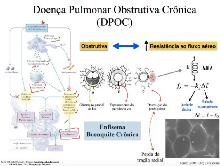 DPOC – Doenças pulmonares obstrutivas crônicas - Enfisema pulmonar e Bronquite crônica Enfisema pulmonar - Idade: geralmente pacientes idosos - O que é: destruição do tecido pulmonar (parede dos alvéolos) com ar aprisionado dentro dos pulmões, - Principal achado tomográfico: aprisionamento aéreo em alto grau - Problema: geralmente pacientes procuram conduta médica quando já estão no nível grave (existe leve, moderado e grave) - Como ocorre: com o uso crônico do cigarro (+ de 400 substâncias tóxicas) toxicidade nas tubulações pulmonares toxicidade nos brônquios toxicidade nos bronquíolos toxicidade nos alvéolos receptor tipo toll de macrófagos reconhecem as substâncias liberam IL-1 e TNF-alfa recrutam P-selectina e E-selectina chamam neutrófilos realizam fagocitose e liberam proteases (metaloproteinases e elastase neutrofílica) elastase neutrofílica começa a causar dano na parede dos alvéolos macrófagos não conseguem dar conta da quantidade de substâncias destruição da parede dos alvéolos ar retido dentro dos pulmões pois os alvéolos não tem a elastina viável para empurrar os pulmões para expulsar o ar bronquite crônica enfisema pulmonar * Enfisema não é evolução de uma bronquite crônica. Todo paciente que tem enfisema tem também bronquite crônica * Alfa 1 antitripsina (se desprendem do fígado): enzimas protetoras das paredes dos alvéolos se aderem aos alvéolos, razão pela qual os pacientes demoram para desenvolver a cronicidade. Inibidoras da elastase - - Local do acúmulo do ar: (A) Enfisema centro acinar: ar no centro do ácino – leve (B) Enfisema paraceptal: ar se cumula perto do septo pulmonar – leve (C) Enfisema panacinar: ar se acumula na totalidade do alvéolo -grave - Sintomas: tosse crônica, dispneia, produção de escarro (volumoso), ausculta pulmonar varia entre redução do murmúrio vesicular aos roncos (barulho como se tivesse água dentro de um cano, ocasionado pela presença do muco) e prolongamento do tempo expiratório devido ao aprisionamento aéreo (estágio avançado) - Biotipo: magro, face angustiada, pronunciamento das fossas supra claviculares, extremidade dos dedos normais e murmúrio reduzido - Avaliação funcional: VEF1 (volume expirado em 1s de maneira forçada) diminuído, volume residual (ar que permanece nos pulmões) aumentado, complacência (estiramento) aumentado, PaO2 diminuída e PaCO2 normal * Pulmões longilíneos (não consegue se expandir lateralmente , retificação diafragmática, diminuição da mobilidade do diafragma, alargamento do mediastino e aumento da área radiolúcida (aprisionamento aéreo) * Caso de enfisema leve – enfisema centro lobular – “bolinhas” indicam o começo de acúmulo de ar * Caso de enfisema um pouco mais grave - “bolinhas” indicam o aprisionamento aéreo * Caso de enfisema mais grave – tecido destruído indica o aprisionamento aéreo (quadro clínico típico: pessoa curvada, fossas supraclaviculares pronunciadas, alimentação inadequada) - Diferença da bronquite crônica e do enfisema: