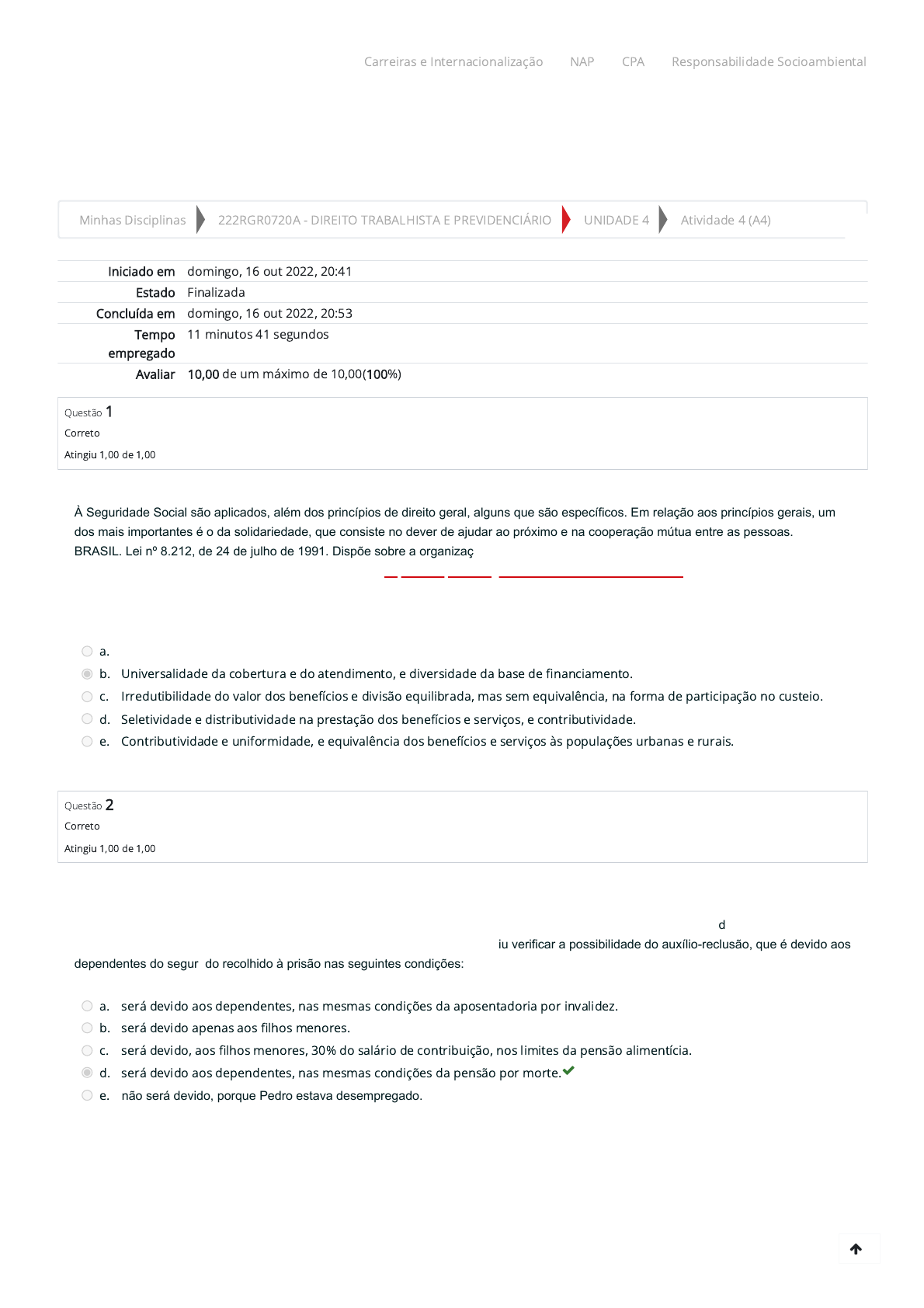 16/10/22, 20:53 Atividade 4 (A4): Revisão da tentativa https://ambienteacademico.com.br/mod/quiz/review.php?attempt=1159281&cmid=488396 1/6 Minhas Disciplinas 222RGR0720A - DIREITO TRABALHISTA E PREVIDENCIÁRIO UNIDADE 4 Atividade 4 (A4) Iniciado em domingo, 16 out 2022, 20:41 Estado Finalizada Concluída em domingo, 16 out 2022, 20:53 Tempo empregado 11 minutos 41 segundos Avaliar 10,00 de um máximo de 10,00(100%) Questão 1 Correto Atingiu 1,00 de 1,00 Questão 2 Correto Atingiu 1,00 de 1,00 À Seguridade Social são aplicados, além dos princípios de direito geral, alguns que são específicos. Em relação aos princípios gerais, um dos mais importantes é o da solidariedade, que consiste no dever de ajudar ao próximo e na cooperação mútua entre as pessoas. BRASIL. Lei nº 8.212, de 24 de julho de 1991. Dispõe sobre a organização da Seguridade Social, institui Plano de Custeio, e dá outras providências. Diário Oficial da União. Disponível em: <http://www.planalto.gov.br/ccivil_03/leis/l8212cons.htm>. Acesso em: 23 ago. 2019. Assinale a alternativa que indica corretamente os princípios norteadores da Seguridade Social: a. Centralidade na base de financiamento, e equidade na forma de participação no custeio. b. Universalidade da cobertura e do atendimento, e diversidade da base de �nanciamento. c. Irredutibilidade do valor dos benefícios e divisão equilibrada, mas sem equivalência, na forma de participação no custeio. d. Seletividade e distributividade na prestação dos benefícios e serviços, e contributividade. e. Contributividade e uniformidade, e equivalência dos benefícios e serviços às populações urbanas e rurais. Pedro, depois de cometer crime de furto qualificado, foi preso em regime fechado, deixando em estado precário sua esposa, Maria, e seus dois filhos menores, Lucas e Cauã, com quatro e dois anos de idade, respectivamente. Pedro tinha sido dispensado da empresa onde trabalhava havia seis meses e estava desempregado. Com isso, Maria decidiu verificar a possibilidade do auxílio-reclusão, que é devido aos dependentes do segurado recolhido à prisão nas seguintes condições: a. será devido aos dependentes, nas mesmas condições da aposentadoria por invalidez. b. será devido apenas aos �lhos menores. c. será devido, aos �lhos menores, 30% do salário de contribuição, nos limites da pensão alimentícia. d. será devido aos dependentes, nas mesmas condições da pensão por morte. e. não será devido, porque Pedro estava desempregado. Carreiras e Internacionalização NAP CPA Responsabilidade Socioambiental https://ambienteacademico.com.br/my/ https://ambienteacademico.com.br/course/view.php?id=17764 https://ambienteacademico.com.br/course/view.php?id=17764§ion=6 https://ambienteacademico.com.br/mod/quiz/view.php?id=488396 http://www.planalto.gov.br/ccivil_03/leis/l8212cons.htm https://informa.fmu.br/carreiras/ https://codely-fmu-content.s3.amazonaws.com/Moodle/NAP/inicial/nap/fmu/index.html https://codely-fmu-content.s3.amazonaws.com/Moodle/CPA/landing_CPA/index.html https://portal.fmu.br/sustentabilidade 16/10/22, 20:53 Atividade 4 (A4): Revisão da tentativa https://ambienteacademico.com.br/mod/quiz/review.php?attempt=1159281&cmid=488396 2/6 Questão 3 Correto Atingiu 1,00 de 1,00 Questão 4 Correto Atingiu 1,00 de 1,00 Maria faleceu por causas naturais há 35 dias e, por se tratar de segurada aposentada da Previdência, seu dependente, Antônio, requereu o benefício de pensão por morte no 30º dia. Paula faleceu há 100 dias, em decorrência de um acidente de carro não relacionado ao trabalho, e sua dependente, Priscila, também requereu o benefício da pensão por morte, no 95º dia do óbito de Paula. BRASIL. Lei nº 8.213, de 24 de julho de 1991. Dispõe sobre os Planos de Benefícios da Previdência Social e dá outras providências. Diário Oficial da União. Disponível em: <http://www.planalto.gov.br/ccivil_03/leis/l8213cons.htm>. Acesso em: 23 ago. 2019. A respeito do benefício previdenciário, assinale a alternativa correta. a. Será devido apenas à Priscila, contados a partir do requerimento. b. Será devido somente para Antônio, contados a partir do óbito. c. Será devido para Antônio, a partir do óbito, e para Priscila, a partir do requerimento. d. Será devido a Antônio a partir do requerimento, e à Priscila, a partir do óbito. e. Será devido somente para Priscila, contados a partir do óbito. Analise o trecho a seguir: “Art. 1º A Seguridade Social compreende um conjunto integrado de ações de iniciativa dos poderes públicos e da sociedade, destinado a assegurar o direito relativo à saúde, à previdência e à assistência social”. BRASIL. Lei nº 8.212, de 24 de julho de 1991. Dispõe sobre a organização da Seguridade Social, institui Plano de Custeio, e dá outras providências. Diário Oficial da União. Disponível em: <http://www.planalto.gov.br/ccivil_03/leis/l8212cons.htm>. Acesso em: 23 ago. 2019. Com base no exposto, associe as proposições a seguir: (1) Saúde (2) Previdência Social (3) Assistência Social ( ) Será garantida por meio de políticas públicas econômicas e sociais, visando reduzir o risco de doenças e de outros agravos, tratando-se de um direito de todos, portanto, com acesso igualitário e universal em relação aos serviços e às ações que visam à sua promoção, proteção e recuperação. ( ) Garante aos seus beneficiários, segurados ou aos dependentes economicamente, por meio de diversos benefícios, formas de manutenção e subsistência, quando acometido de incapacidade, reclusão, em caso de encargos de família ou, ainda, em caso de morte e quando já se encontrar em idade avançada, desemprego involuntário ou já tiver atingido o tempo de serviço. ( ) Independe de contribuições realizadas à Seguridade Social, tratando-se de uma política pública que atende as necessidades básicas do cidadão, traduzidas como proteção à família, à m