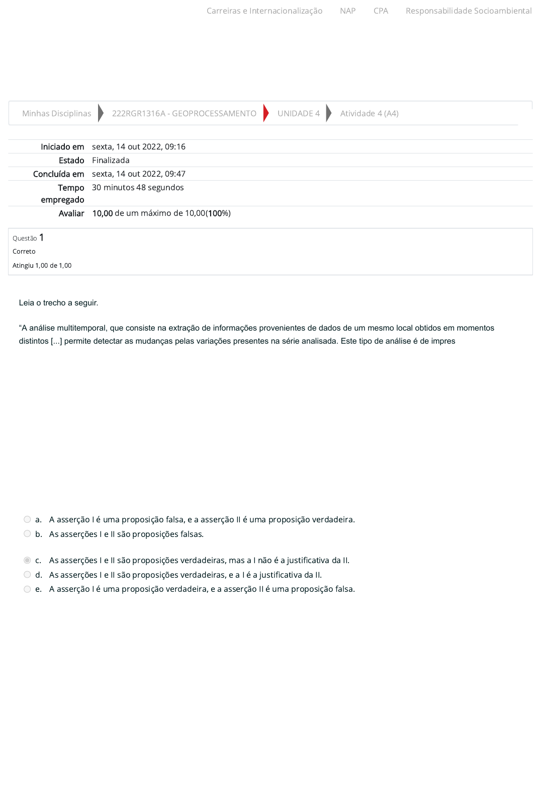 Minhas Disciplinas 222RGR1316A - GEOPROCESSAMENTO UNIDADE 4 Atividade 4 (A4) Iniciado em sexta, 14 out 2022, 09:16 Estado Finalizada Concluída em sexta, 14 out 2022, 09:47 Tempo empregado 30 minutos 48 segundos Avaliar 10,00 de um máximo de 10,00(100%) Questão 1 Correto Atingiu 1,00 de 1,00 Leia o trecho a seguir. “A análise multitemporal, que consiste na extração de informações provenientes de dados de um mesmo local obtidos em momentos distintos [...] permite detectar as mudanças pelas variações presentes na série analisada. Este tipo de análise é de imprescindível importância para monitorar áreas desflorestadas [...] ou acompanhar a ocupação de terrenos [...]”. GOMES-LOEBMANN, D. et al. Análise multitemporal do uso da terra por sensoriamento remoto para as diferentes unidades pedológicas da bacia do rio Jardim, importante produtora agrícola do Distrito Federal. Geosul, [s. l.], v. 20, ed. 39, p. 83-103, jan./jun. 2005. A partir do apresentado, analise as asserções a seguir e a relação proposta entre elas. I. O fenômeno estudado na área selecionada define qual a resolução temporal será a mais adequada à série de dados analisada. Pois: II. A análise de uma mesma área em diferentes tempos pode ser utilizada como base para modelos que preveem comportamentos futuros. A seguir, assinale a alternativa correta. a. A asserção I é uma proposição falsa, e a asserção II é uma proposição verdadeira. b. As asserções I e II são proposições falsas. c. As asserções I e II são proposições verdadeiras, mas a I não é a justi�cativa da II. d. As asserções I e II são proposições verdadeiras, e a I é a justi�cativa da II. e. A asserção I é uma proposição verdadeira, e a asserção II é uma proposição falsa. Carreiras e Internacionalização NAP CPA Responsabilidade Socioambiental https://ambienteacademico.com.br/my/ https://ambienteacademico.com.br/course/view.php?id=18058 https://ambienteacademico.com.br/course/view.php?id=18058§ion=5 https://ambienteacademico.com.br/mod/quiz/view.php?id=495134 https://informa.fmu.br/carreiras/ https://codely-fmu-content.s3.amazonaws.com/Moodle/NAP/inicial/nap/fmu/index.html https://codely-fmu-content.s3.amazonaws.com/Moodle/CPA/landing_CPA/index.html https://portal.fmu.br/sustentabilidade Questão 2 Correto Atingiu 1,00 de 1,00 Questão 3 Correto Atingiu 1,00 de 1,00 Leia o excerto a seguir. “[...] Resumidamente, um banco de dados geográficos é aquele que tem a capacidade de armazenar dados geográficos, além dos dados convencionais ou alfanuméricos. [...] E um sistema de gerenciamento de bancos de dados (SGBD) é um software que tem como objetivo auxiliar os desenvolvedores na criação e manutenção dos seus bancos de dados específicos”. OLIVERA, H. V. Uma arquitetura de integração de dados espaciais: um estudo dos dados de solos e Folhas dos biomas brasileiros. Brasília: UnB, 2013. p. 9. Assinale a alternativa que indica qual das afirmações é correta em relação à interpretação. a. Um SGBD é um tipo de banco de dados geográ�cos. b. Um SGBD não é capaz de operações de avaliação de consistência de dados. c. O georreferenciamento prévio de arquivos é necessário para um SGBD. d. Um SGBD apresenta um único modelo para múltiplos tipos de dados. e. A linguagem de consulta dos SGBDs é convencionada em operações lógicas. Leia o excerto a seguir. “No nível mais básico, os pontos [...] podem representar uma ampla variedade de fenômenos espaciais, como casos de doenças. [...]. Os efeitos de primeira ordem estão relacionados variação do valor médio do processo (tendência de larga escala), enquanto o segundo efeitos de ordem resultam da estrutura de correlação espacial ou da dependência espacial no processo”. FISCHER, M. M. Spatial analysis and GeoComputation: selected essays. [S. l.]: 2006, 2006. p. 21. Assinale a alternativa que indica qual das afirmações é correta em relação aos diferentes tipos de dados na análise espacial. a. Em uma análise de áreas, há homogeneidade de dados nos polígonos construídos no território. b. Quando se analisam padrões de pontos, é importante medir a área do evento representado pelo ponto. c. Os dados coletados não devem apresentar variabilidade espacial para que se possa aplicar a análise de superfícies adequadamente. d. Não se pode utilizar interpolação para construir o polígono na análise de superfícies. Só podem ser usados os dados amostrais. e. Os valores de cada ponto geralmente são o objeto de estudo quando se analisa os padrões de pontos. Carreiras e Internacionalização NAP CPA Responsabilidade Socioambiental https://informa.fmu.br/carreiras/ https://codely-fmu-content.s3.amazonaws.com/Moodle/NAP/inicial/nap/fmu/index.html https://codely-fmu-content.s3.amazonaws.com/Moodle/CPA/landing_CPA/index.html https://portal.fmu.br/sustentabilidade Questão 4 Correto Atingiu 1,00 de 1,00 Analise a figura a seguir. Fonte: Elaborada pelo autor. Na figura, está representado um rio em uma propriedade rural plana com uma área de preservação permanente (APP) em torno do curso- d’água. Cada quadrícula da imagem tem dimensões de 50 x 50m e seu uso está representado na legenda ao lado da malha, sendo o curso- d’água representado pela linha de maior espessura. Considerando a figura apresentada, sobre a delimitação de áreas de proteção permanente, analise as afirmativas a seguir e a relação proposta entre elas. I. Nessa propriedade, a APP ocupa uma área de 4000 m². Portanto: II. Essa APP é aceitável para cursos-d’água de largura inferior a 50 m. A seguir, assinale a alternativa correta. a. As asserções I e II são proposições falsas. b. A asserção I é uma proposição verdadeira, e a asserção II é uma proposição falsa. c. As asserções I e II são proposições verdadeiras, e a I é a justi�cativa da II. d. A asserção I é uma proposição falsa, e a asserçã